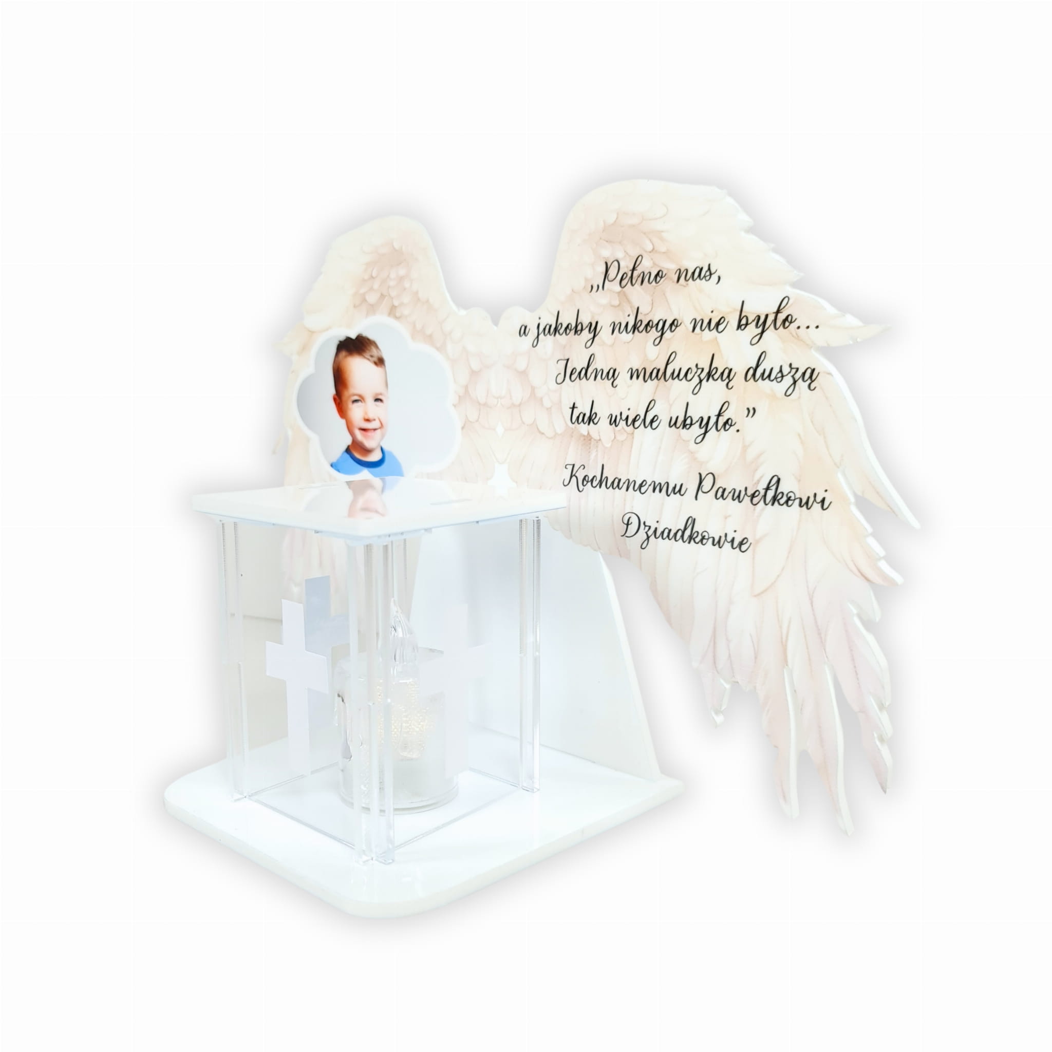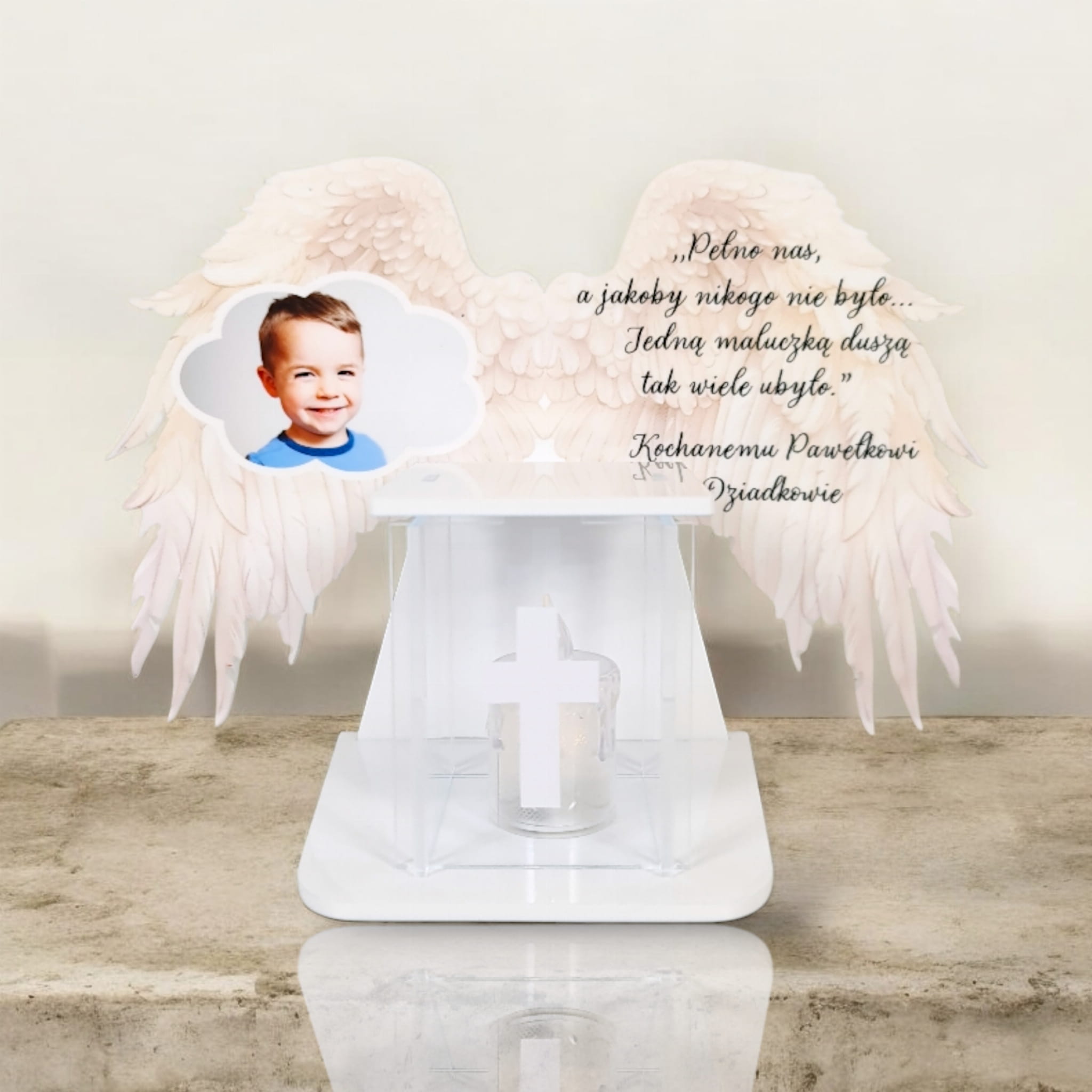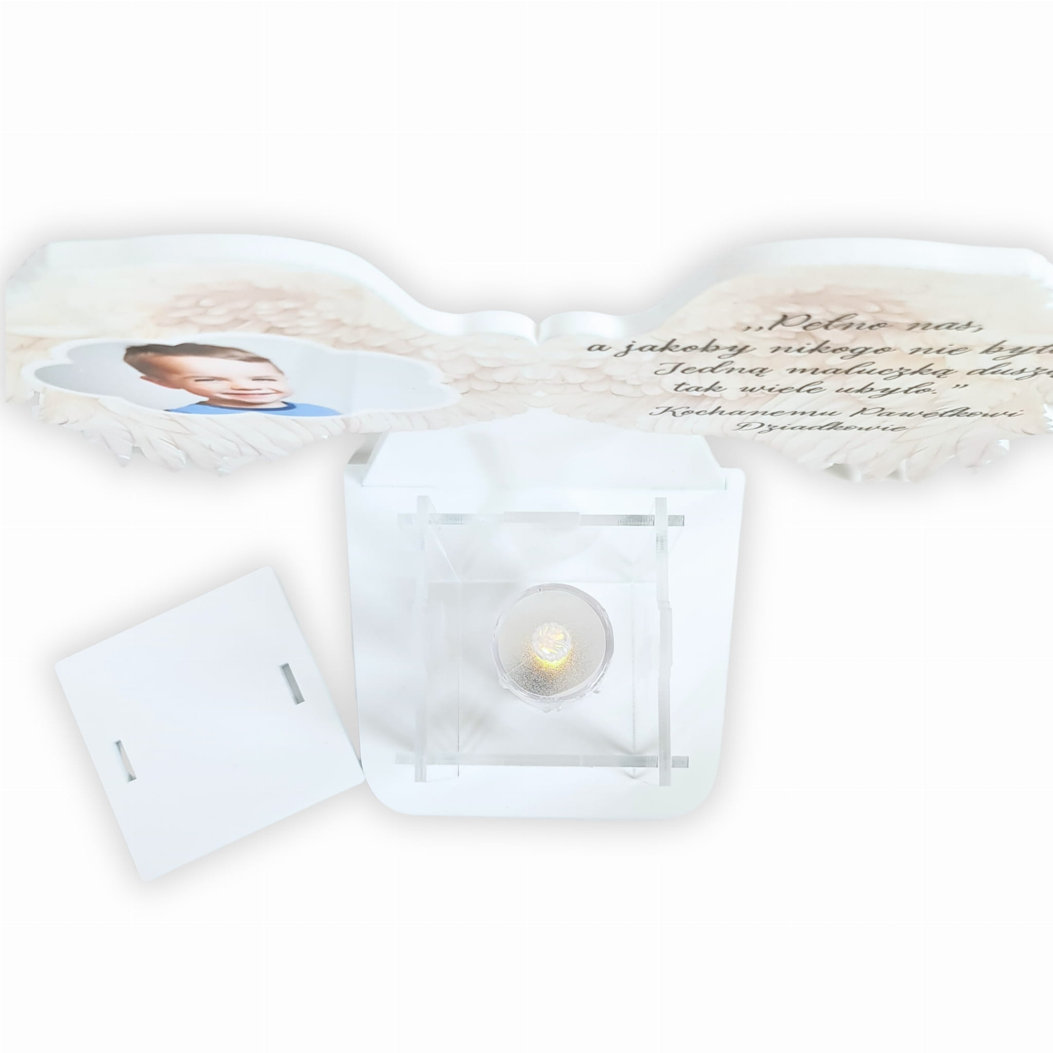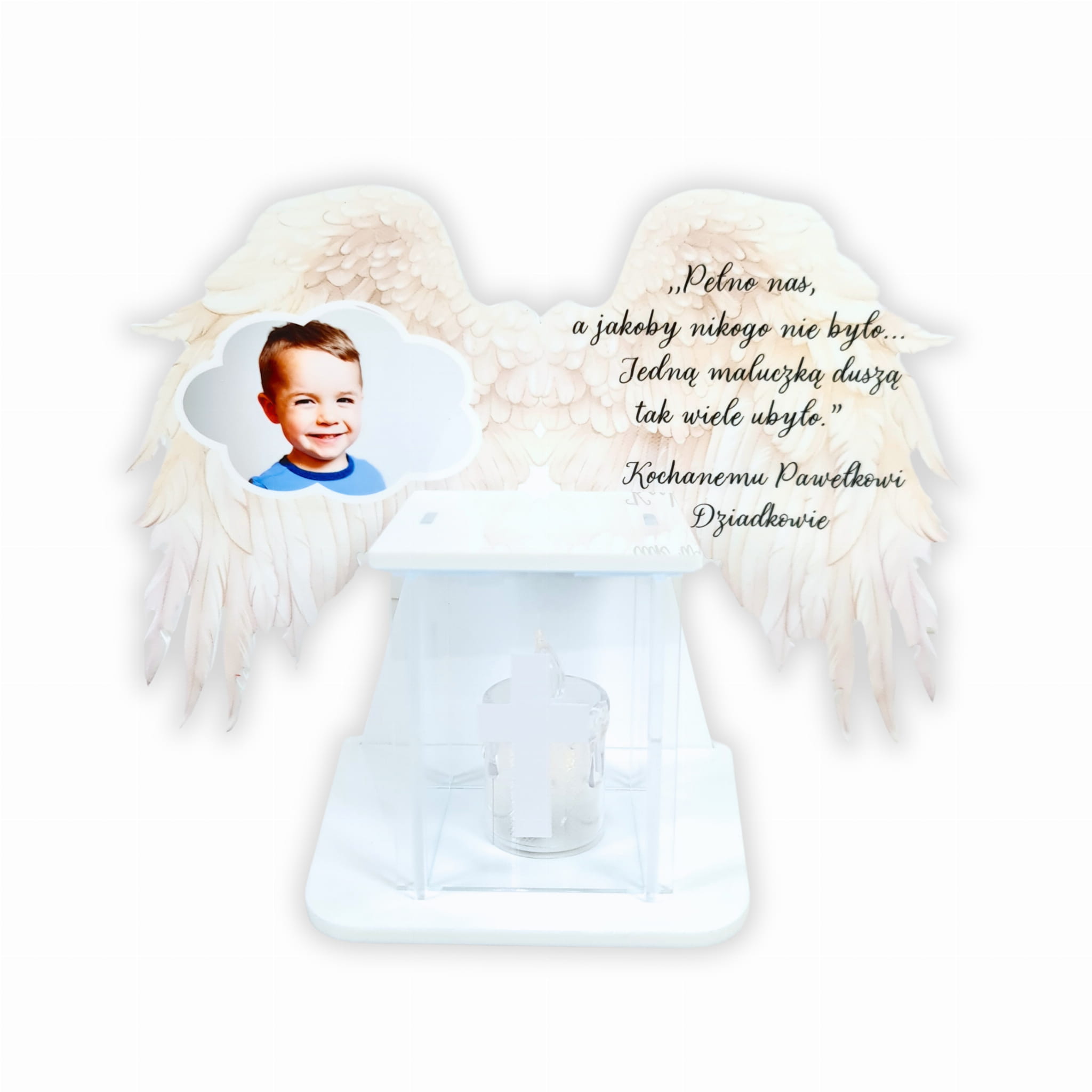 Aniołek z dedykacją i zdjęciem - znicz na cmentarz dla dziecka