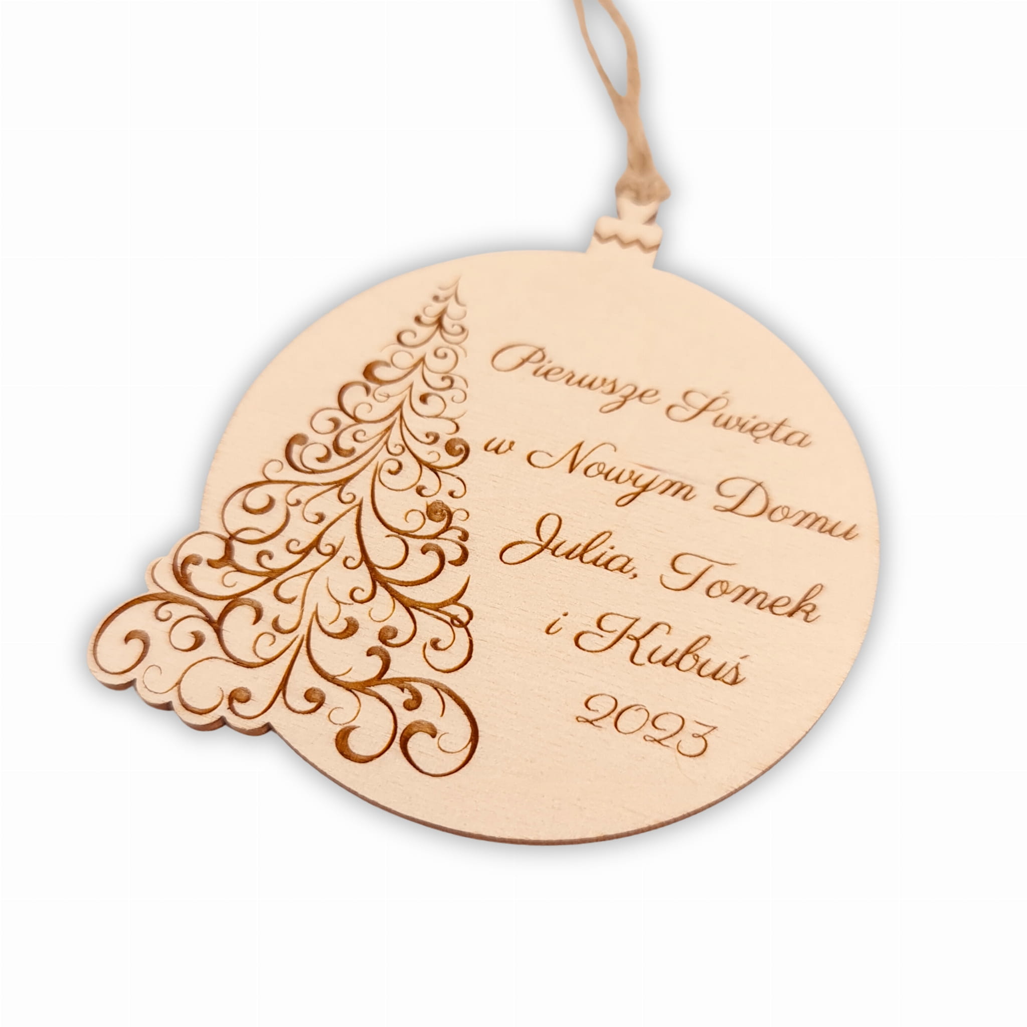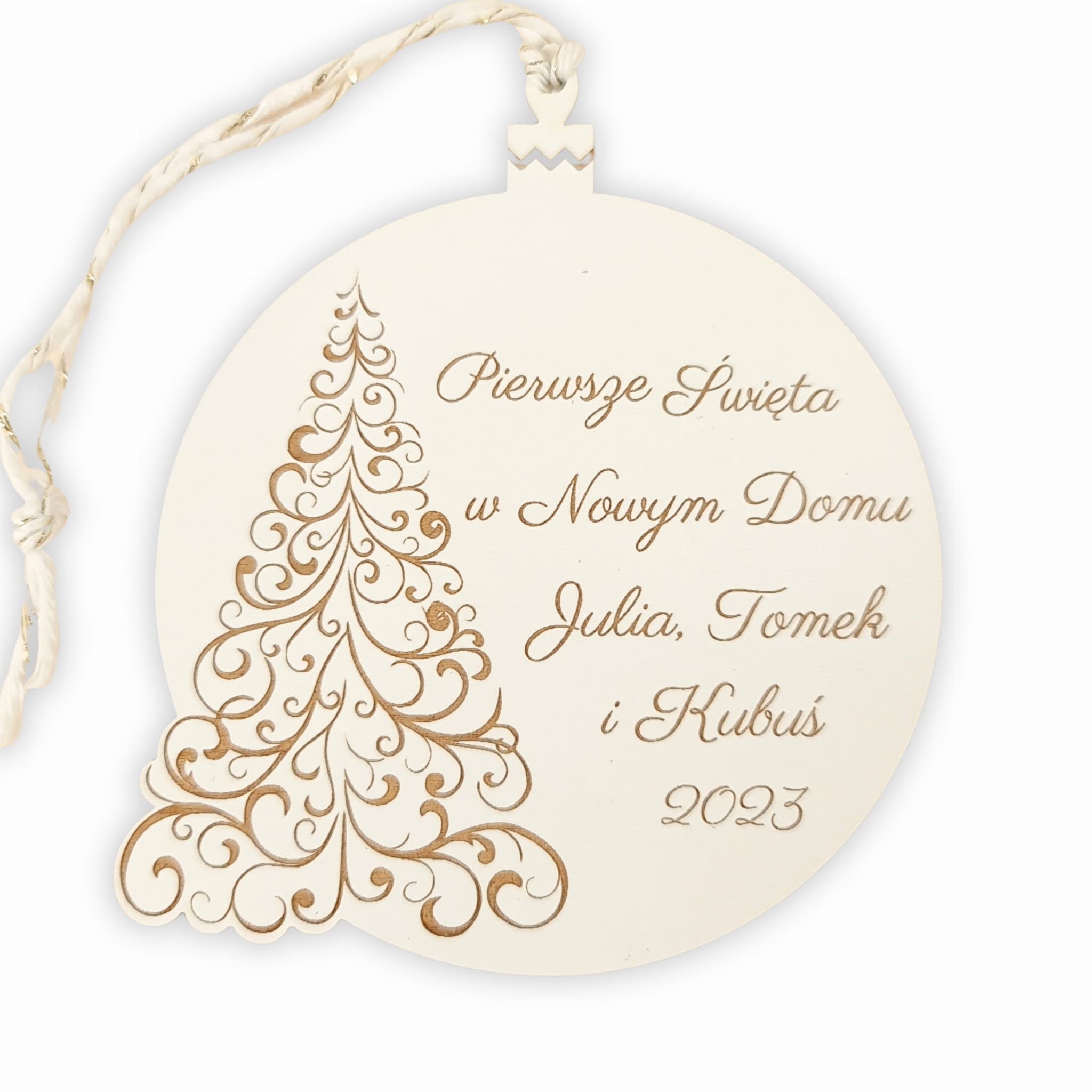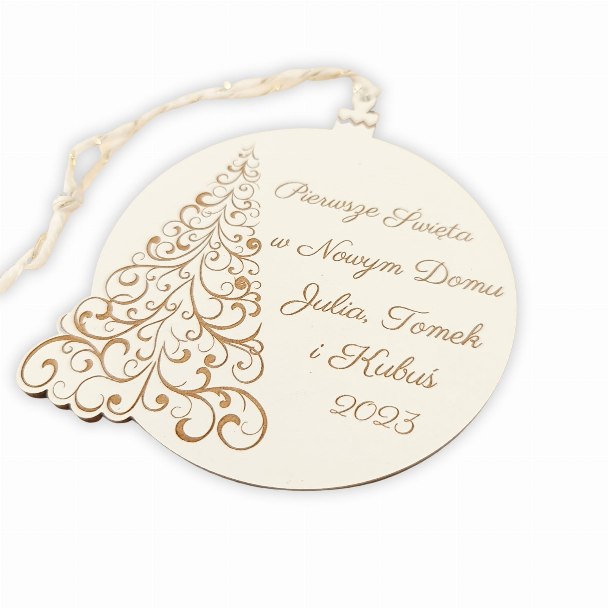 Zawieszka na choinkę podkreślająca wasze pierwsze Święta w nowym domu to wyjątkowe dopełnienie wystroju świątecznego. Podkreśla ona najważniejsze informacje - imiona domowników oraz dany rok (rok zostanie zmieniony na 2024).