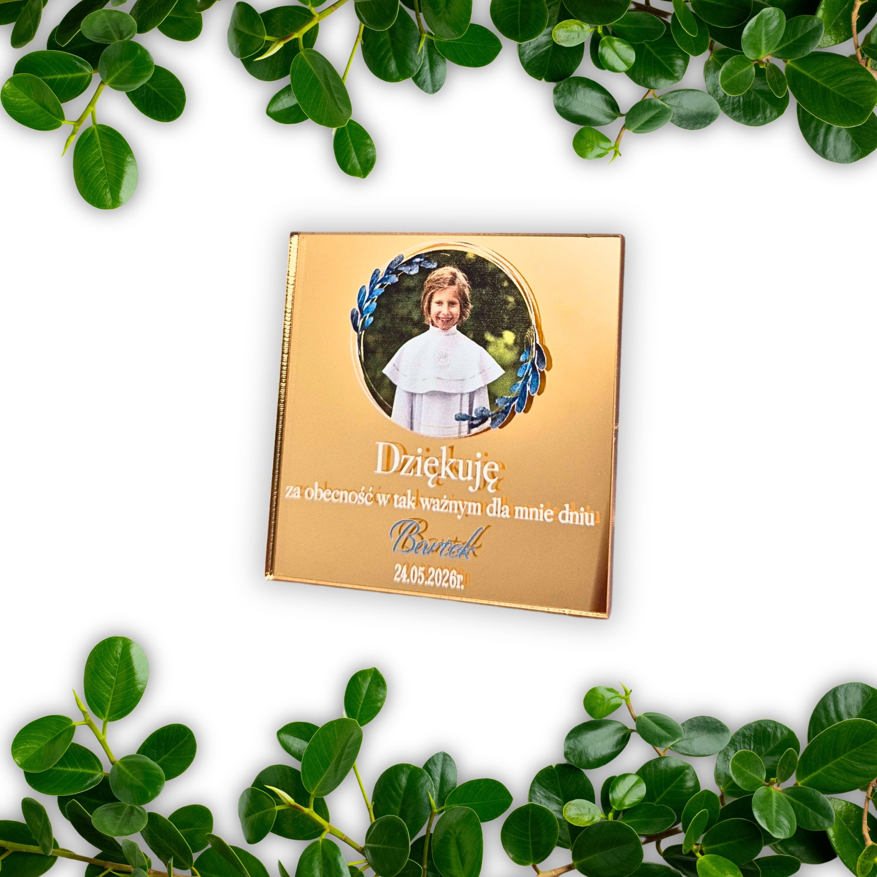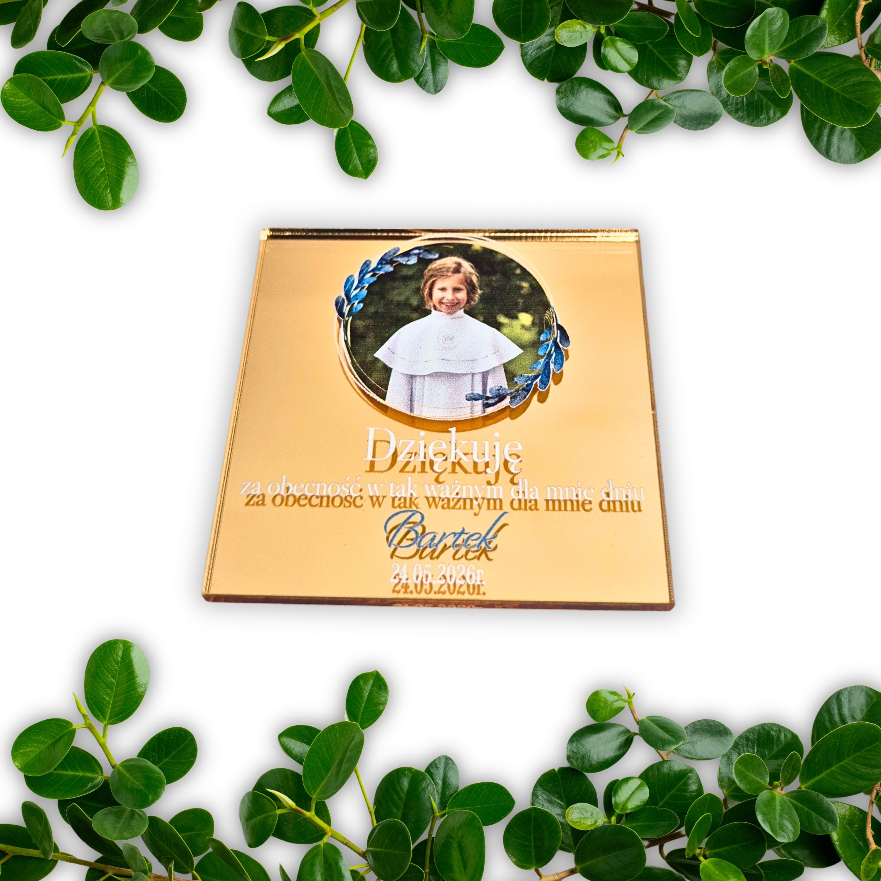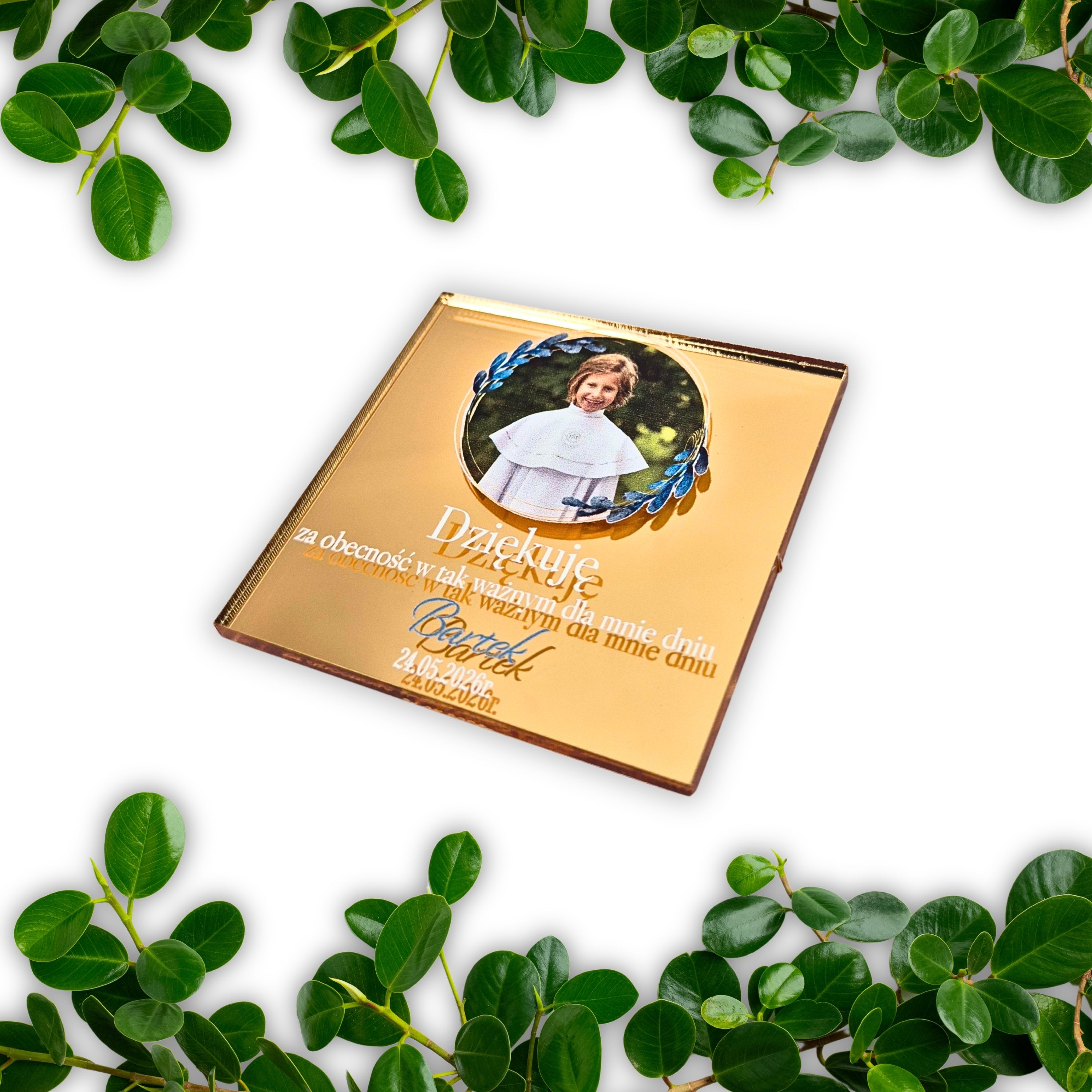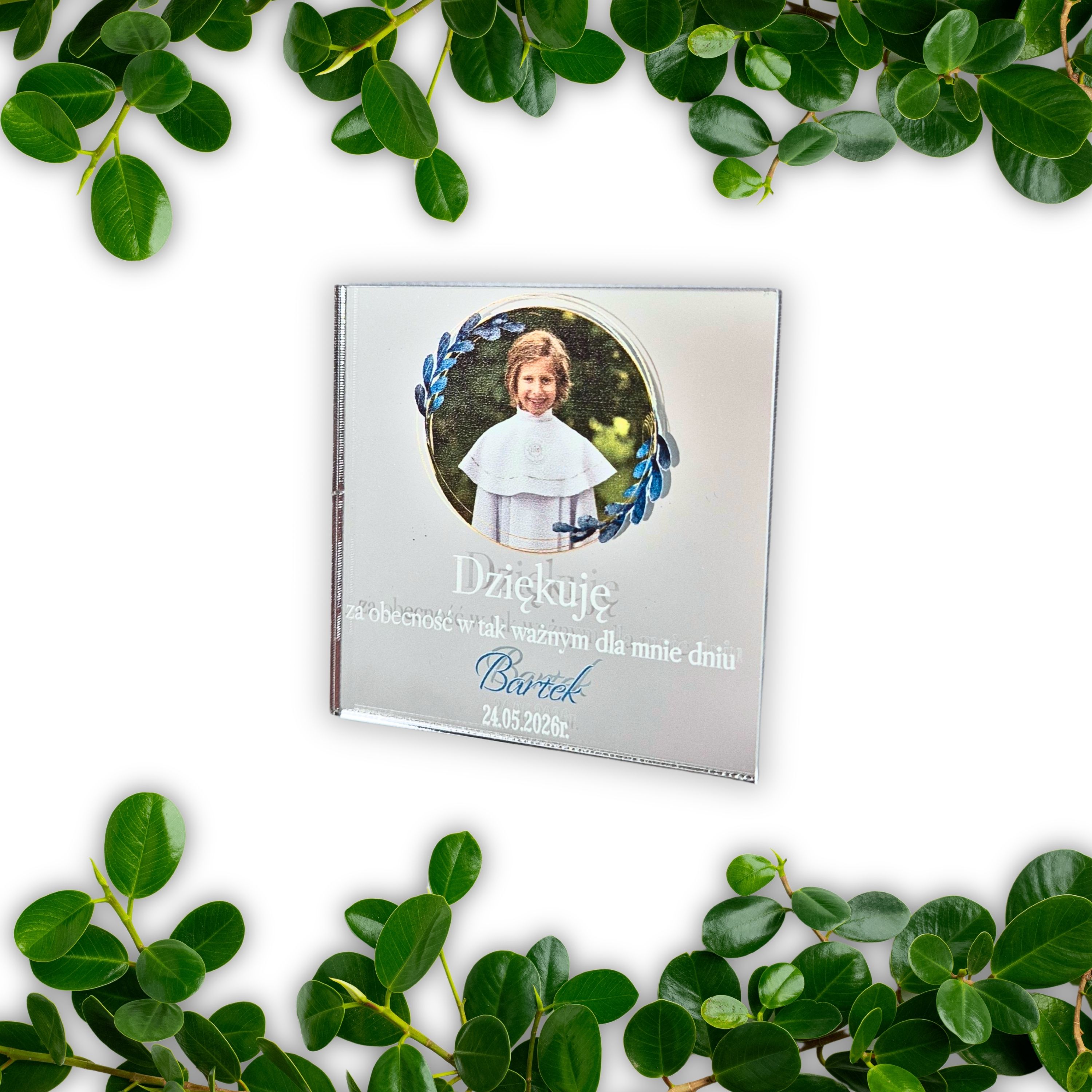 Lustrzany magnes z zdjęciem kwadratowy dla chłopca - podziękowania na Komunię dla gości