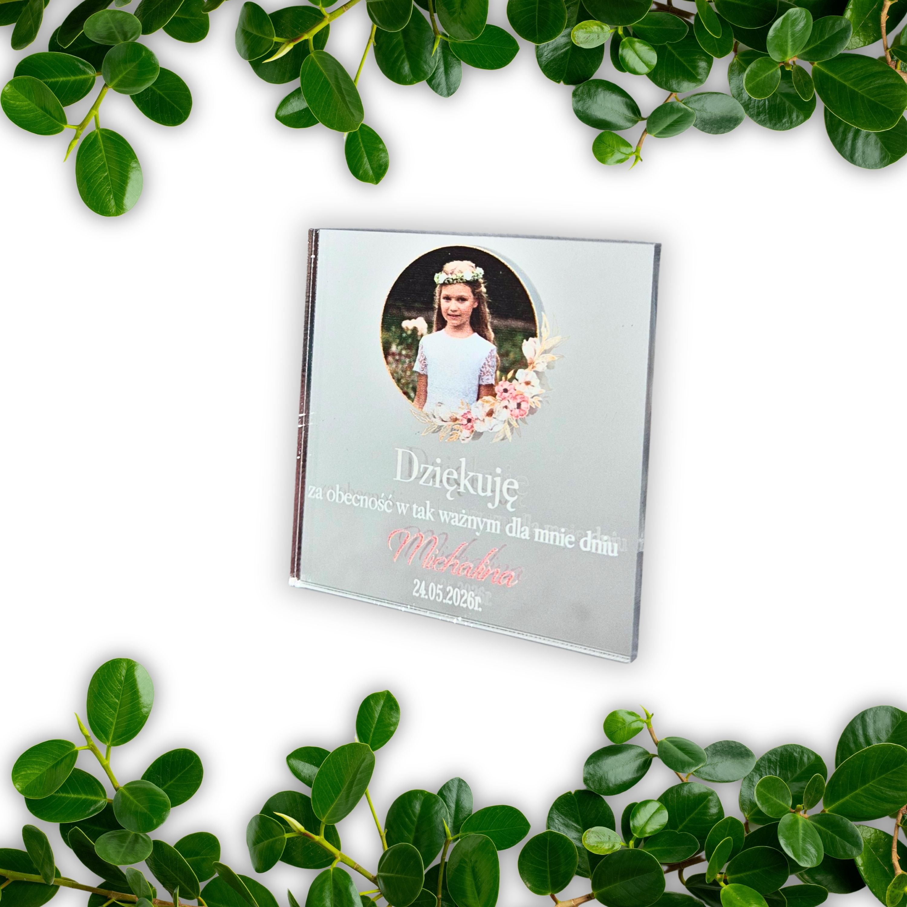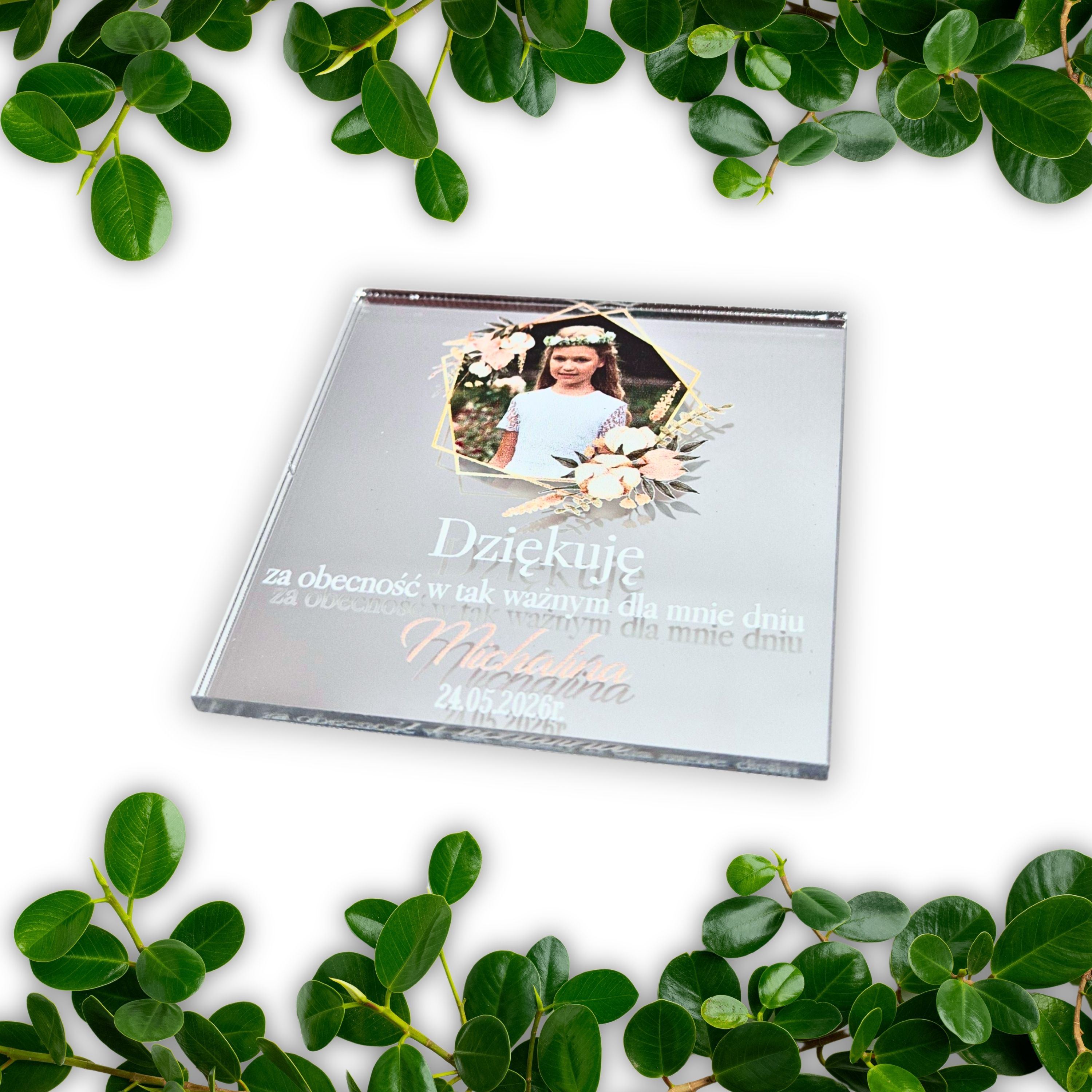 Lustrzany magnes z zdjęciem kwadratowy, dla dziewczynki - podziękowania dla gości komunijnych