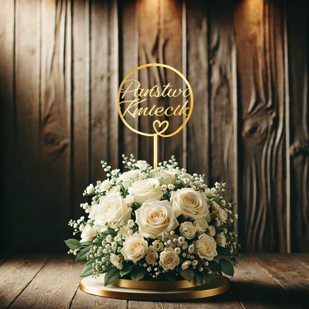 Topper wykonany z lustrzanej płyty PMMA w kolorze złotym lub srebrnym - do wyboru w wariancie wyżej.