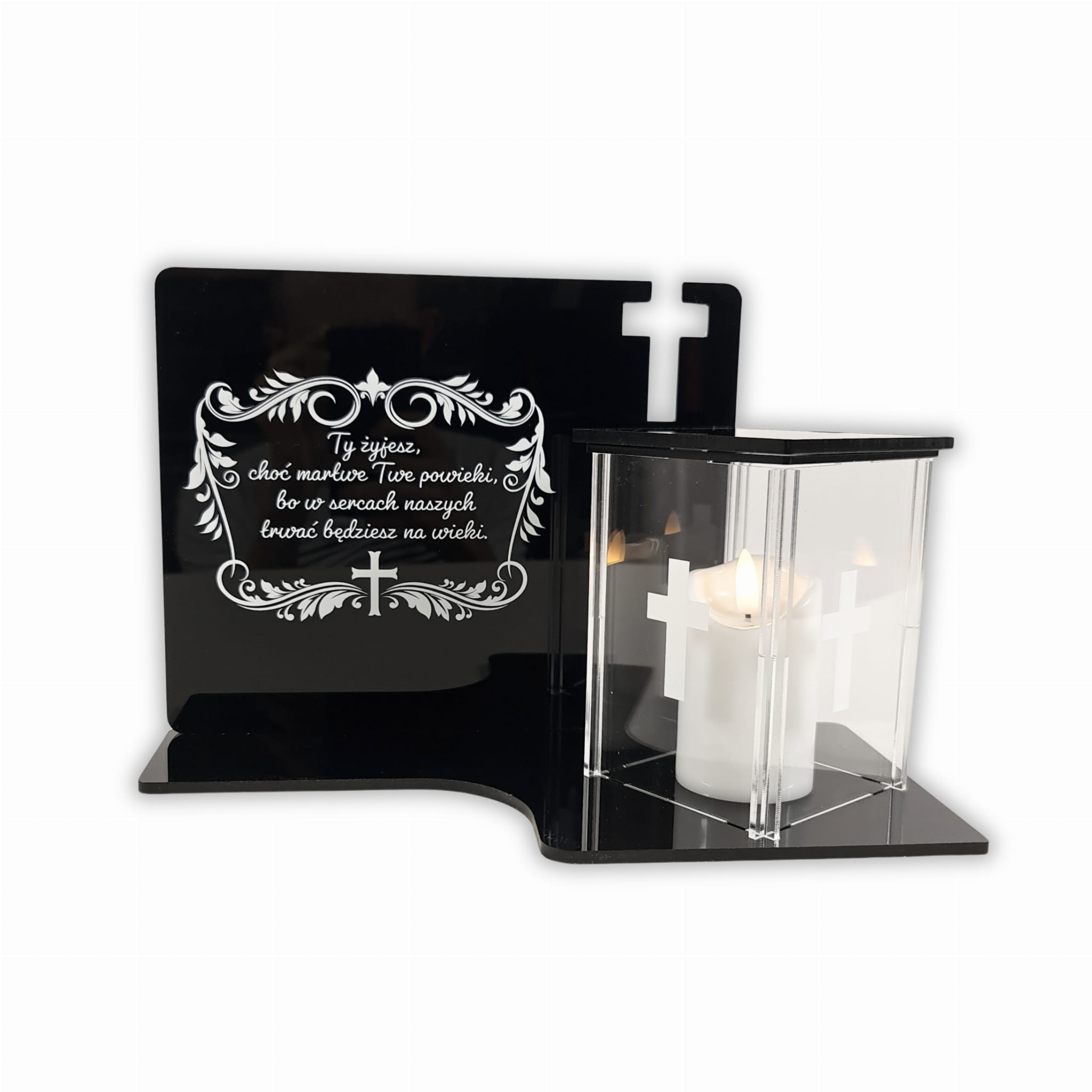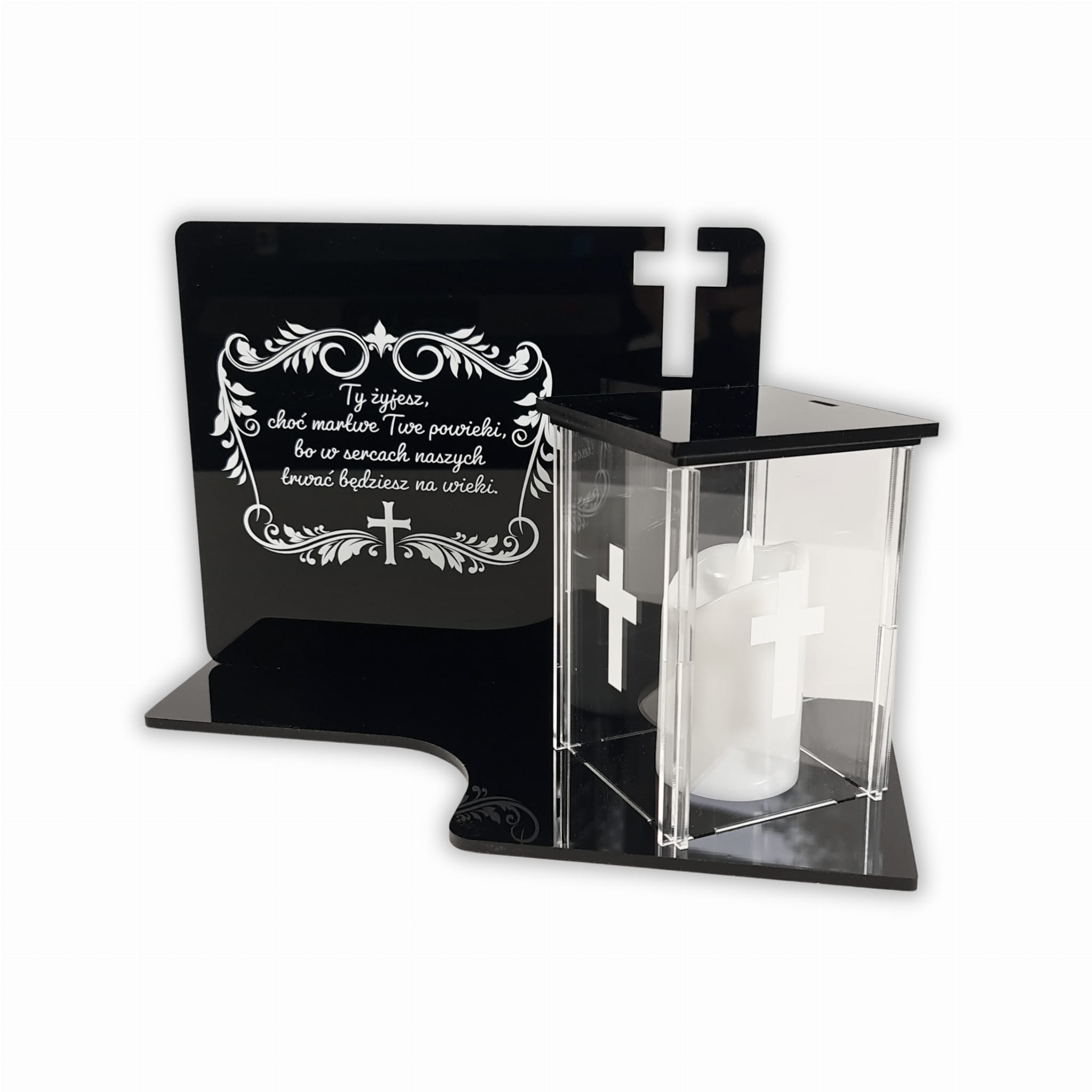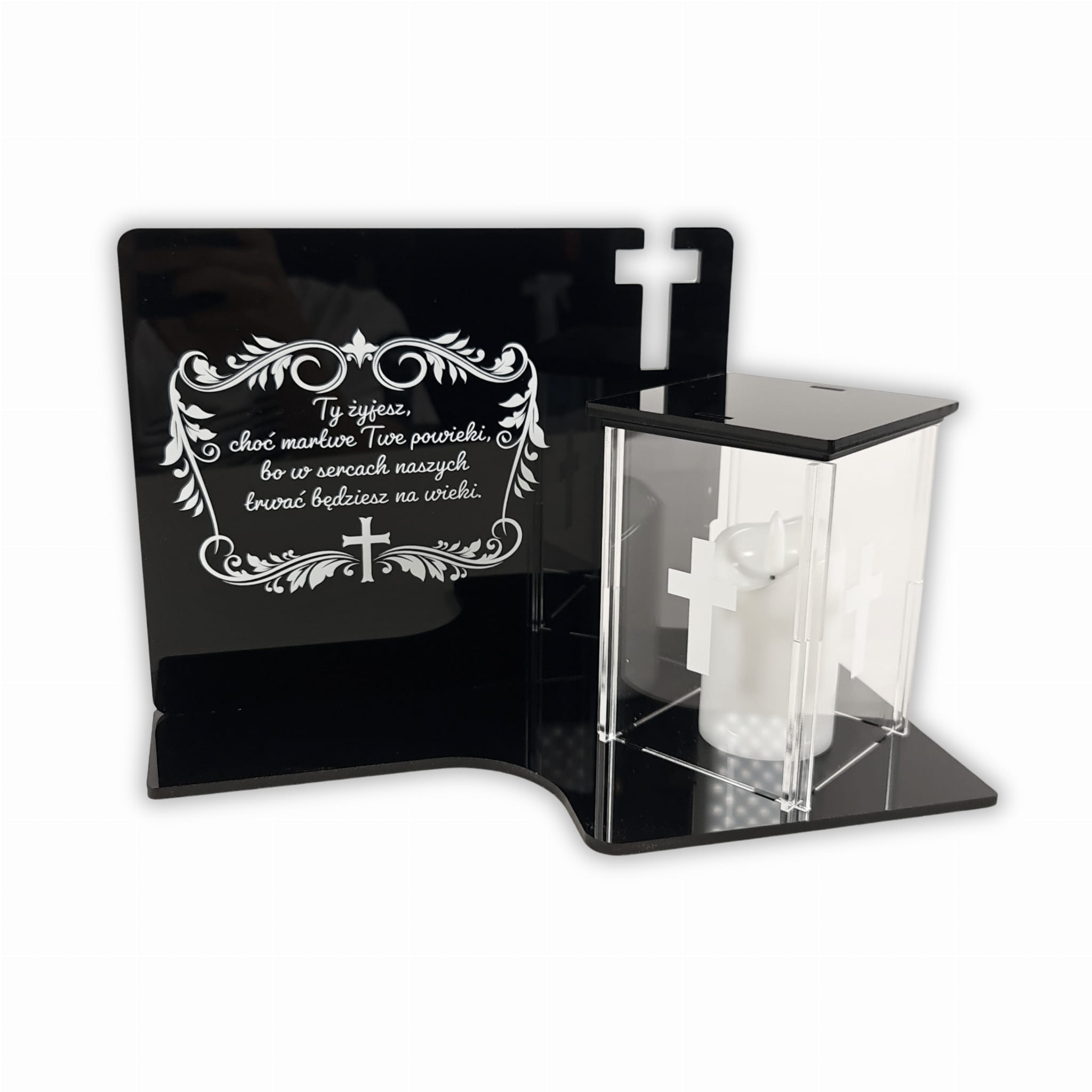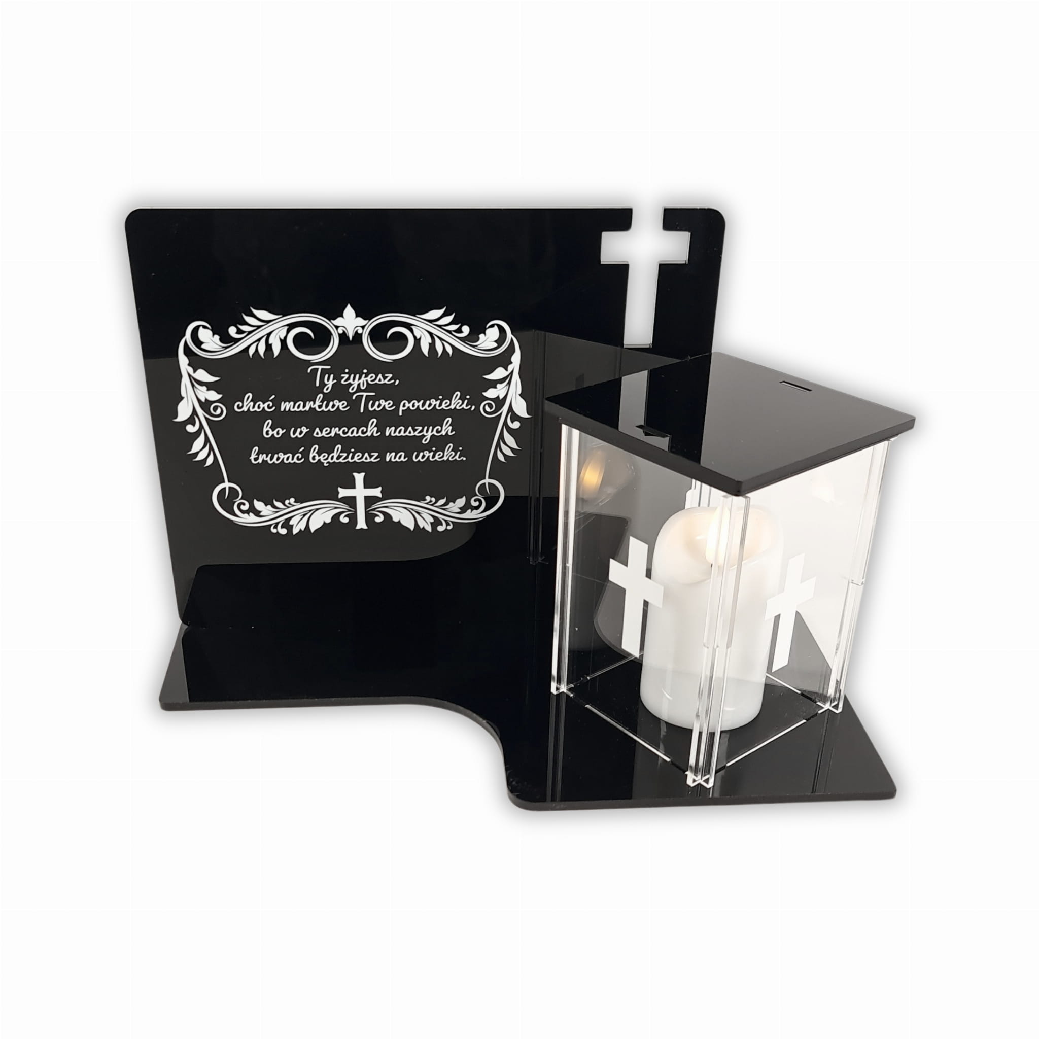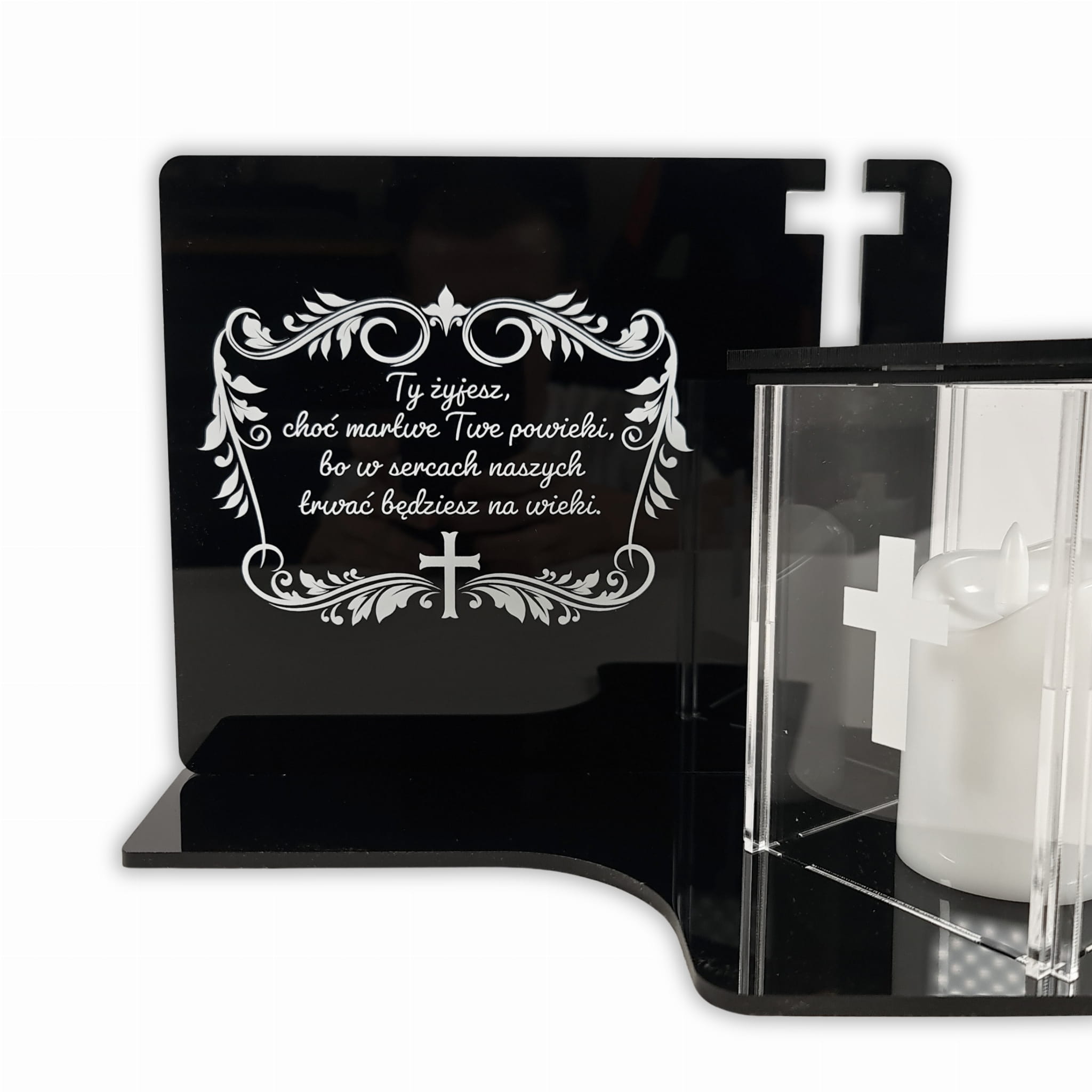Jego podstawa oraz tablica to lśniąca czarna płyta PMMA. Oba elementy łączone są ze sobą na ultra wytrzymały klej dedykowany dla tego rodzaju tworzyw. Klej jest bezbarwny lecz z tyłu oraz przy łączeniach znicza z podstawą może on być widoczny. Bez obaw, dla osób odwiedzających nie będzie on zauważalny. Musimy o tym wspomnieć gdyż nie jest to wadą produktu a rzeczą dzięki której cała konstrukcja jest wytrzymała. Górę przezroczystego znicza możemy otworzyć w celu umieszczenia lampki led - tylko i wyłącznie takie lampki można w nim stosować. Całość można delikatnie umyć ściereczką ale tylko z samą wodą. Nie zalecamy stosować środków chemicznych. Dzięki temu możemy taki znicz odświeżyć i zapewnić mu długowieczność.