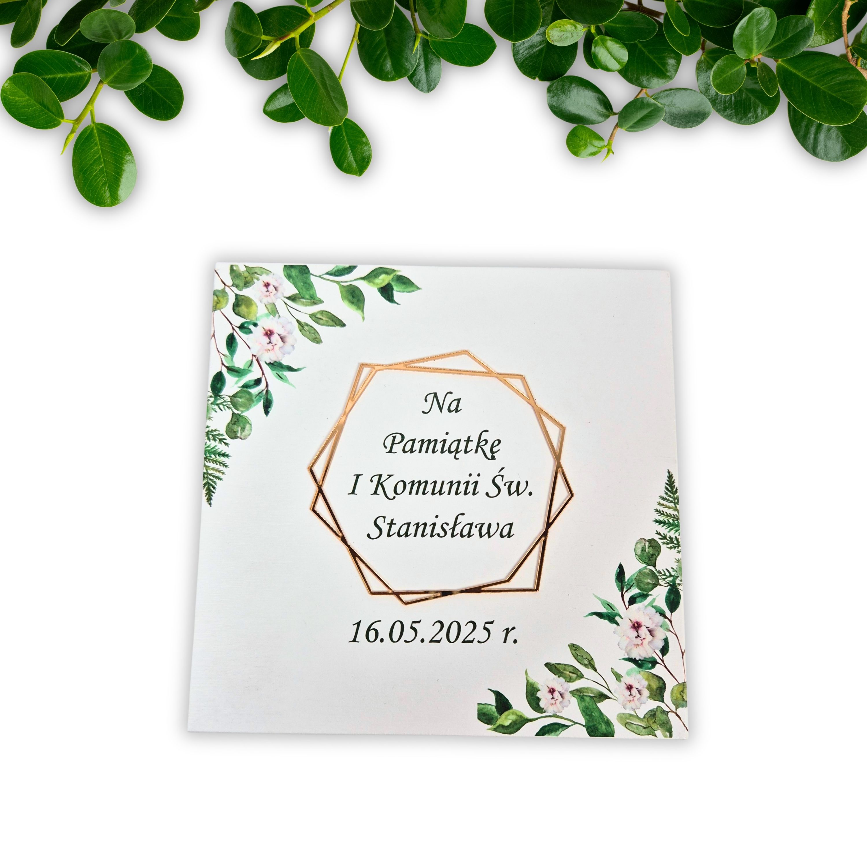 Wieczko: Ozdobione imieniem dziecka oraz datą uroczystości w eleganckiej, złotej ramce geometrycznej