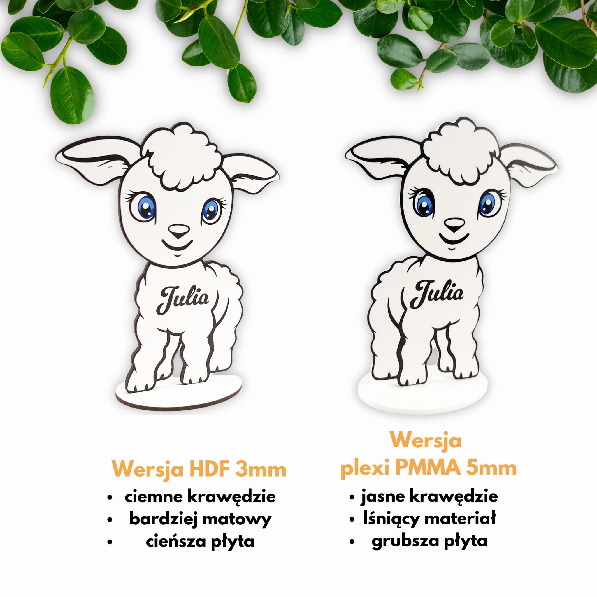 W wersji droższej użyta została biała płyta Plexi PMMA o grubości 5mm, co pozwoliło nam uzyskać bardziej masywny wygląd oraz lśniące wykończenie produktu przy czym krawędzie baranka zostają białe bez przypalenia.