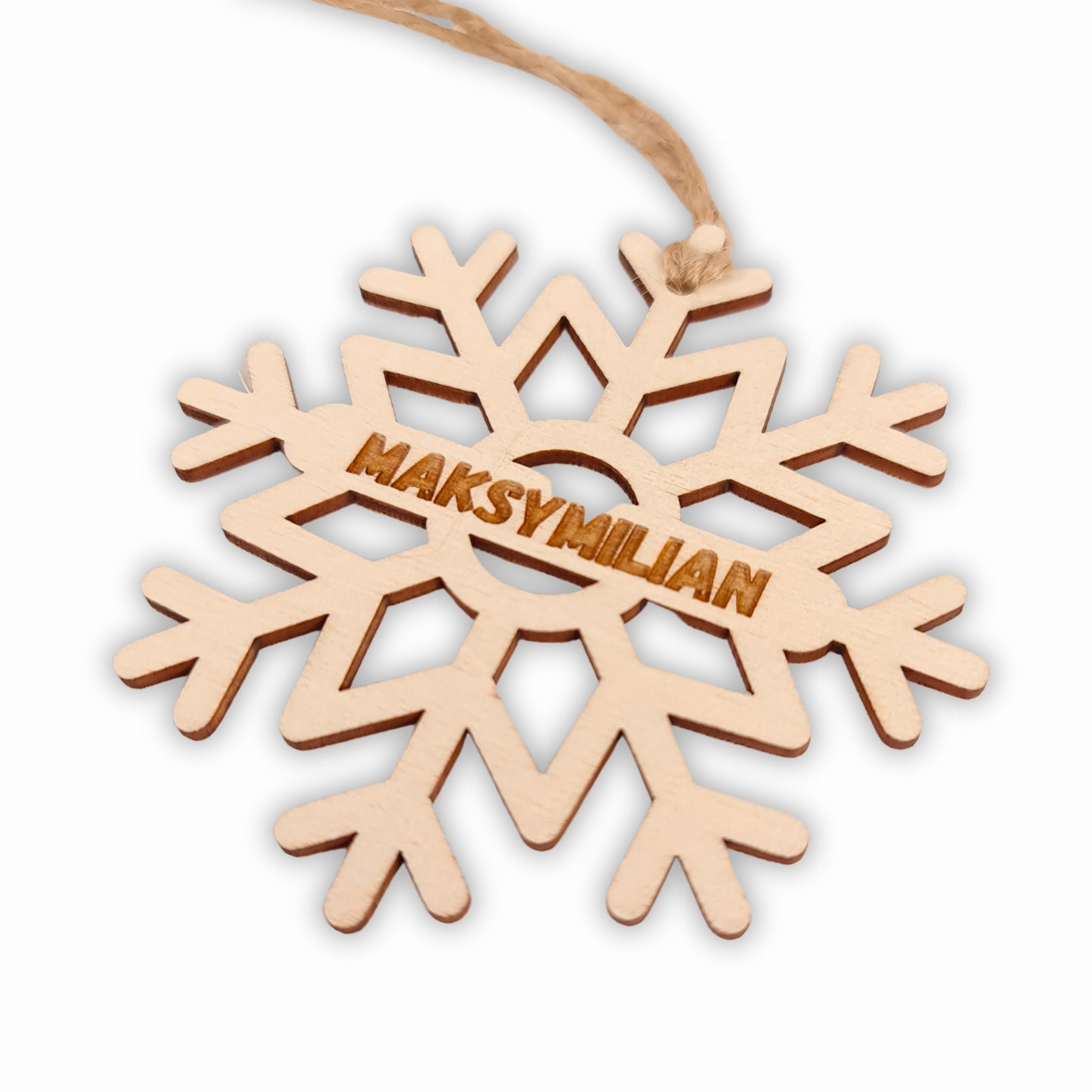 Bombka wycięta została ze sklejki w kształcie śnieżynki, po środku której wygrawerowane jest imię. Świetnym pomysłem jest, by każdy z domowników posiadał bombkę ze swoim imieniem.