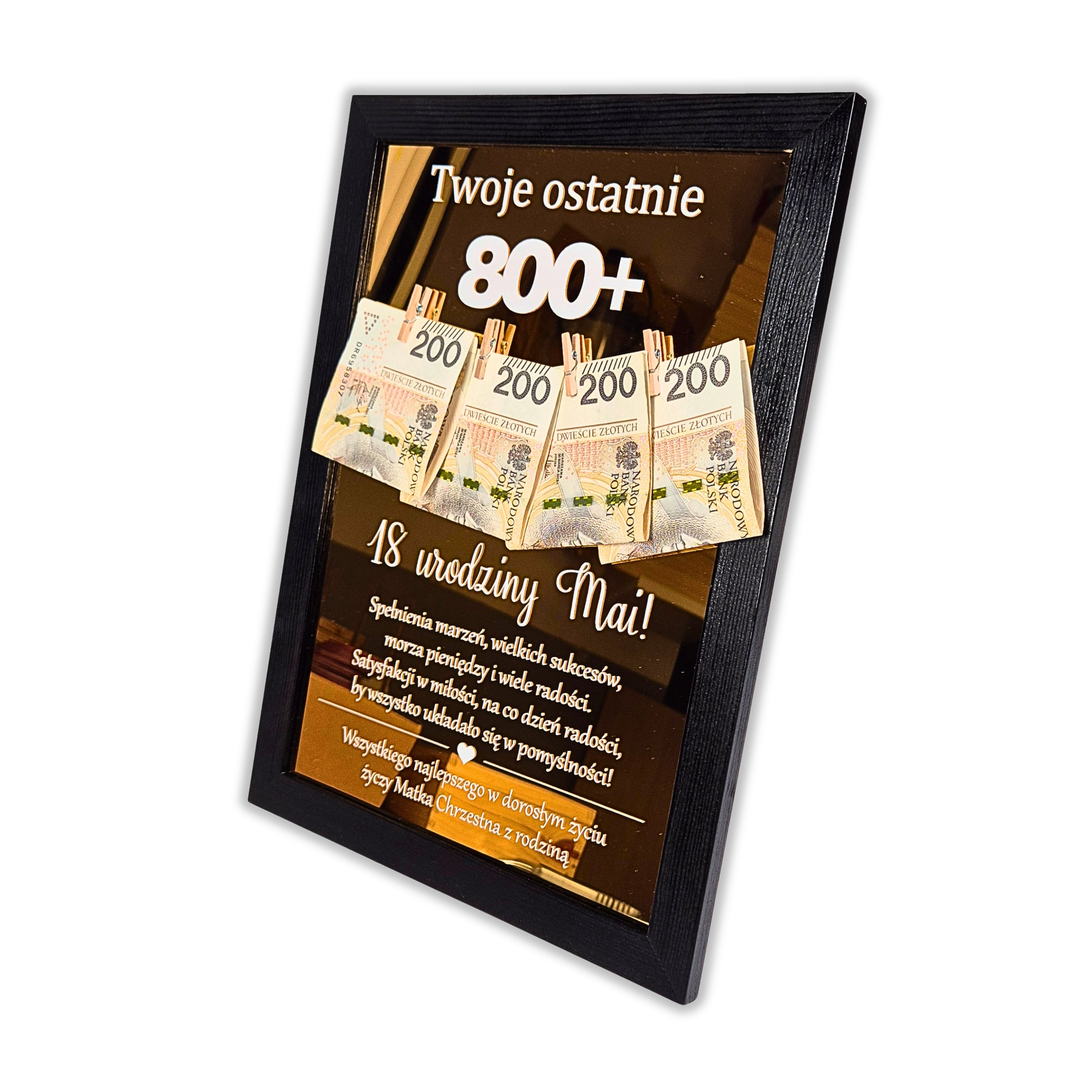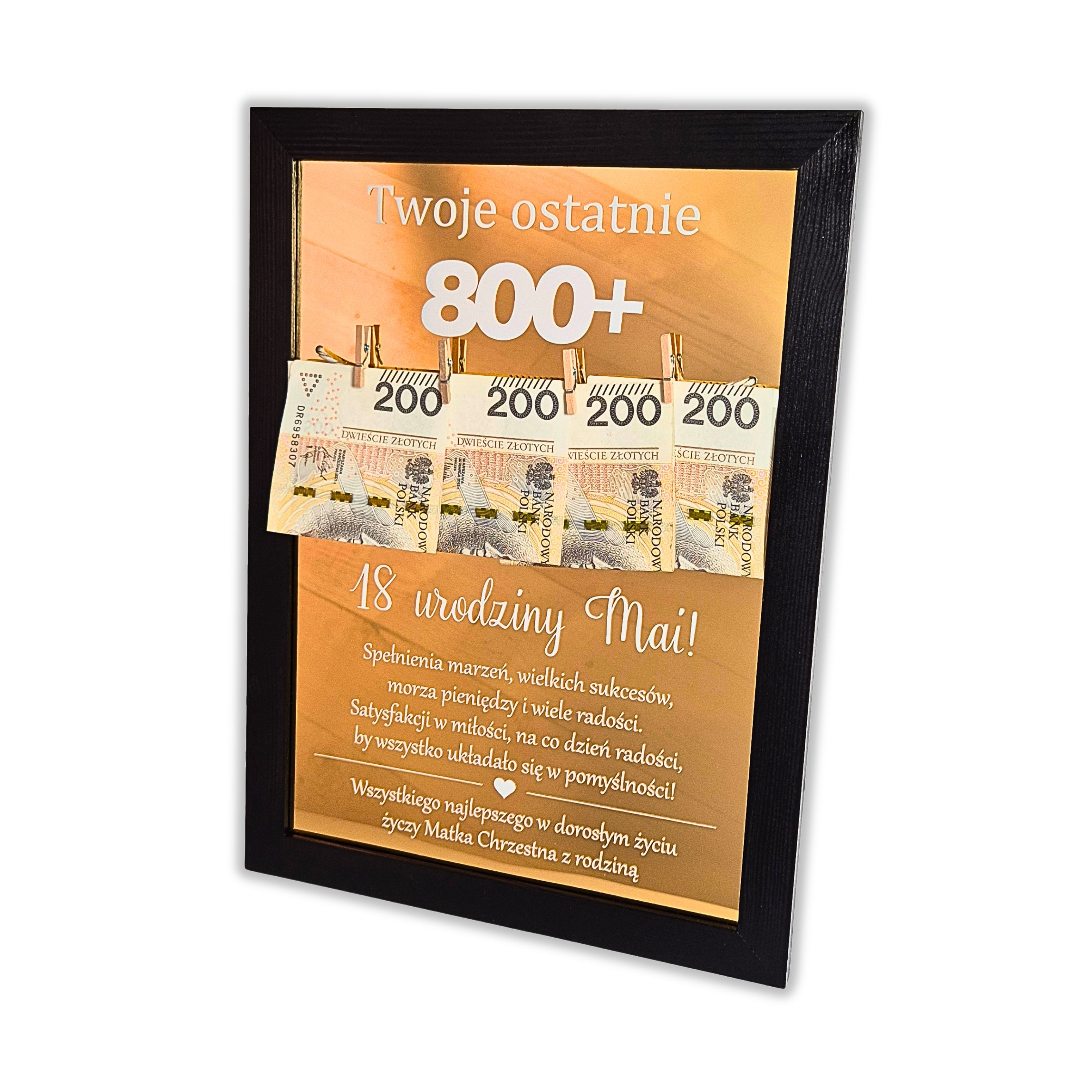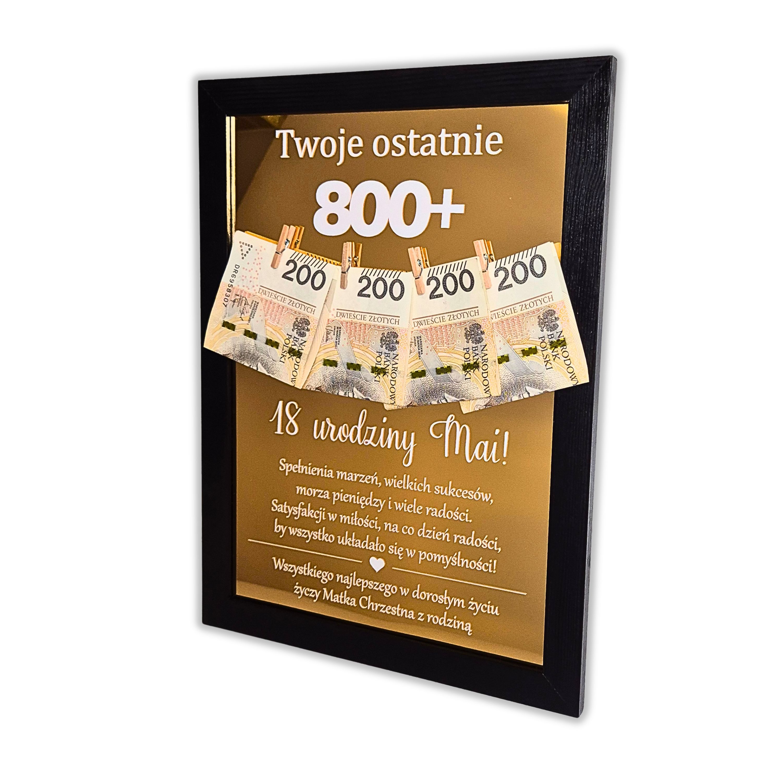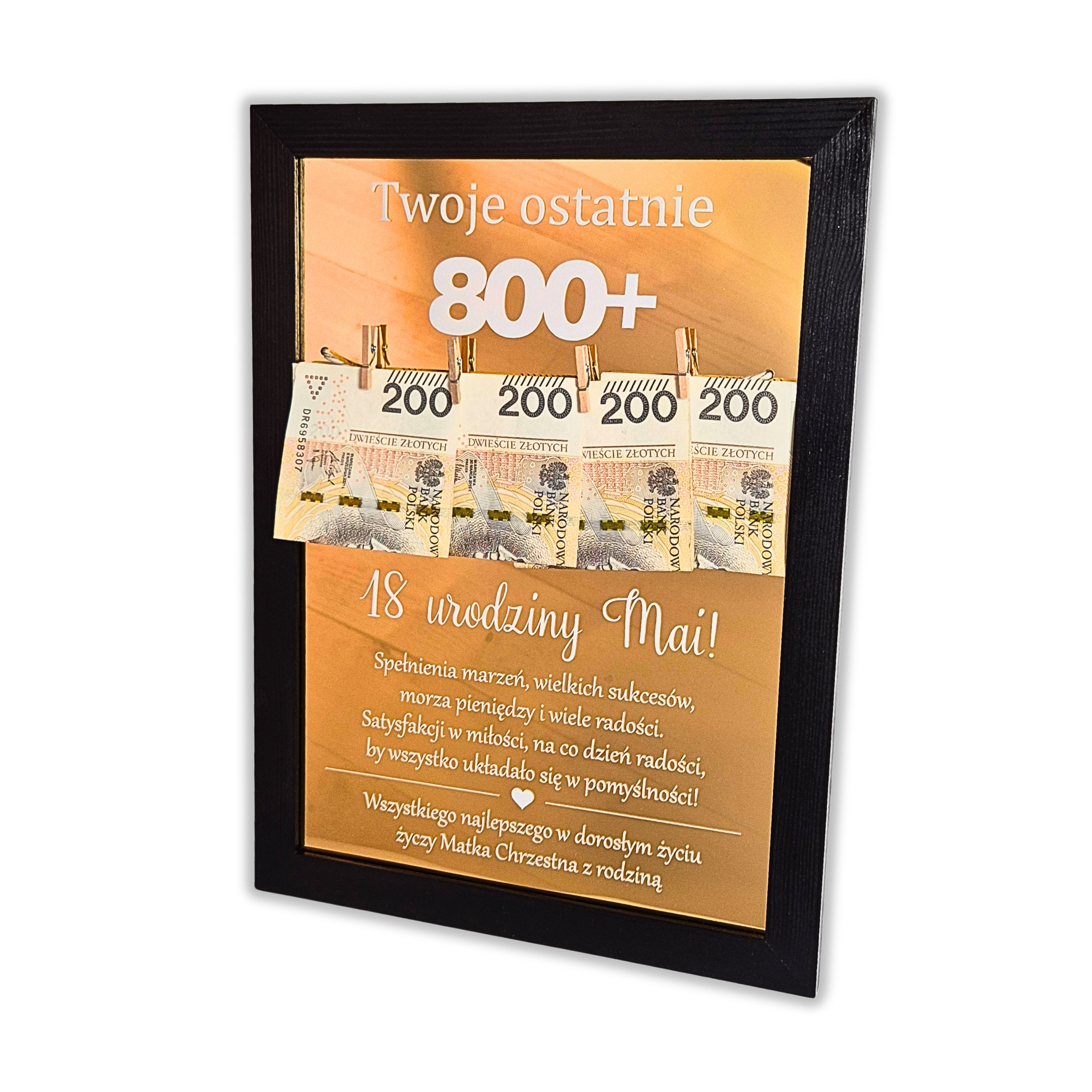 Czarno złota ramka na pieniądze „Twoje ostatnie 800+” – personalizowany prezent na 18 urodziny