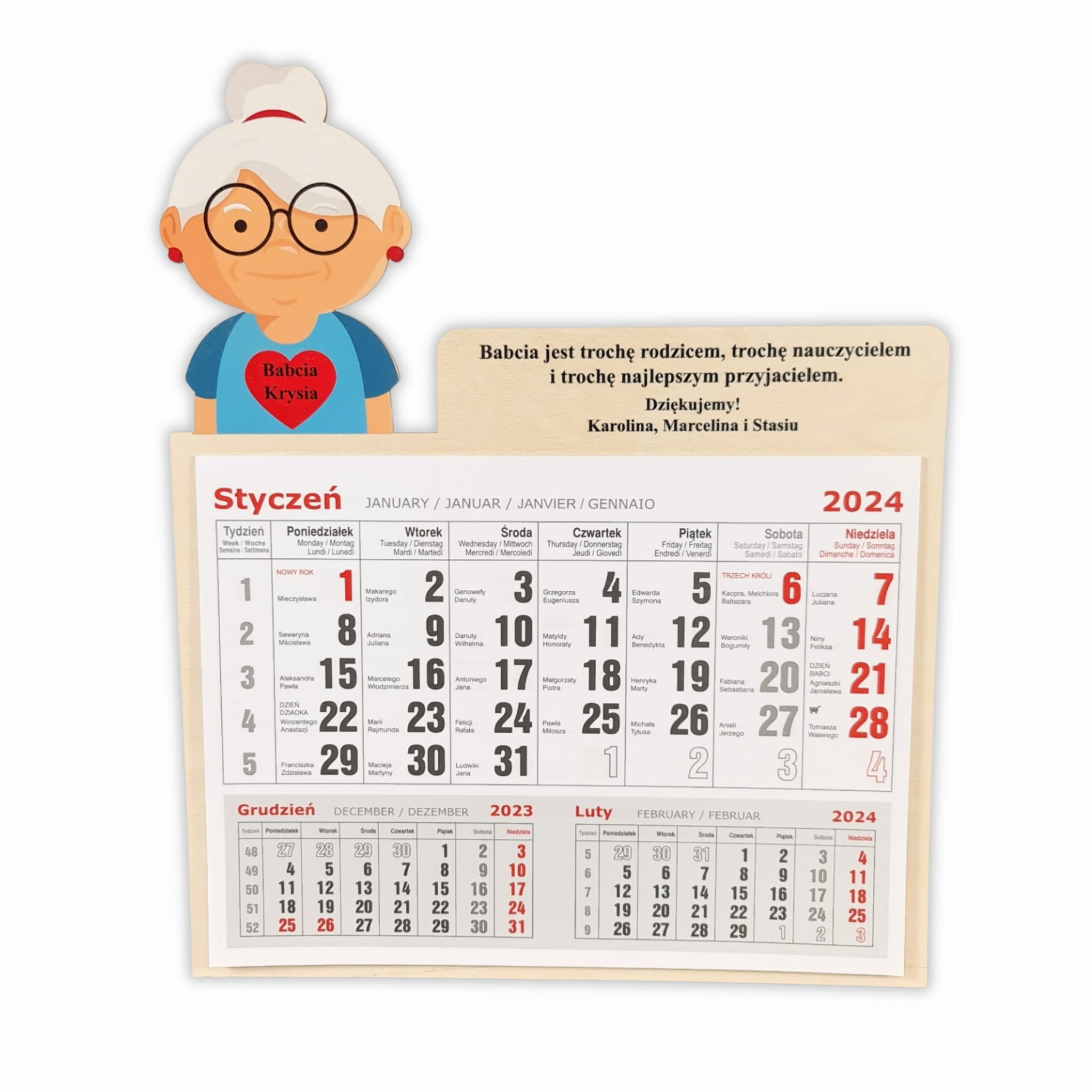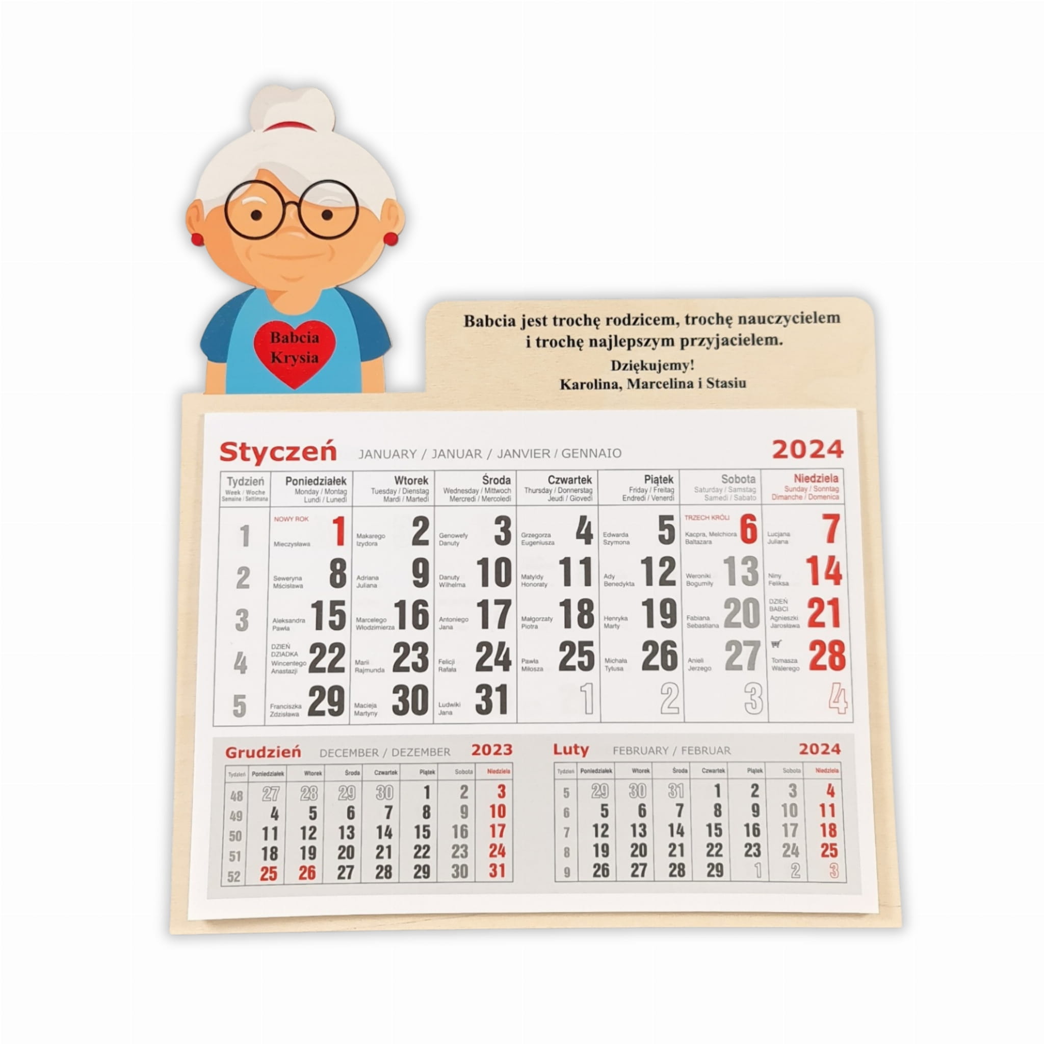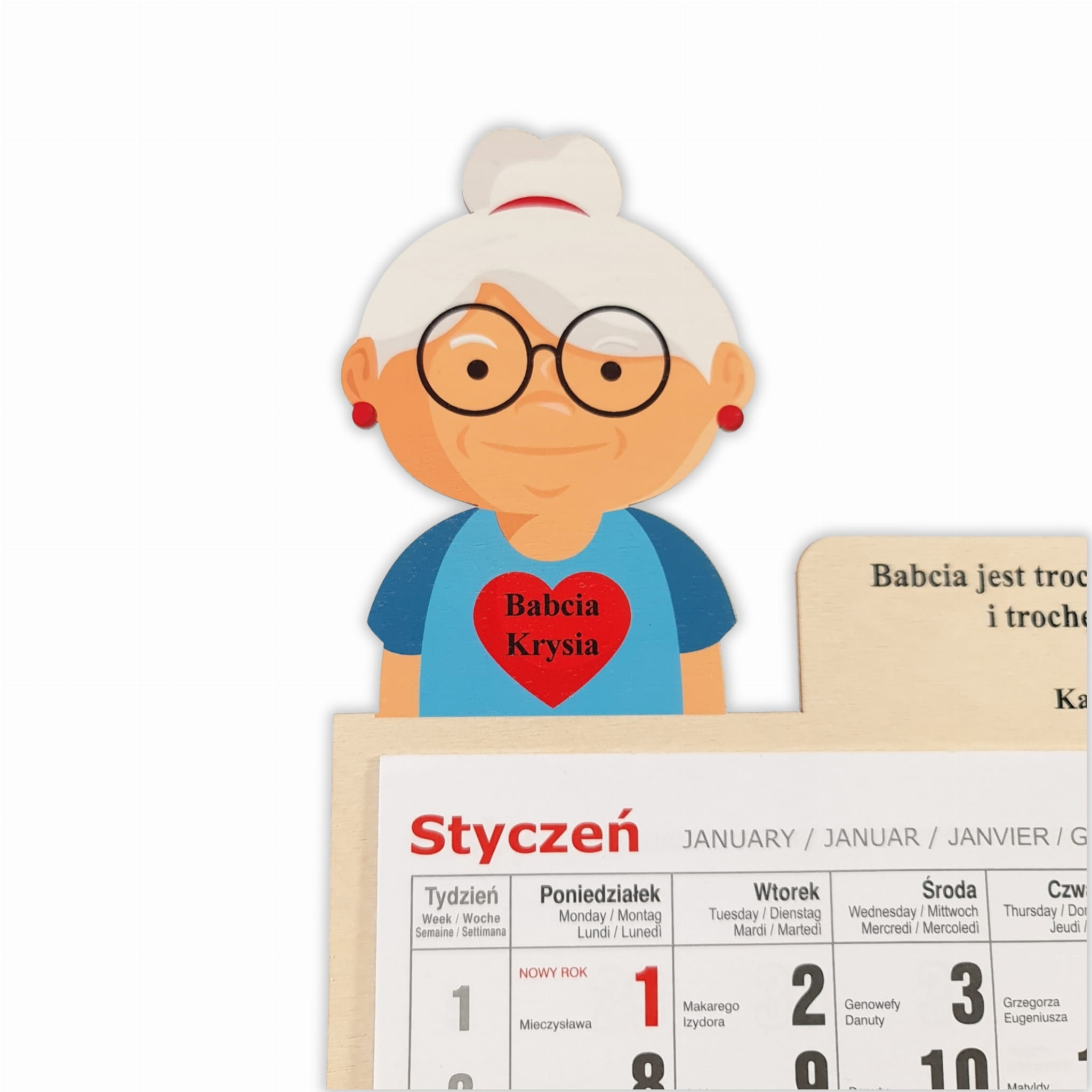 Babcia to bardzo wyjątkowa osoba w naszym życiu. Podaruj jej równie wyjątkowy i oryginalny prezent na dzień babci jakim jest drewniany kalendarz z jej imieniem. Kalendarz na dzień babci będzie bardzo praktycznym prezentem i z pewnością zostanie doceniony, ponieważ nie tak łatwo jest znaleźć prezent dla babci, zdecydowana większość z nich twierdzi, że wszystko już ma i nie potrzebuje nic więcej do szczęścia. Jednak kalendarz na nowy rok zawsze się przyda!