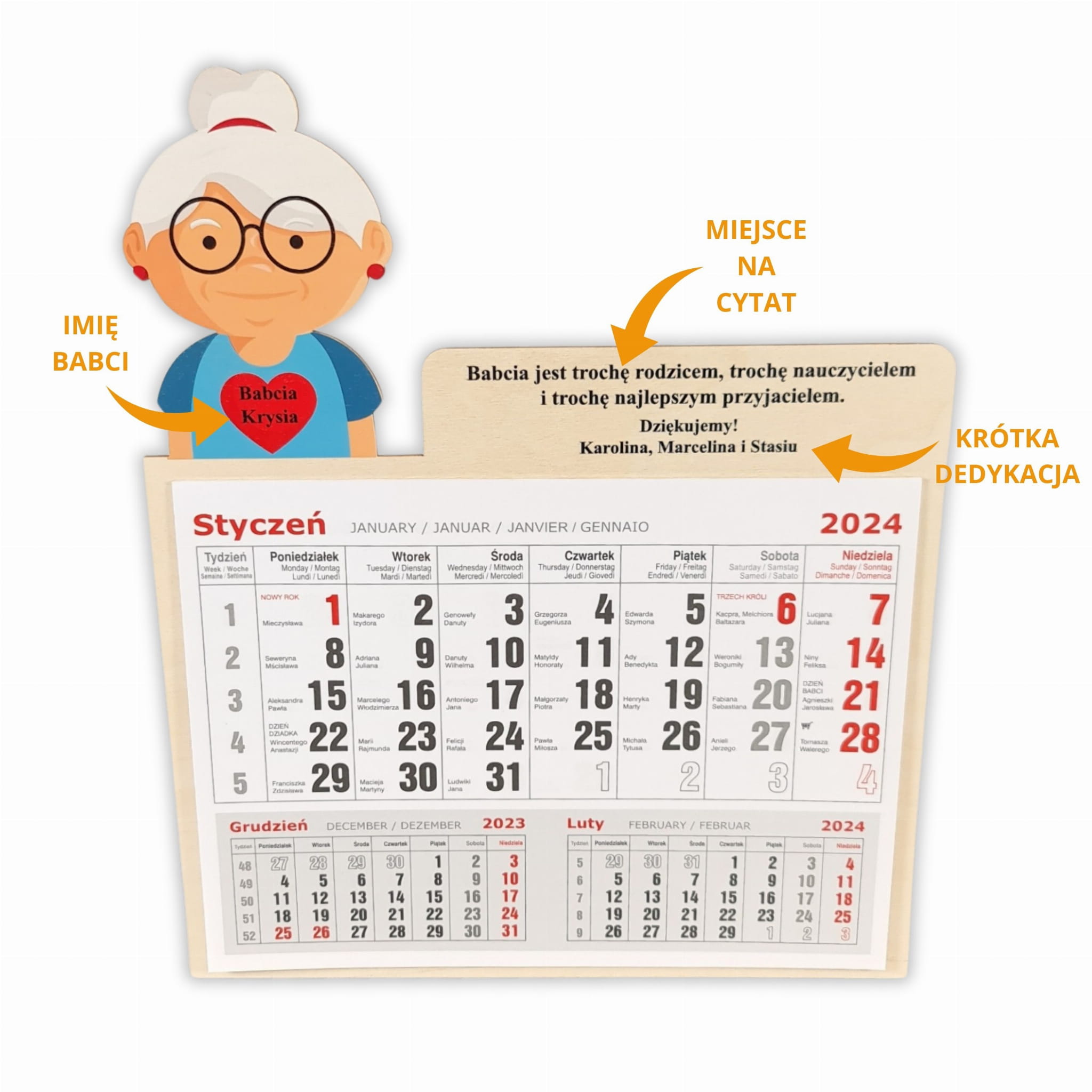 Nasz kalendarz wykonany został ze sklejki o grubości 3mm. Sklejka została wycięta w ten sposób, by przedstawiała również postać babci. Na kalendarzu nadrukowana została kolorowa postać babci z jej imieniem, tuż obok mamy piękny cytat wraz z dedykacją od wnuków. Informacje te są w pełni personalizowane i należy je podać podczas zamawiania produktu. Forma tego kalendarza kierowana jest dla babci, ale w naszym sklepie również znajduje się kalendarz przeznaczony dla babci i dziadka jako wspólny prezent lub kalendarz dla samego dziadka.