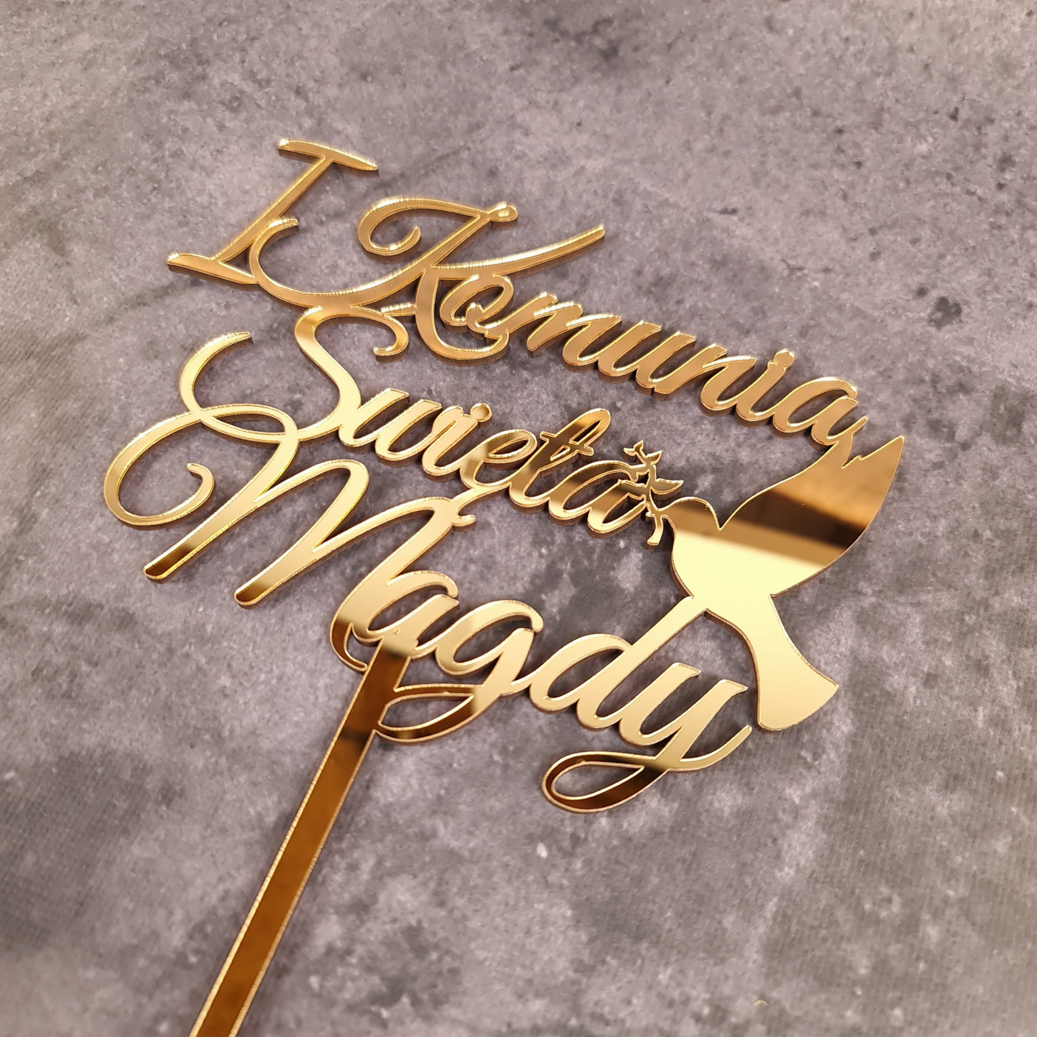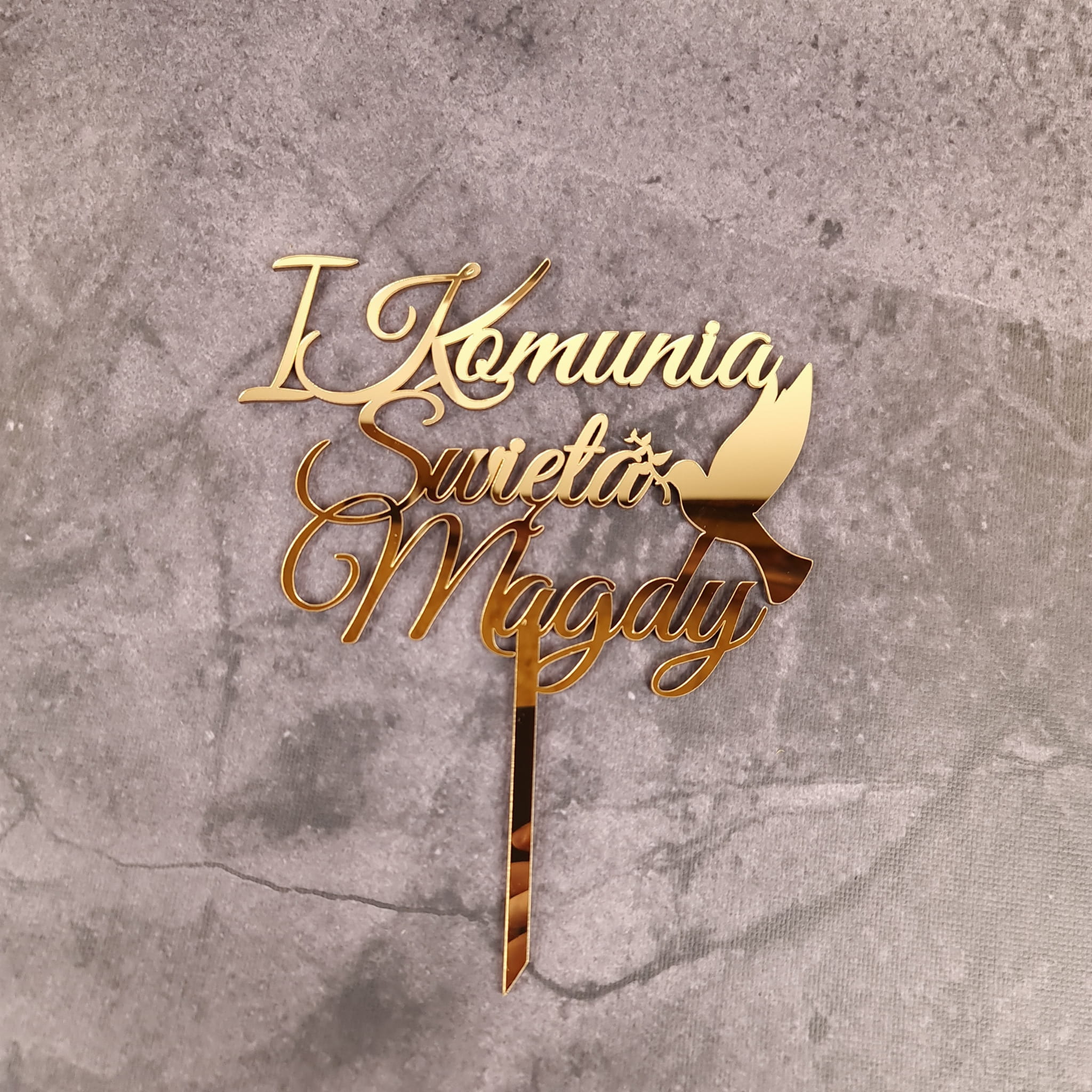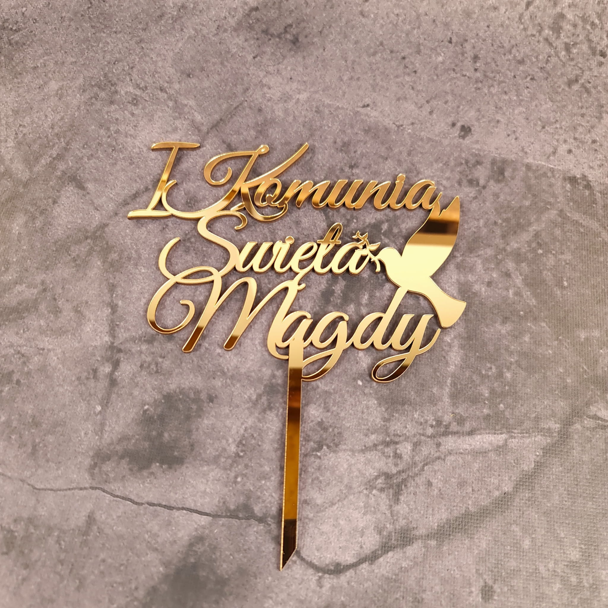 - Złoty topper na komunię – elegancki i ponadczasowy kolor, idealnie pasujący do uroczystości kościelnych.