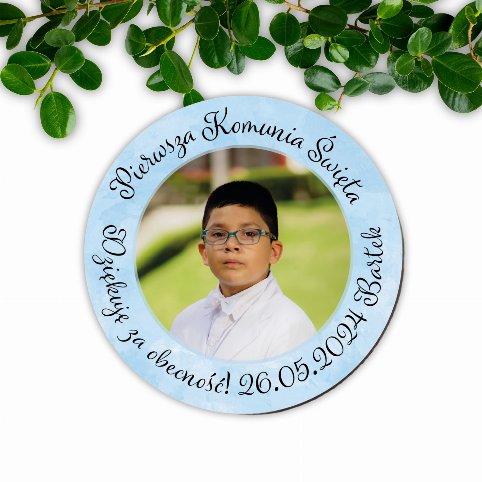 Magnes jest okrągły, a zdjęcie chłopca otacza niebieska ramka, na której nadrukowany jest tekst podziękowań oraz szczegóły (imię, data).