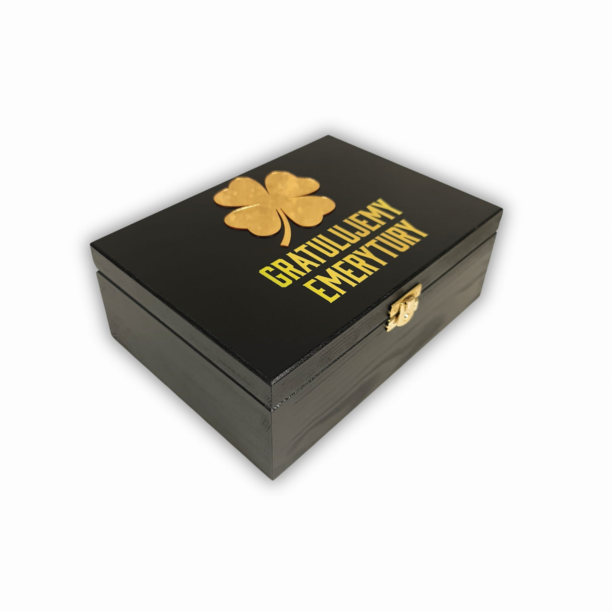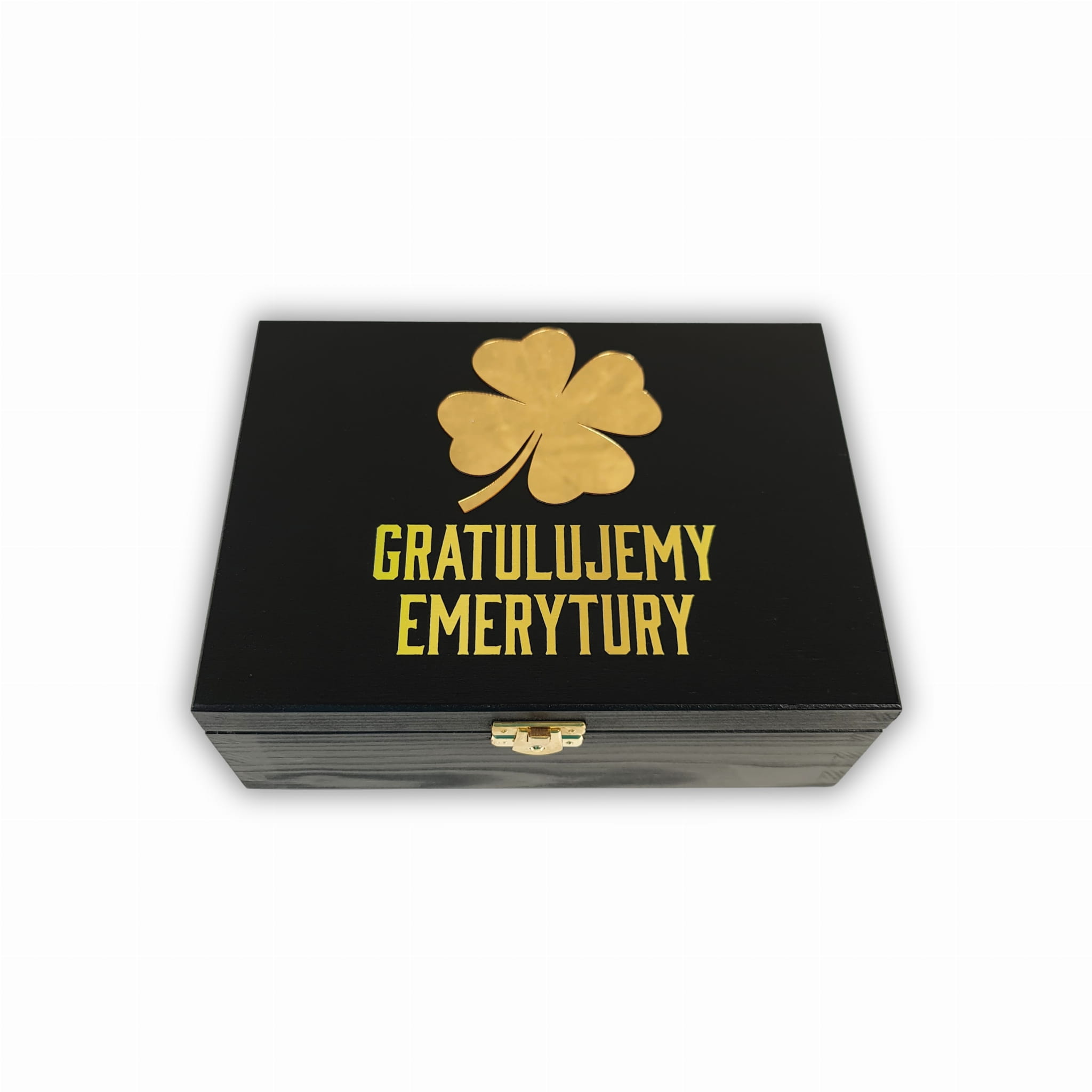 Na wieku drewnianego pudełeczka znajduje się duża koniczyna wycięta z złotego lustrzanego tworzywa pmma. Pod nią drukujemy wyraźny napis "GRATULUJEMY EMERYTURY" ( Napis możemy zmienić, daj nam o tym znać w uwagach do zamówienia) Wewnątrz pudełka wklejamy nadrukowane na złotym lustrze życzenia, które możesz zmienić i podpisać. Oferujemy również opcję zakupu z pralinami Ferrero Rocher - tak aby gdy wymaga tego sytuacja prezent był w ekspresowym tempie gotowy do wręczenia. W komplecie znajdziemy tekturową kartkę na podpisy kolegów, koleżanek czy współpracowników wręczających prezent. Do pudełka można również włożyć pieniądze lub bon podarunkowy.