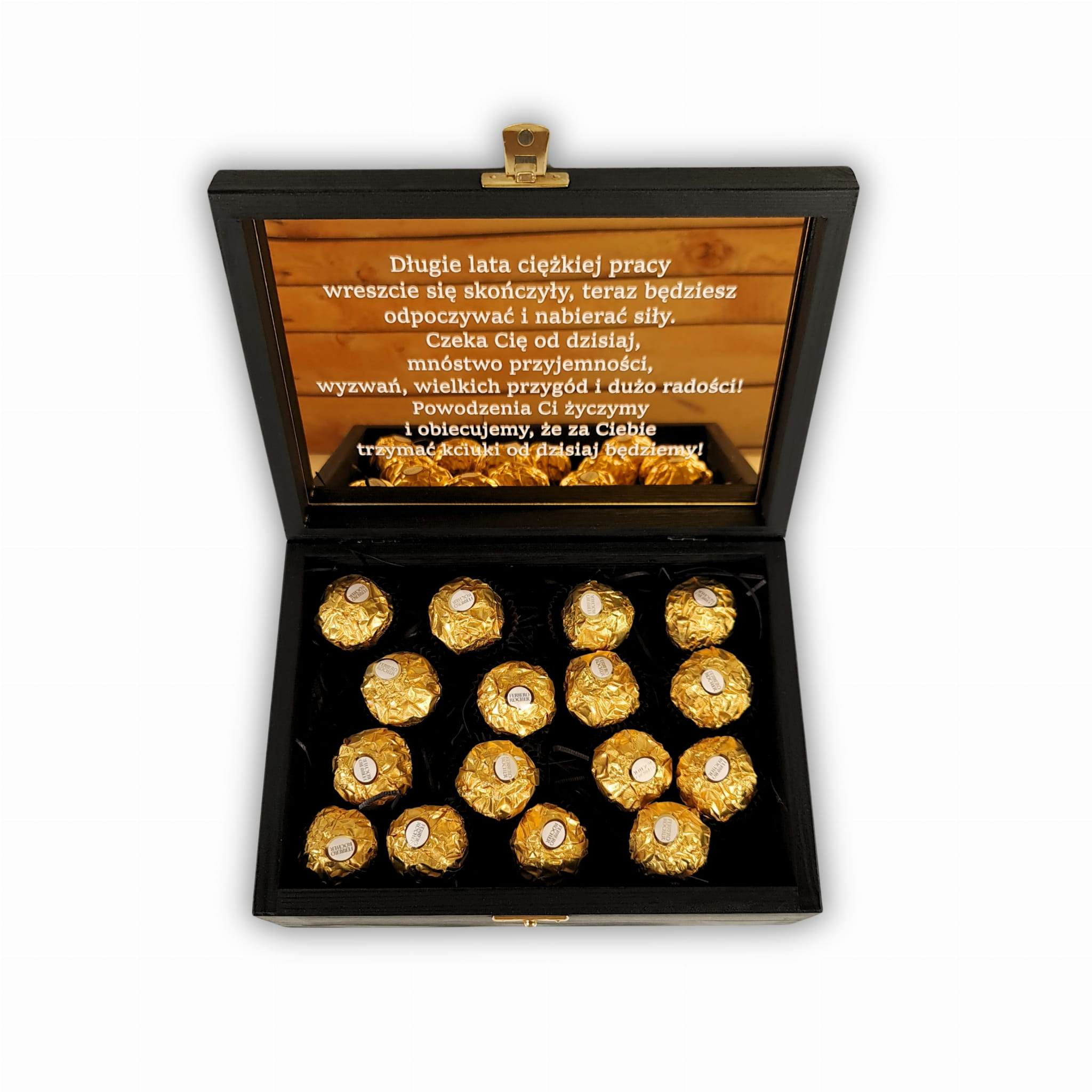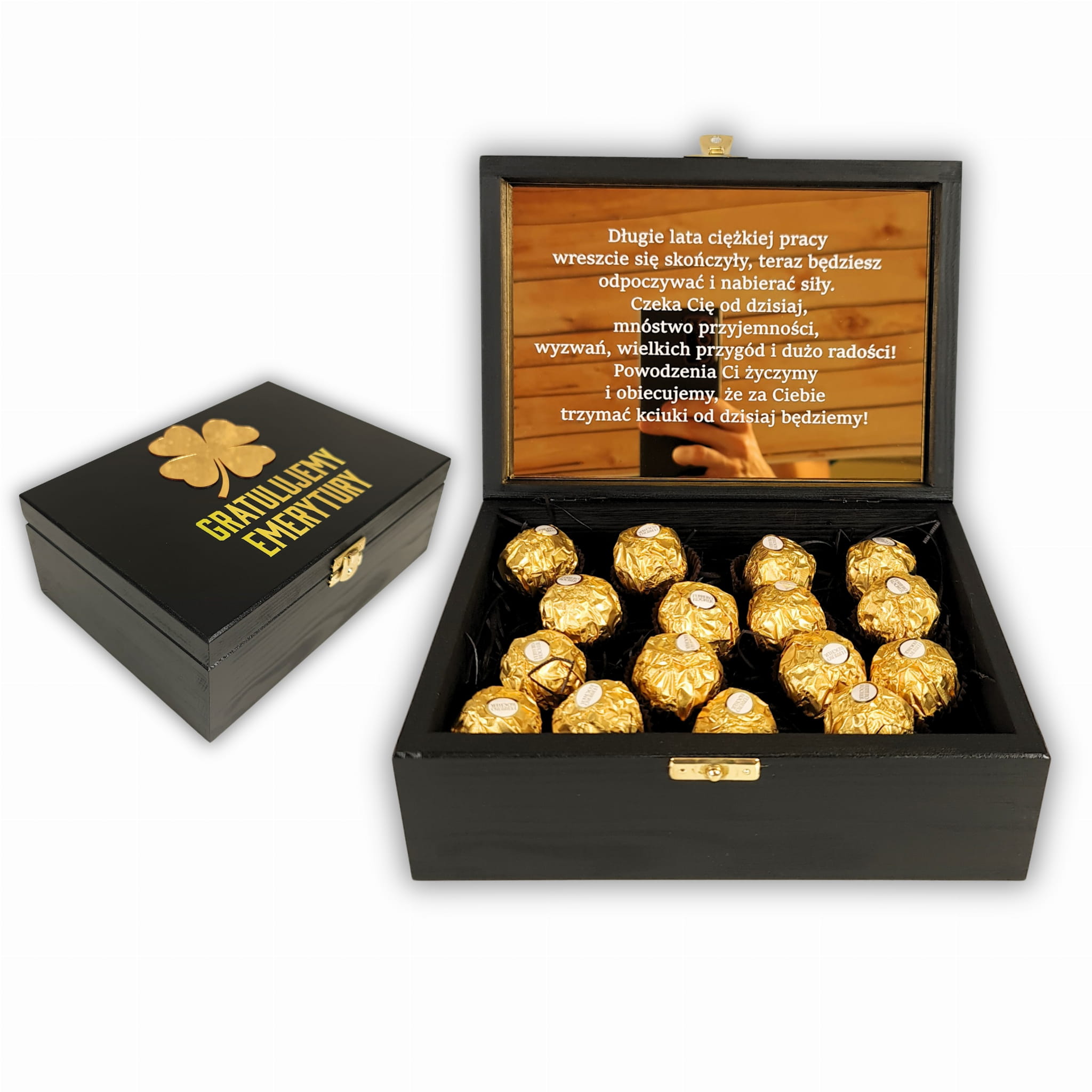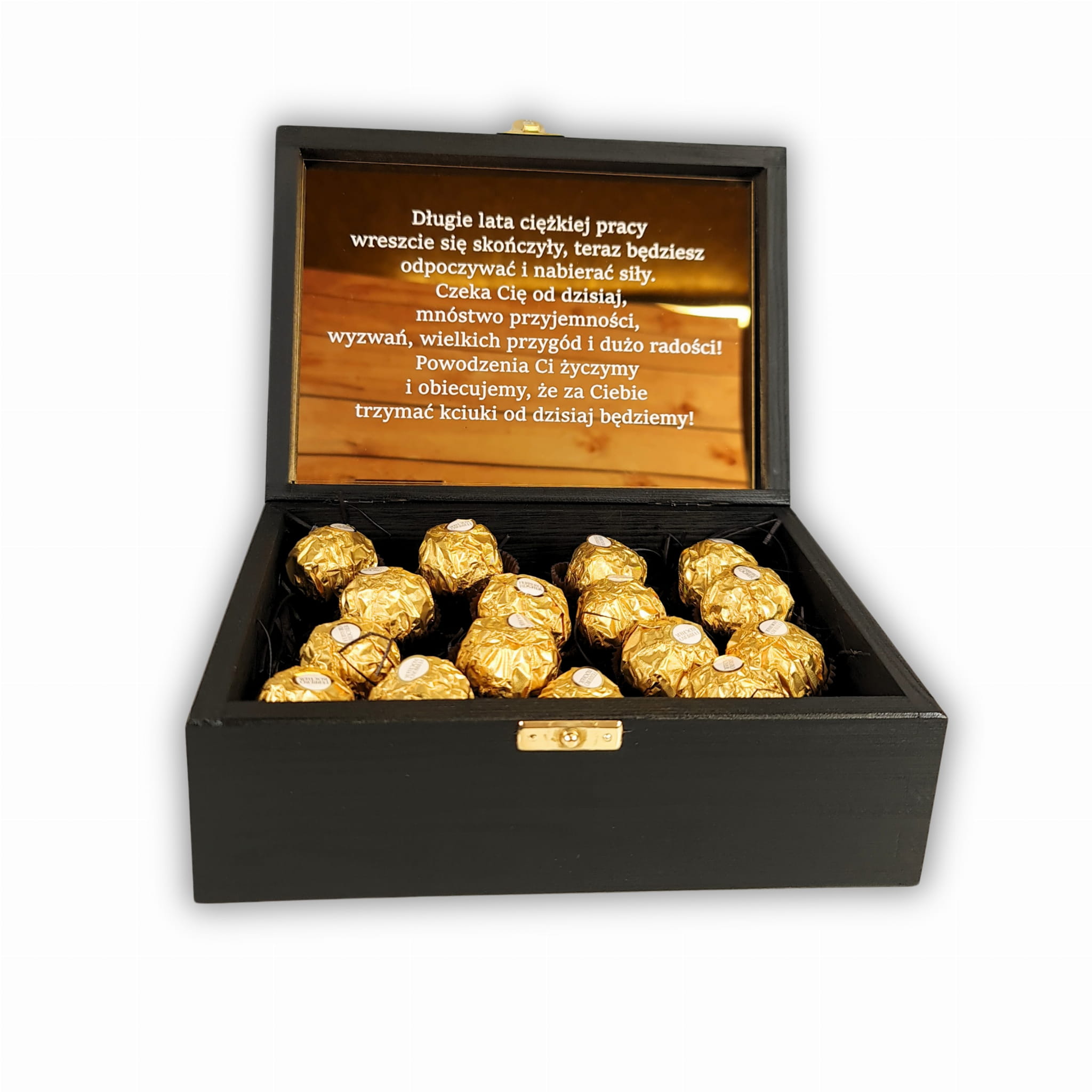 Czarno złota skrzynka z Ferrero Rocher - prezent na przejście na emeryturę