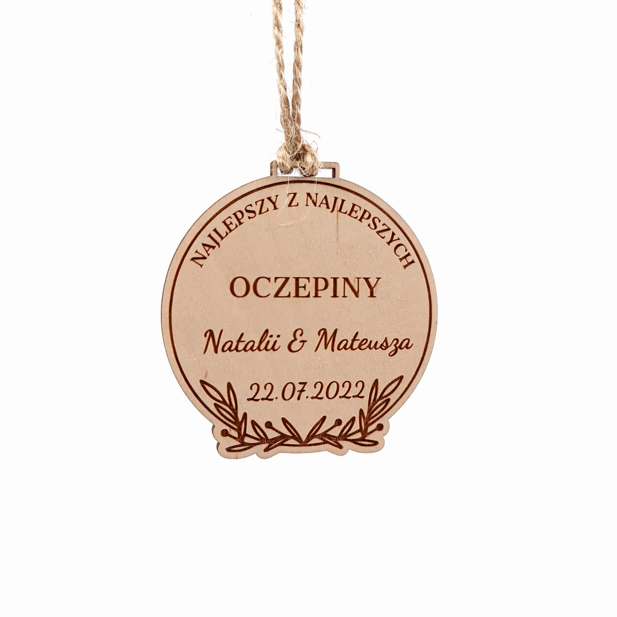 Oczepiny zostały punktem kulminacyjnym zabawy weselnej. Dziś znane są z różnych konkurencji i zabaw, w których między innymi biorą udział goście. Jeśli chcesz podziękować swoim gościom za aktywny udział w konkurencjach, to ten produkt jest dla Ciebie! W konkurencjach wyłania się zwycięzców, a zwycięzców trzeba nagradzać! Proponujemy jako nagrodę drewniane medale z personalizowanym grawerem. Medal zawiera napisy: "Najlepszy z najlepszych", "Oczepiny" oraz Imiona Pary Młodej i data Ślubu. Możliwość personalizacji sprawia, że produkt staję się wyjątkowy i oryginalny. Z pewnością Twoi goście na długą zapamiętają tę zabawę.