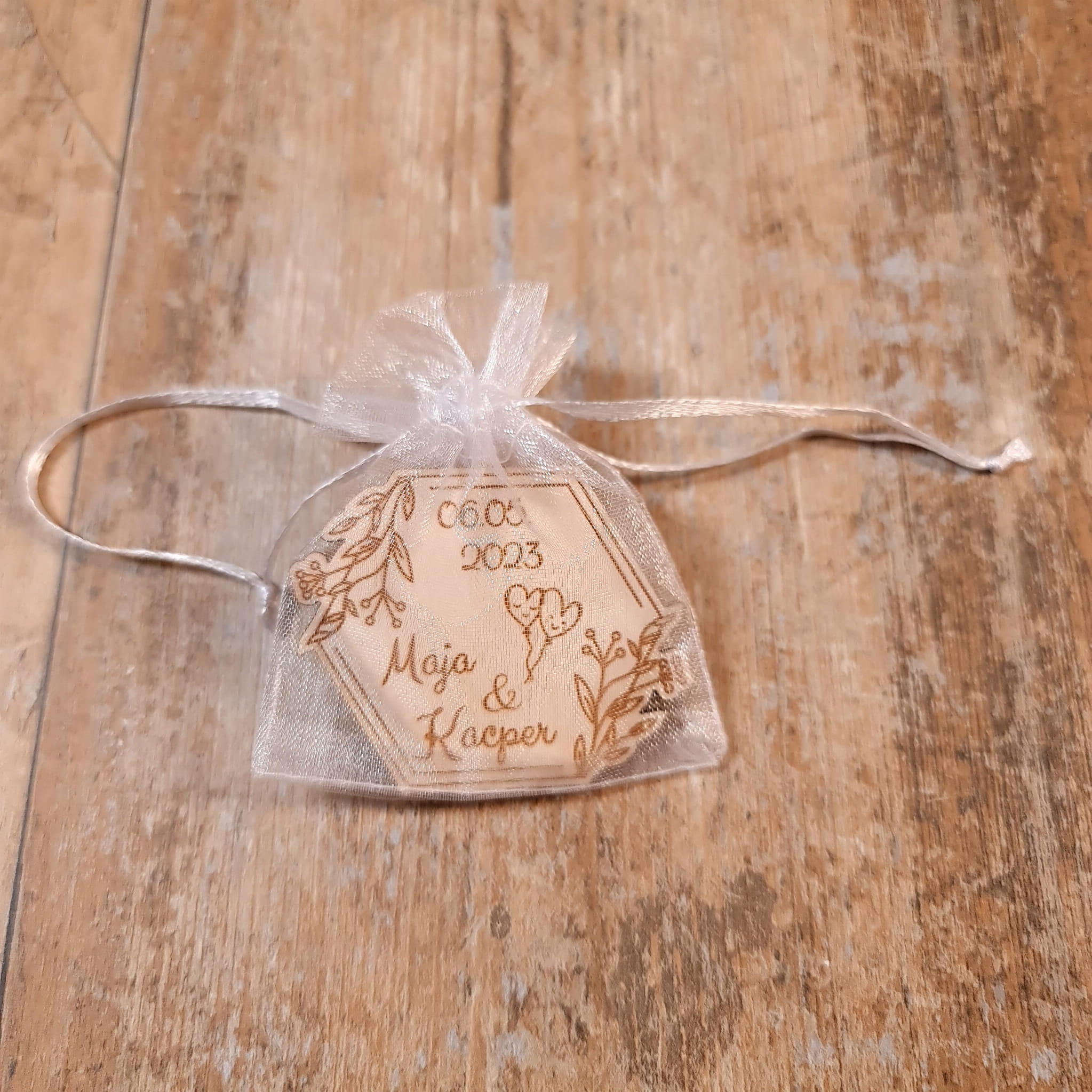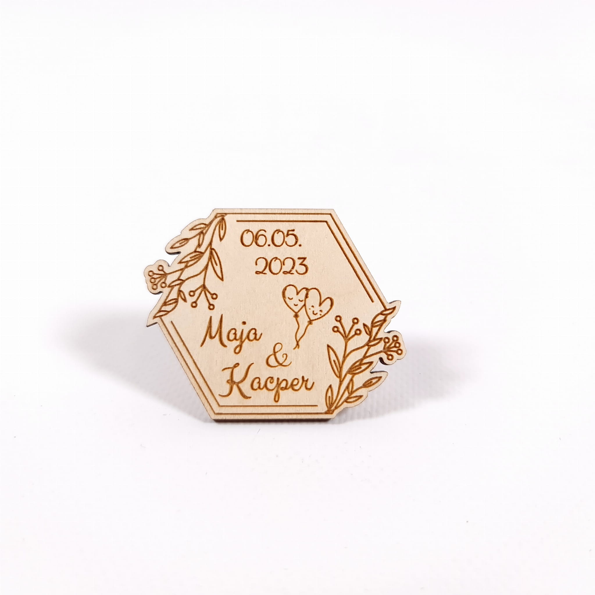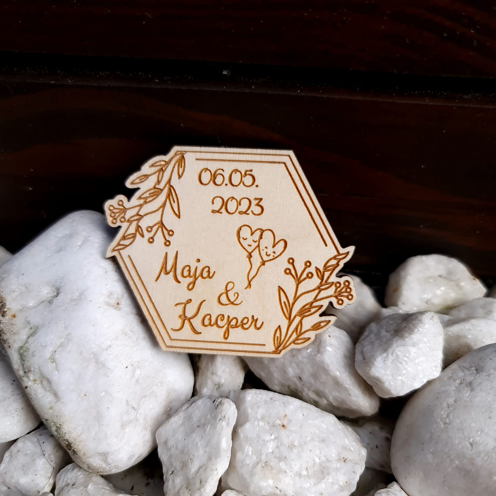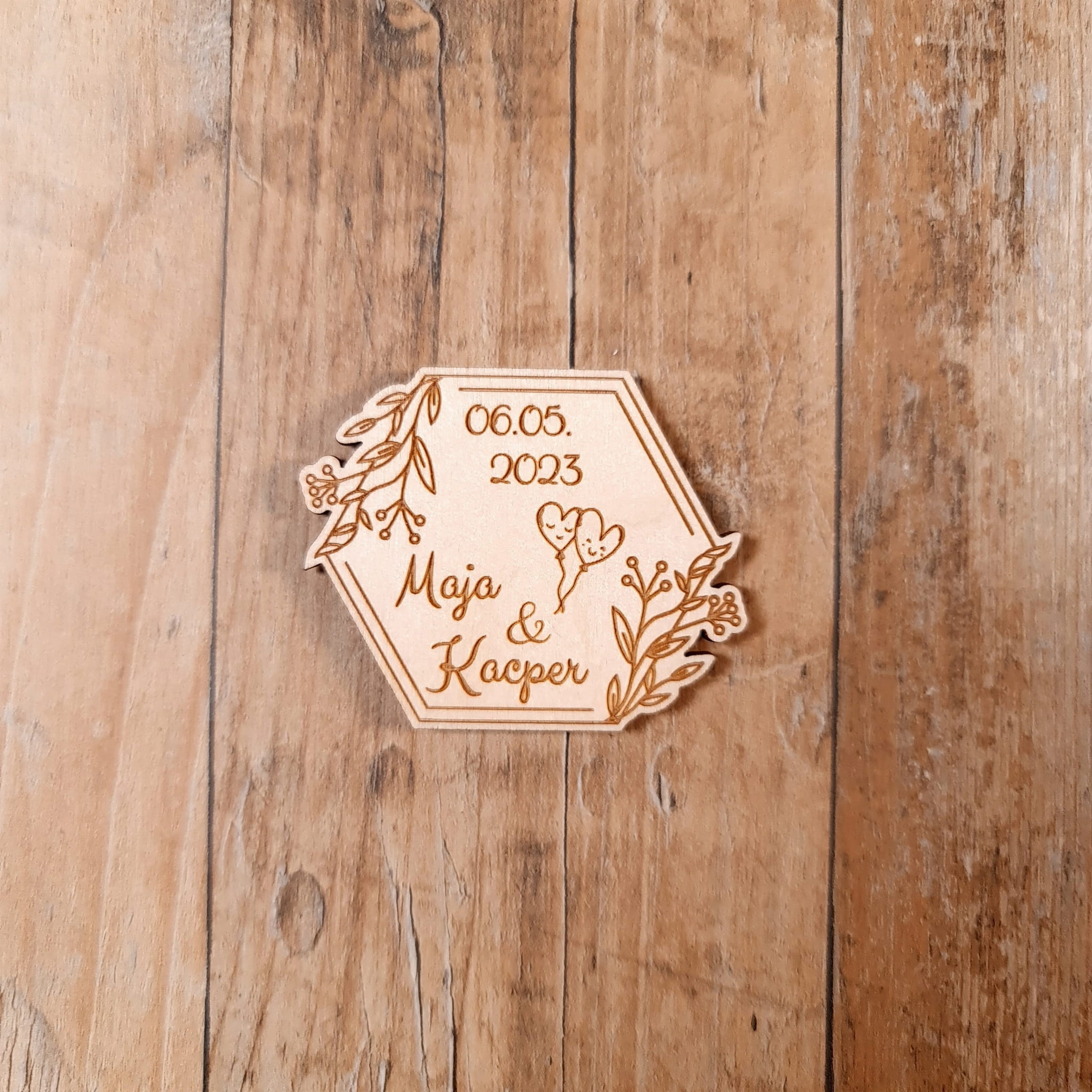 Nie wiesz jak podziękować gościom weselnym za wspólne świętowanie uroczystości? Mamy dla Ciebie idealne rozwiązanie! Dzięki naszym drewnianym upominkom Twoi goście na długo zapamiętają tę uroczystość. Personalizowany grawer z imionami Pary Młodej oraz datą Ślubu sprawia, że podziękowanie staje się jeszcze bardziej wyjątkowe. Personalizowane napisy są otoczone wzorem liści i kwiatów, dzięki czemu magnes nabiera elegancji oraz uroku. Podziękowanie wycięte jest ze sklejki o grubości 3mm w kształcie heksagonu.