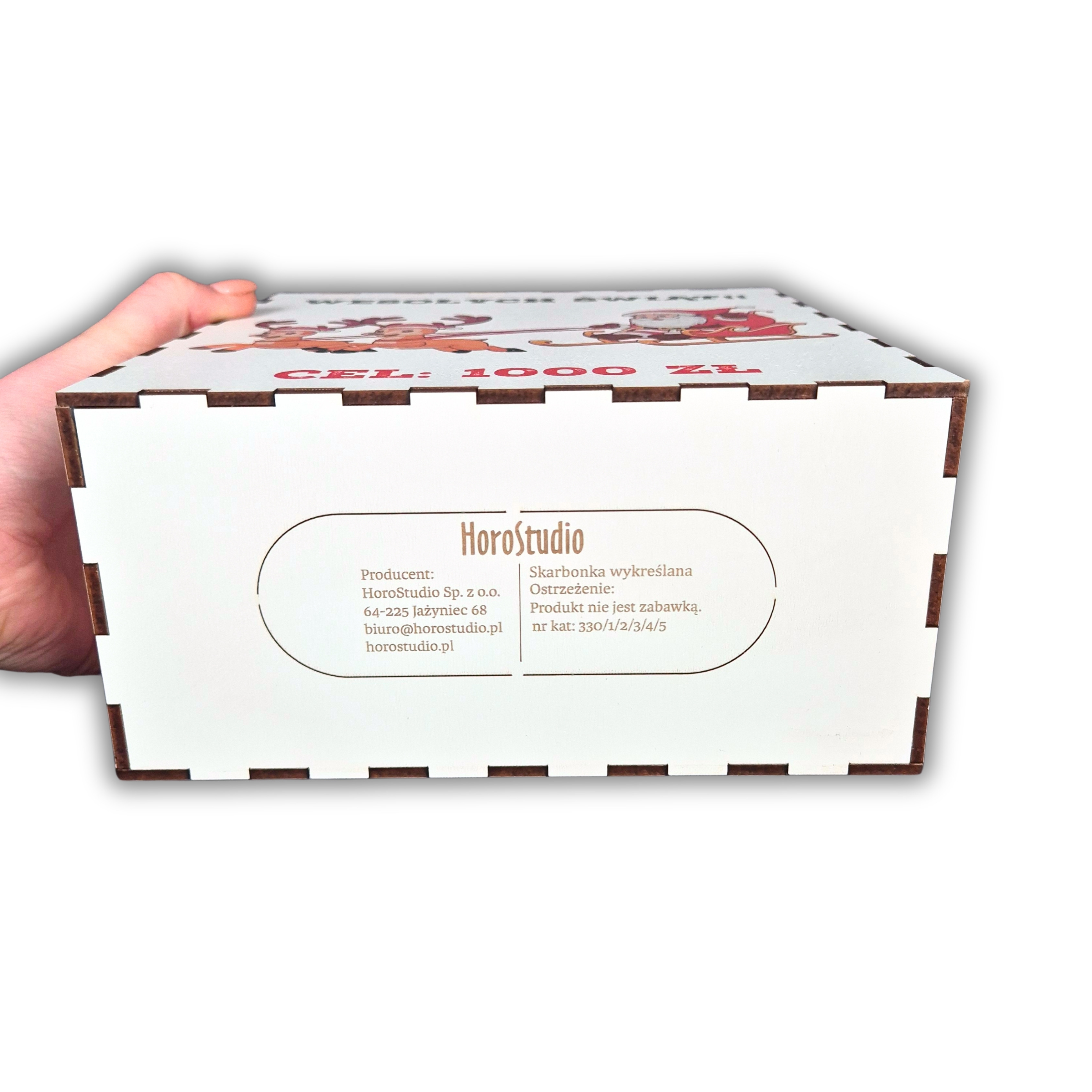 Skarbonka wykonana z białej płyty HDF, trafia do klienta solidnie sklejona i gotowa do oszczędzania :)