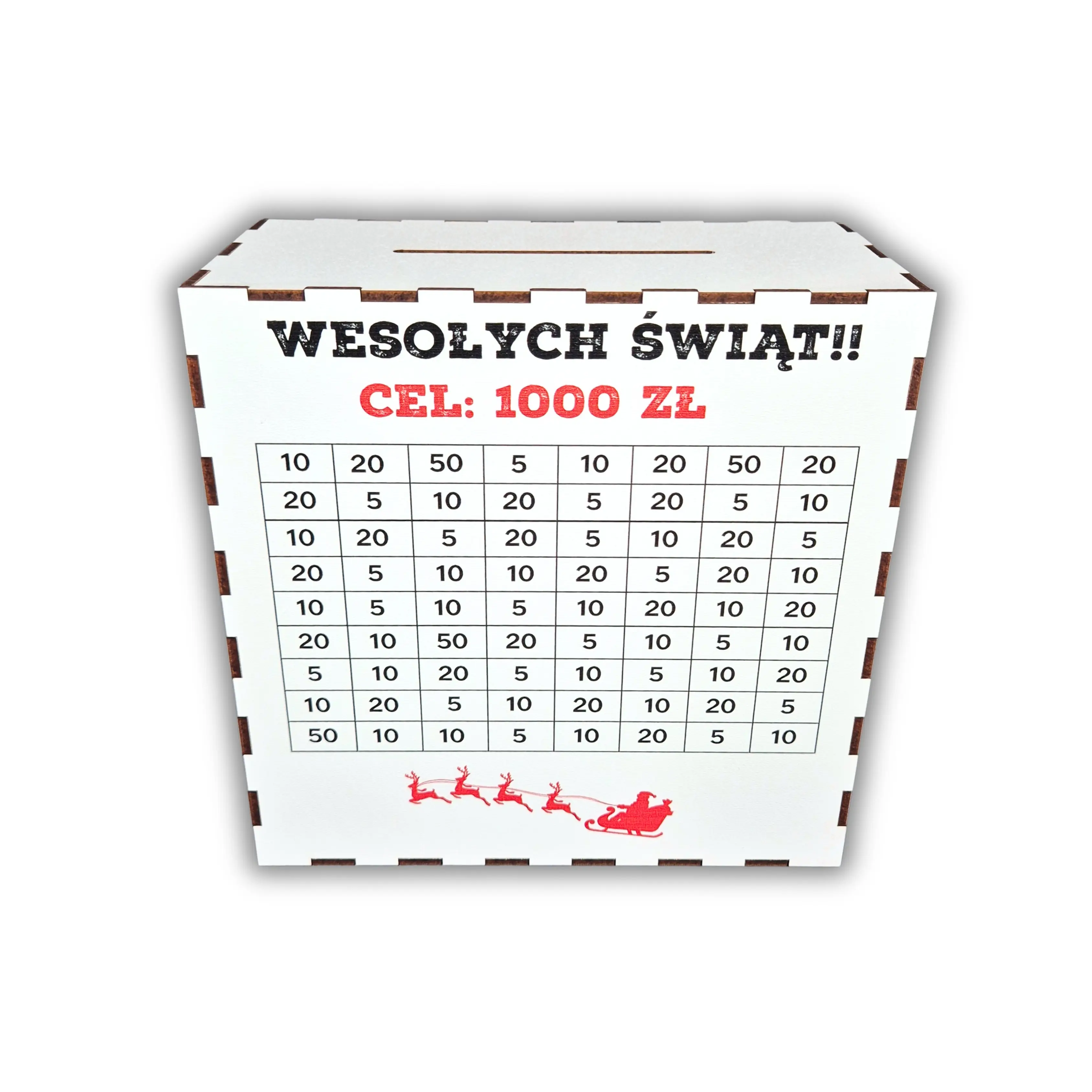Nasza skarbonka sprawdzi się świetnie jako pomoc i zachęta do systematycznego oszczędzania pieniędzy. Dzięki możliwości wykreślania kwoty, którą wrzuca się do skarbonki, jest się w pełni świadomym, ile pieniążków się w niej znajduje. Ten model skarbonki sprawdzi się świetnie jako prezent pod choinkę lub na Mikołajki. Na przodzie skarbonki znajdziemy grafikę Mikołaja wraz z reniferami.