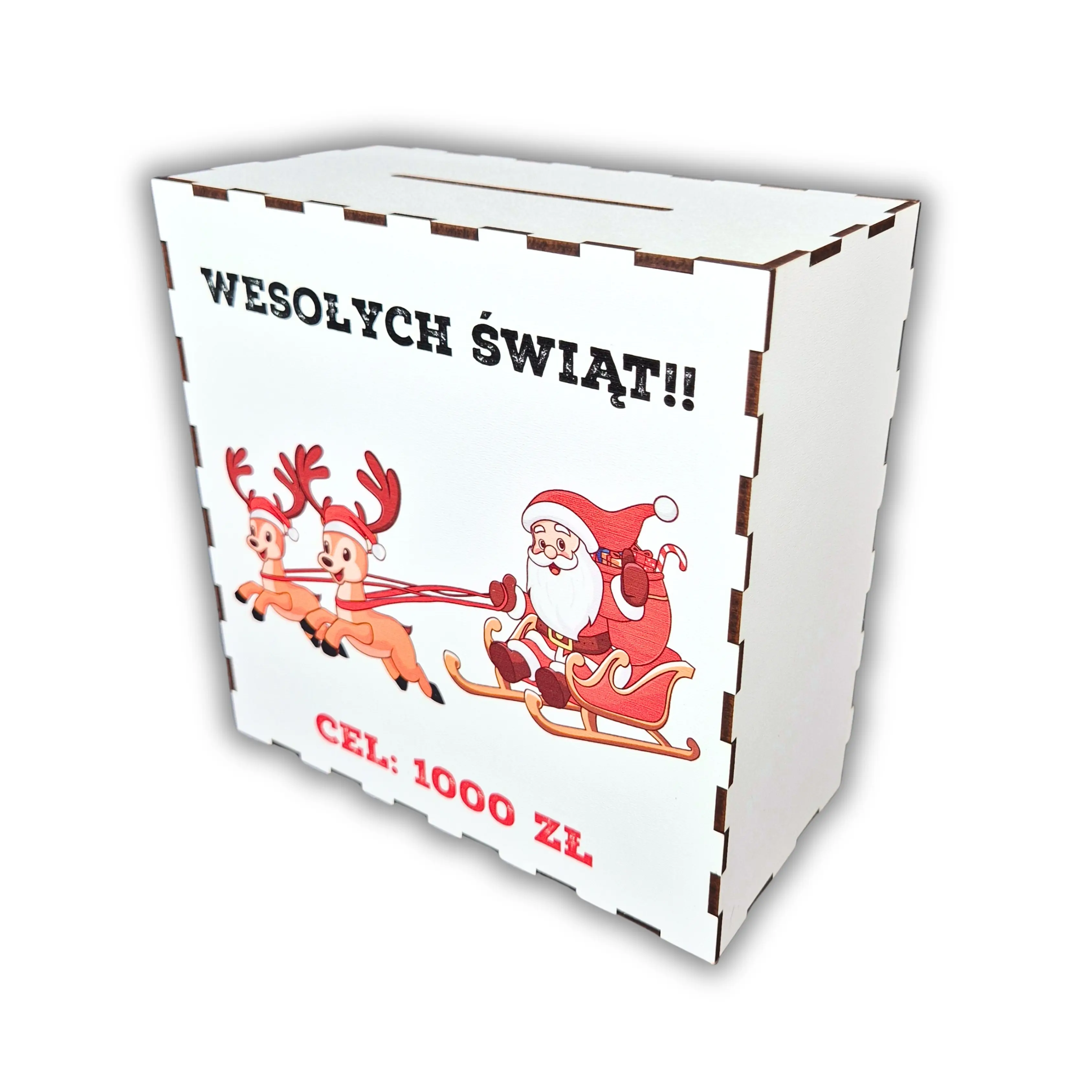 Skarbonka wykreślana na święta z reniferami i mikołajem