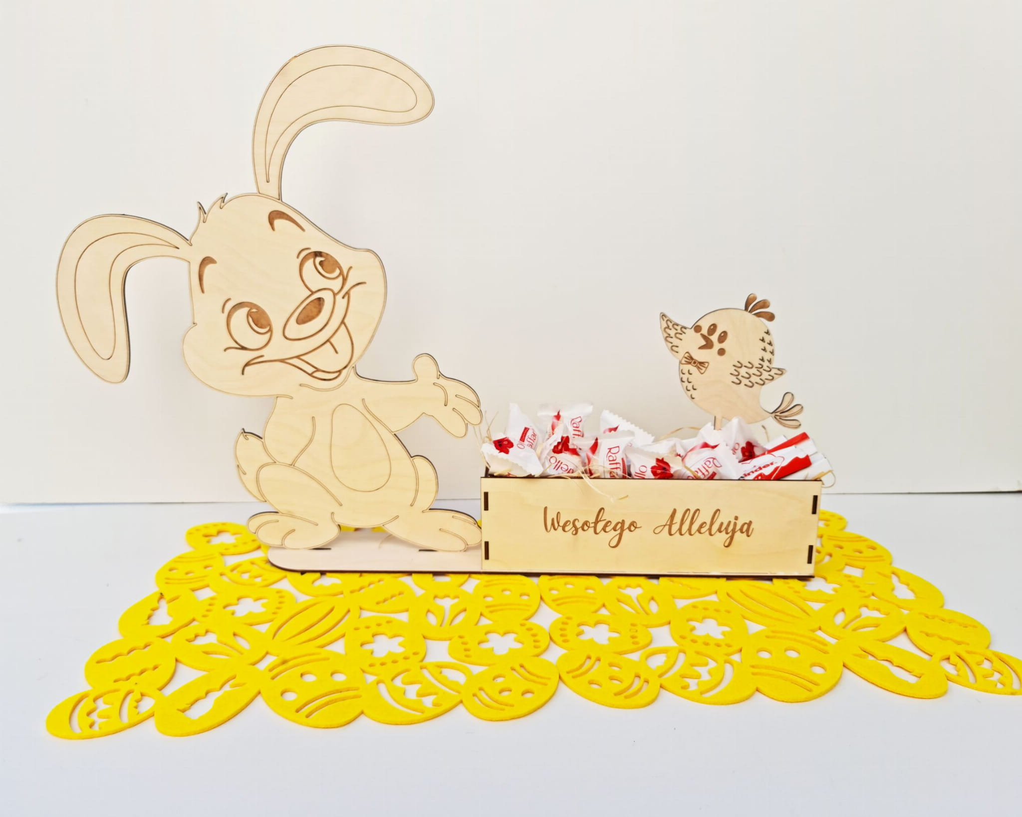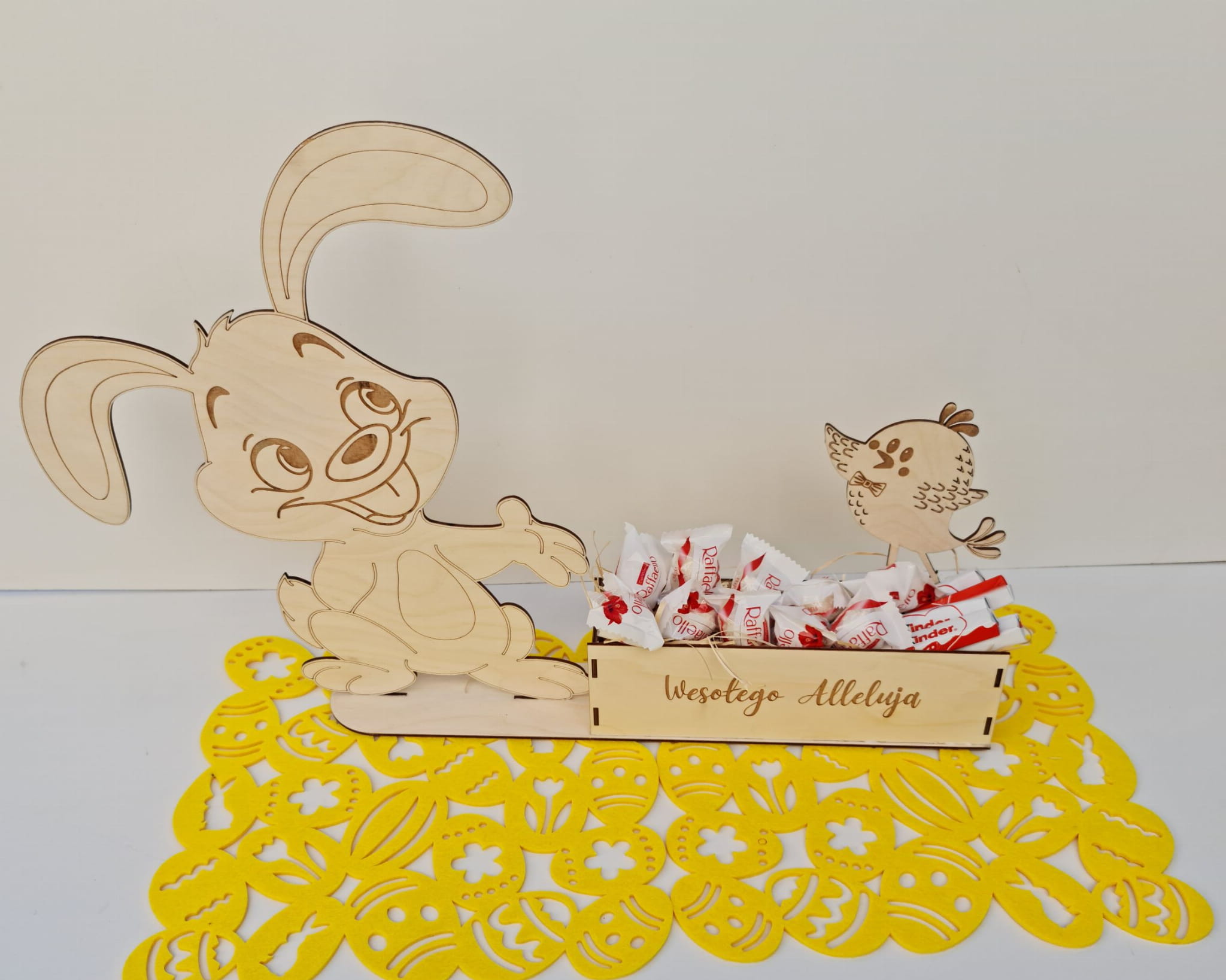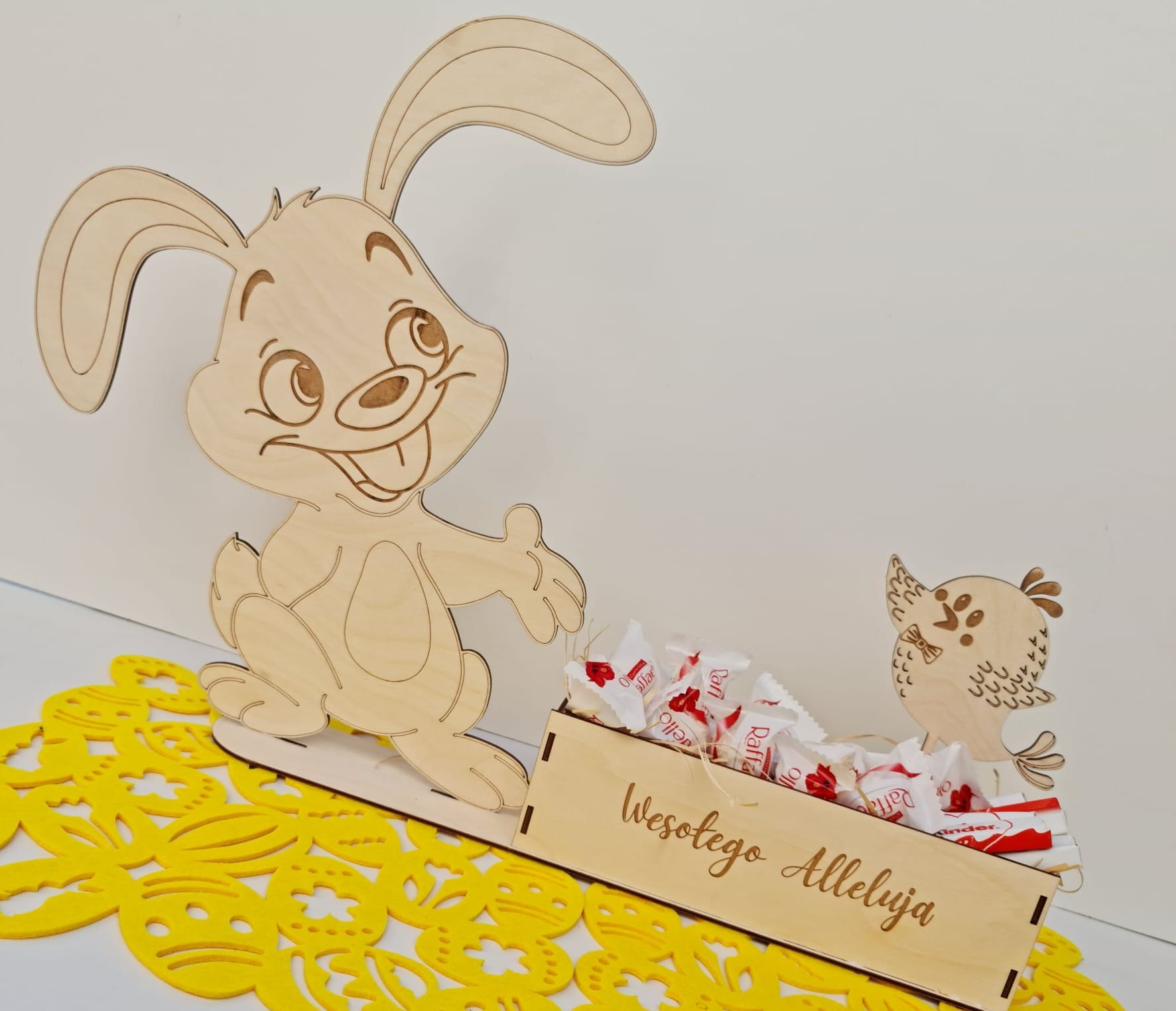Zajączek z skrzynką na drobiazgi. W ofercie wewnątrz skrzynki, jako wypełnienie znajduję się wełna drzewna,