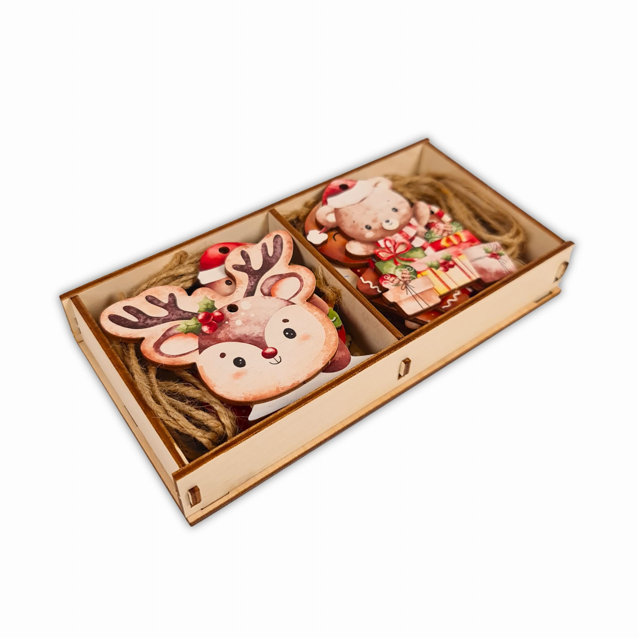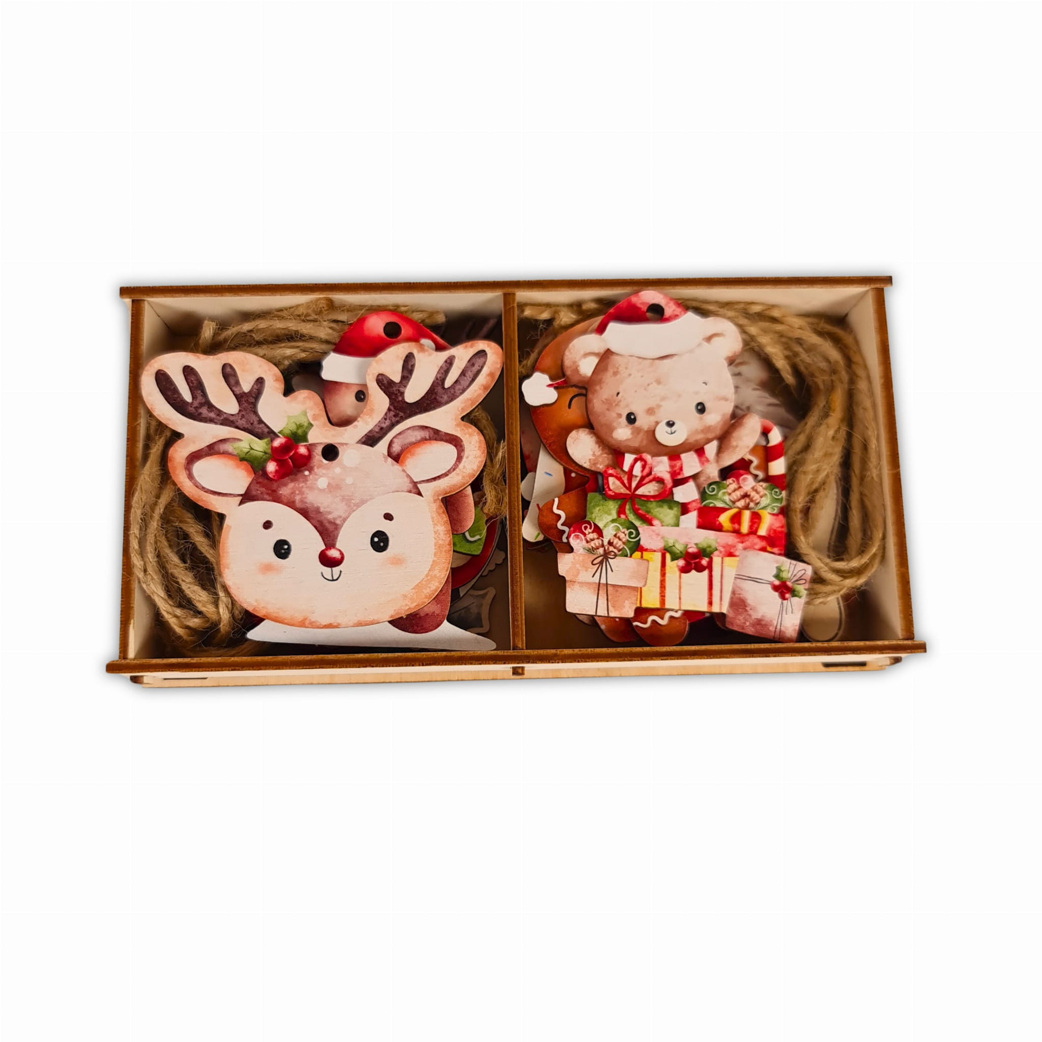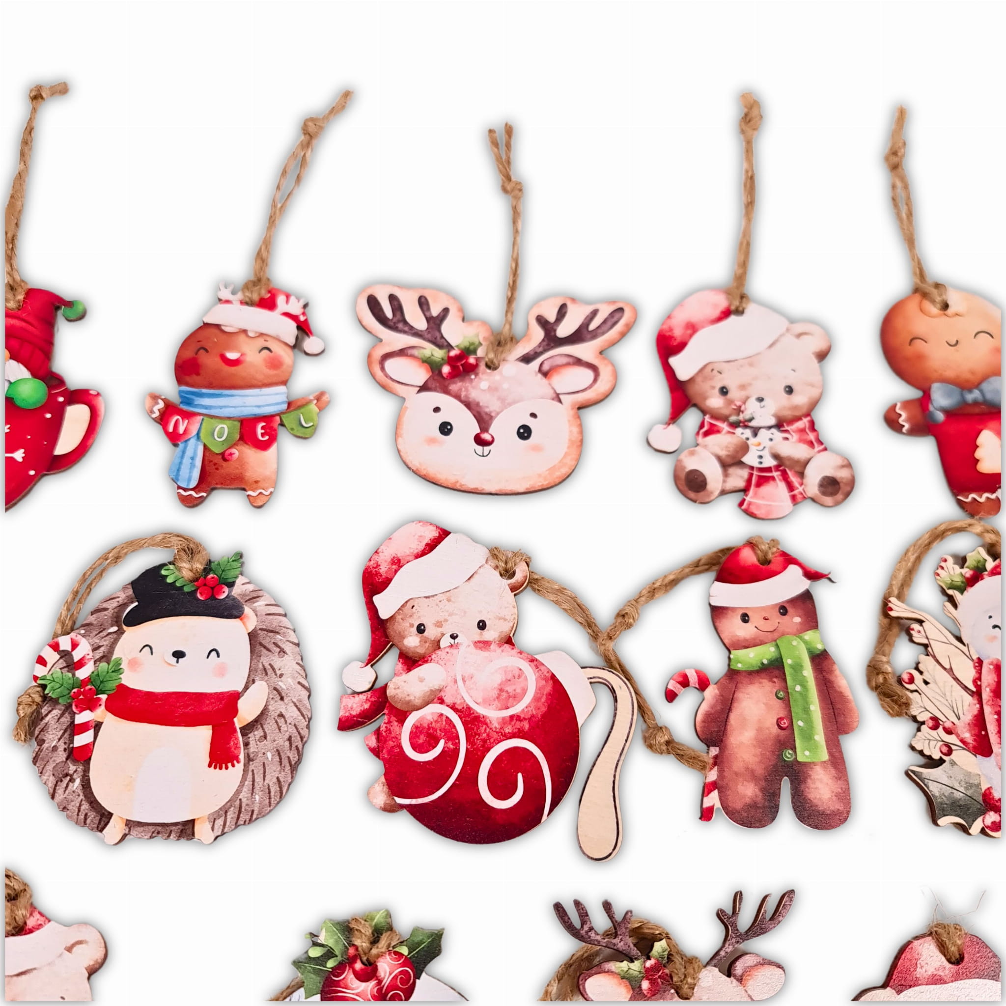 Zawieszki zostały wykonane z sklejki brzozowej o grubości 3mm, na której to następnie został naniesiony nadruk UV. Bombki dzięki tej metodzie nigdy nie wyblakną, a grafika jest odporna na zadrapania lub inne uszkodzenia. Jest to zdecydowanie ekonomiczne rozwiązanie na długie lata. Komplet 14 szt. zawieszek zapakowany jest w drewnianym pudełeczku wraz z sznureczkami jutowymi, dzięki którym zawiesimy ozdoby na choince.