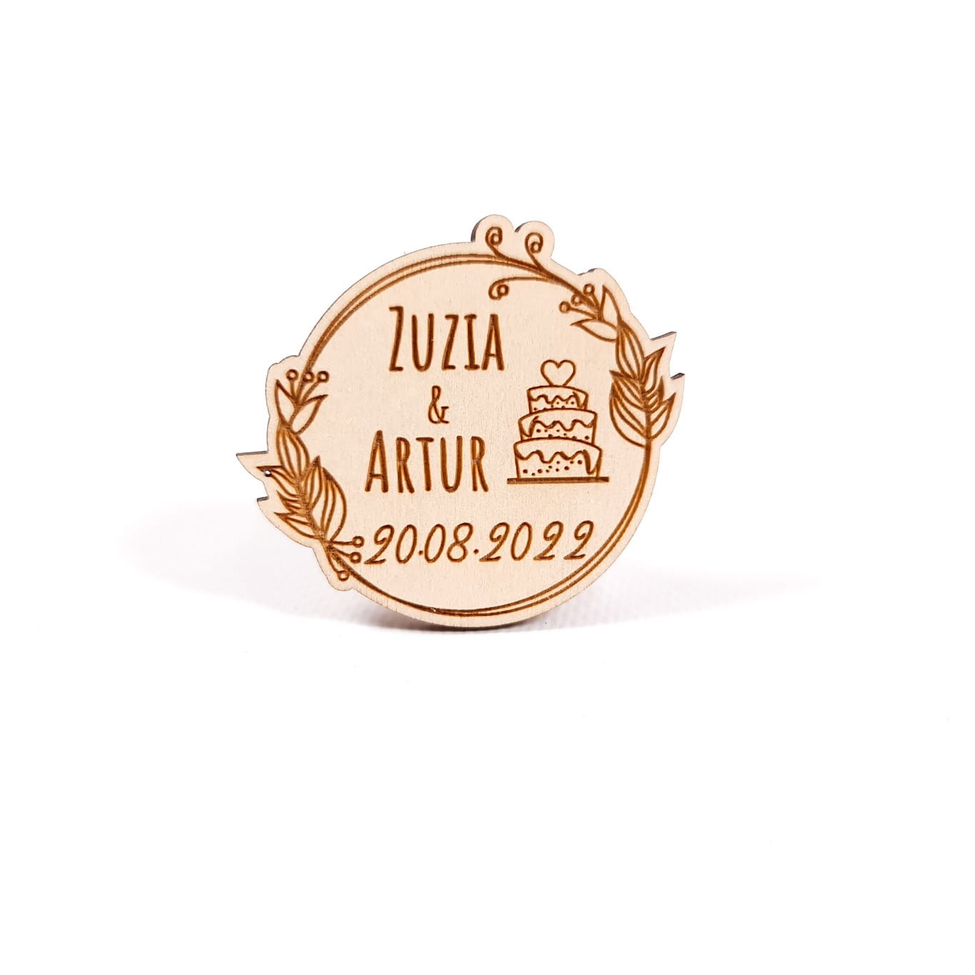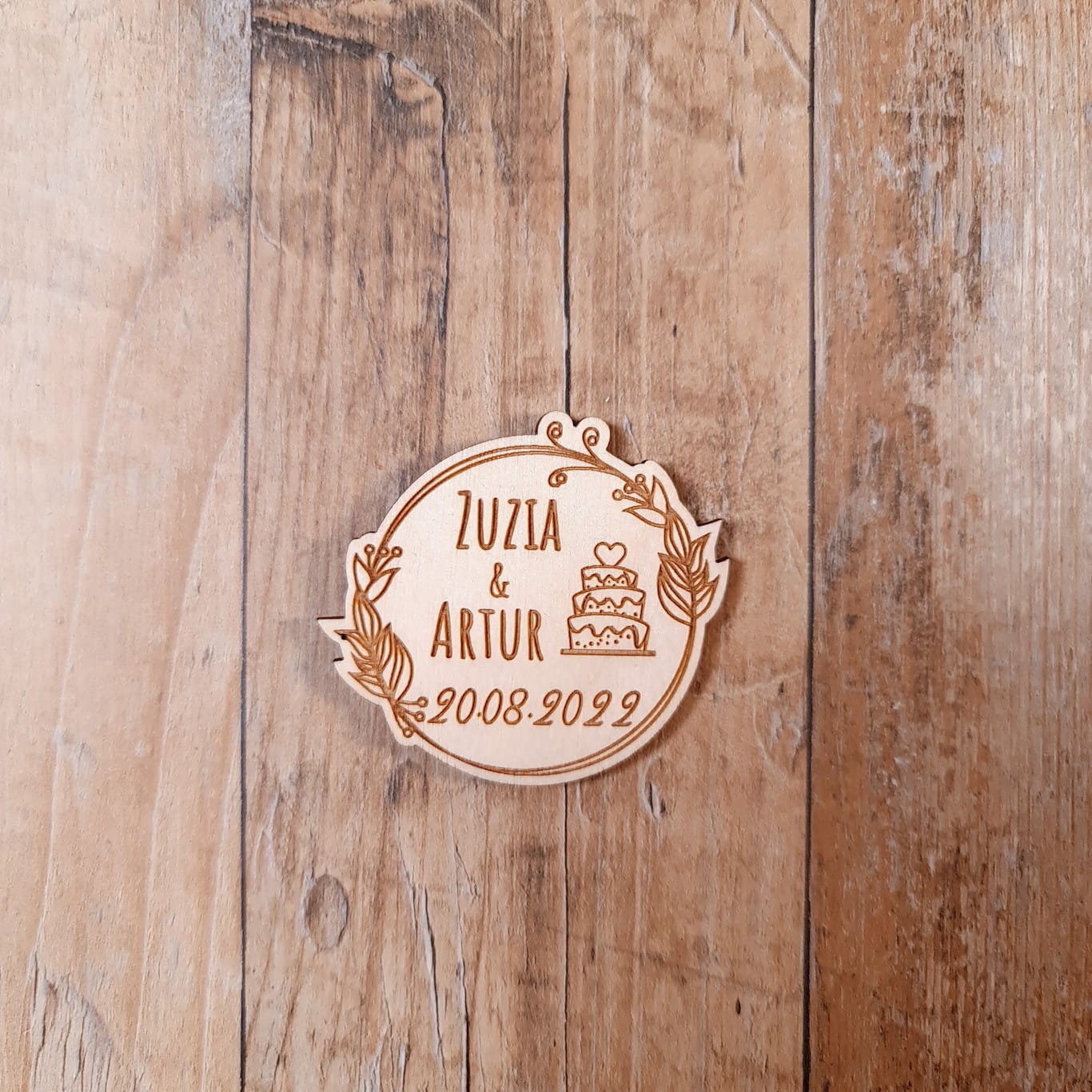 Nie wiesz jak podziękować gościom weselnym za wspólne świętowanie uroczystości? Mamy dla Ciebie idealne rozwiązanie! Dzięki naszym drewnianym upominkom Twoi goście na długo zapamiętają tę uroczystość. Produkt wykonany został w kształcie kółka ze sklejki o grubości 3mm. Na magnesie znajduje się personalizowany grawer z imionami Pary Młodej oraz datą Ślubu, a to sprawia, że podziękowanie staje się jeszcze bardziej wyjątkowe. Personalizowane napisy są otoczone wzorem liści i kwiatów, dzięki czemu magnes nabiera elegancji i uroku.