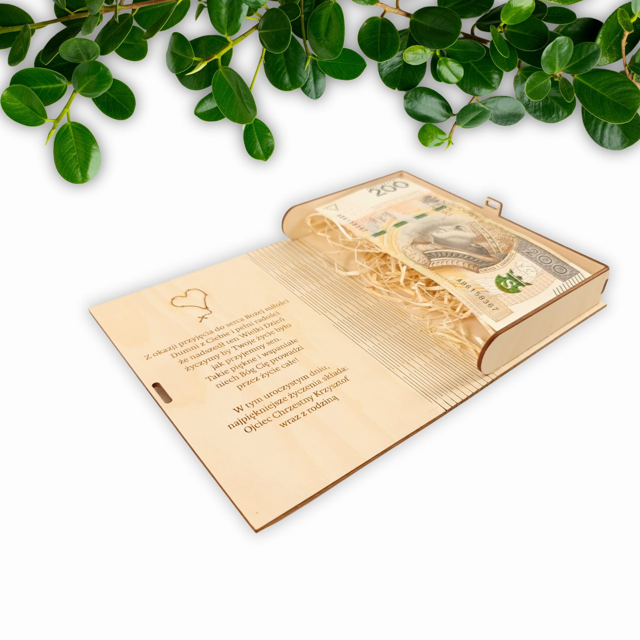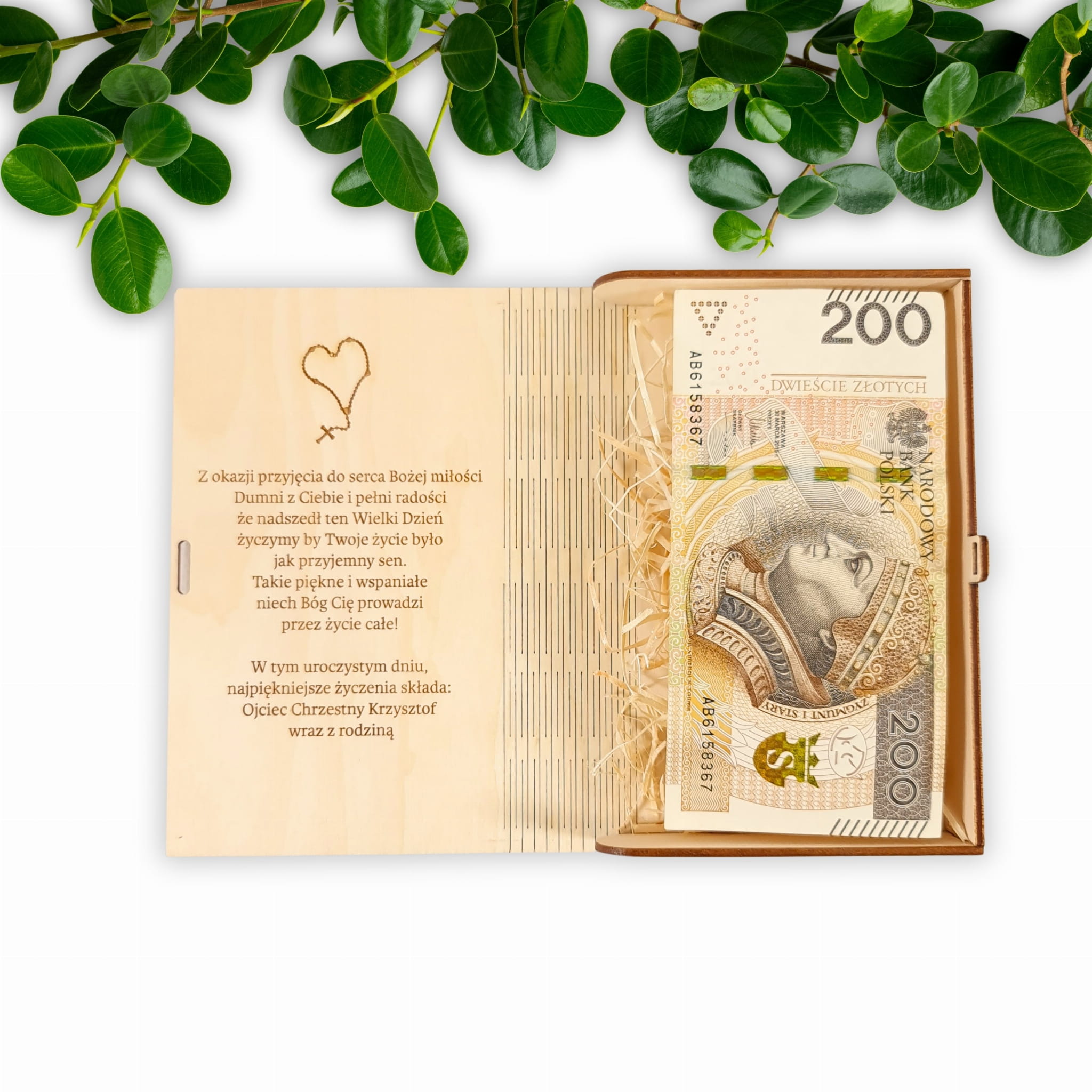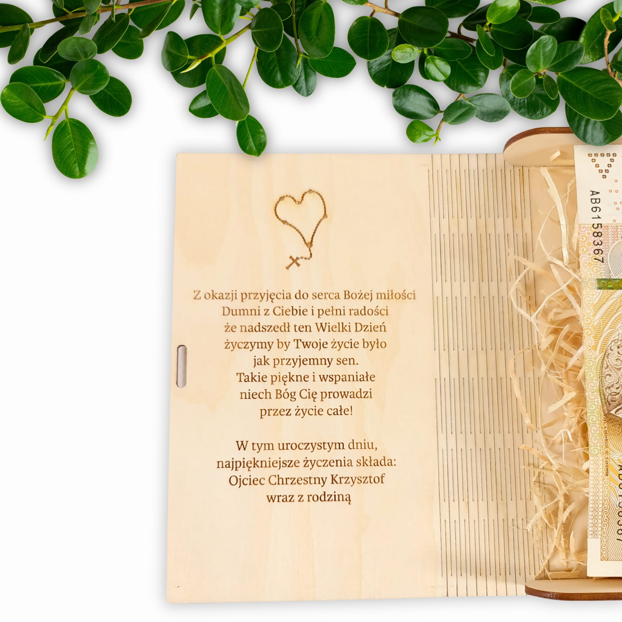 Drewniane pudełko na pieniądze z życzeniami to idealna pamiątka na Komunię Świętą. Zamiast zwykłej, standardowej kartki, mamy dla Ciebie eleganckie pudełeczko, dzięki któremu możesz w oryginalny sposób przekazać pieniążki i życzenia. Zamiast pieniędzy możesz również włożyć inny kreatywny podarunek.