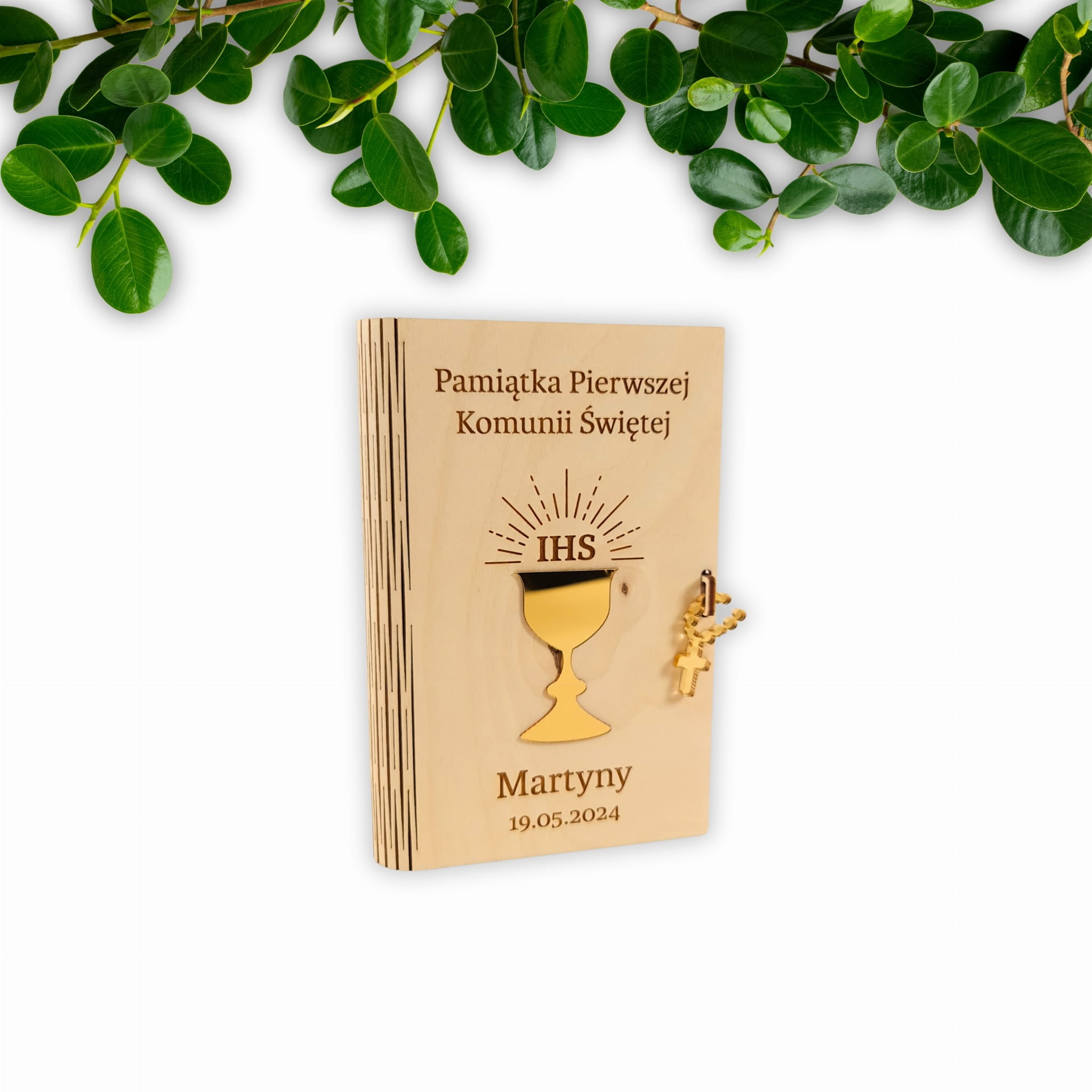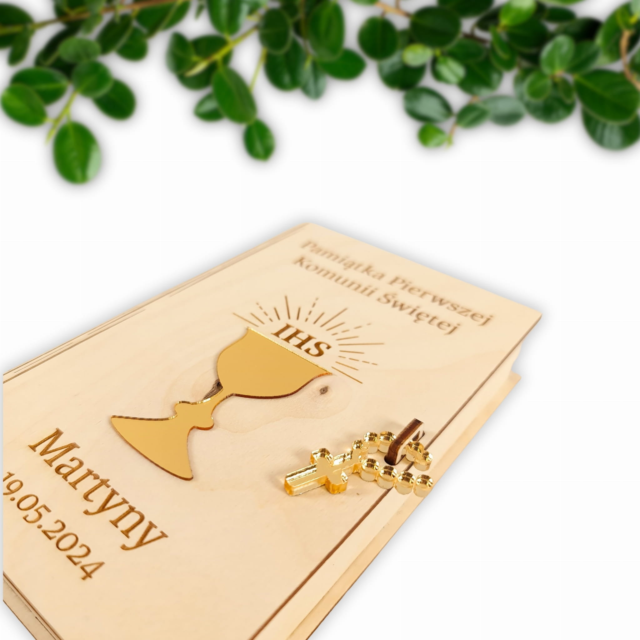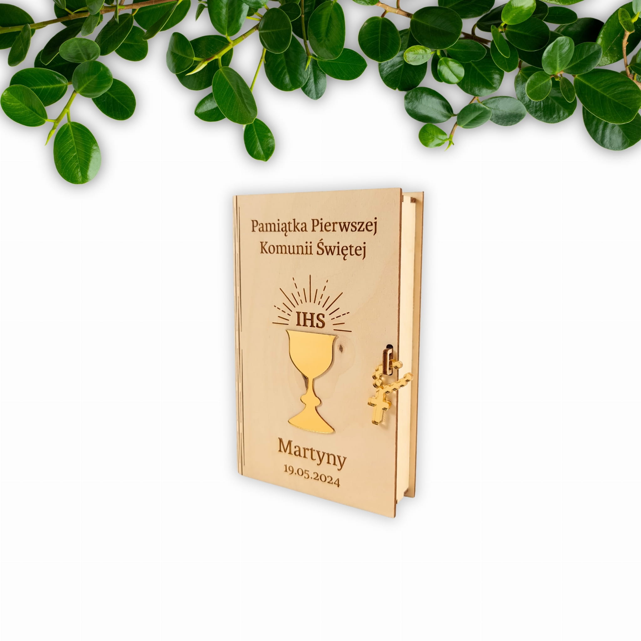 Na przodzie pudelka znajduje się wygrawerowany napis: "Pamiątka Pierwszej Komunii Świętej (Imię dziecka komunijnego oraz data)". Elegancji dodają elementy wycięte ze złotej plexi - Kielich IHS oraz różaniec, który zabezpiecza pudełko przed otwarciem. W środku natomiast znajdują się życzenia, a pod nimi dedykacja od darczyńców. Wnętrze jest również wypełnione miękkim siankiem.