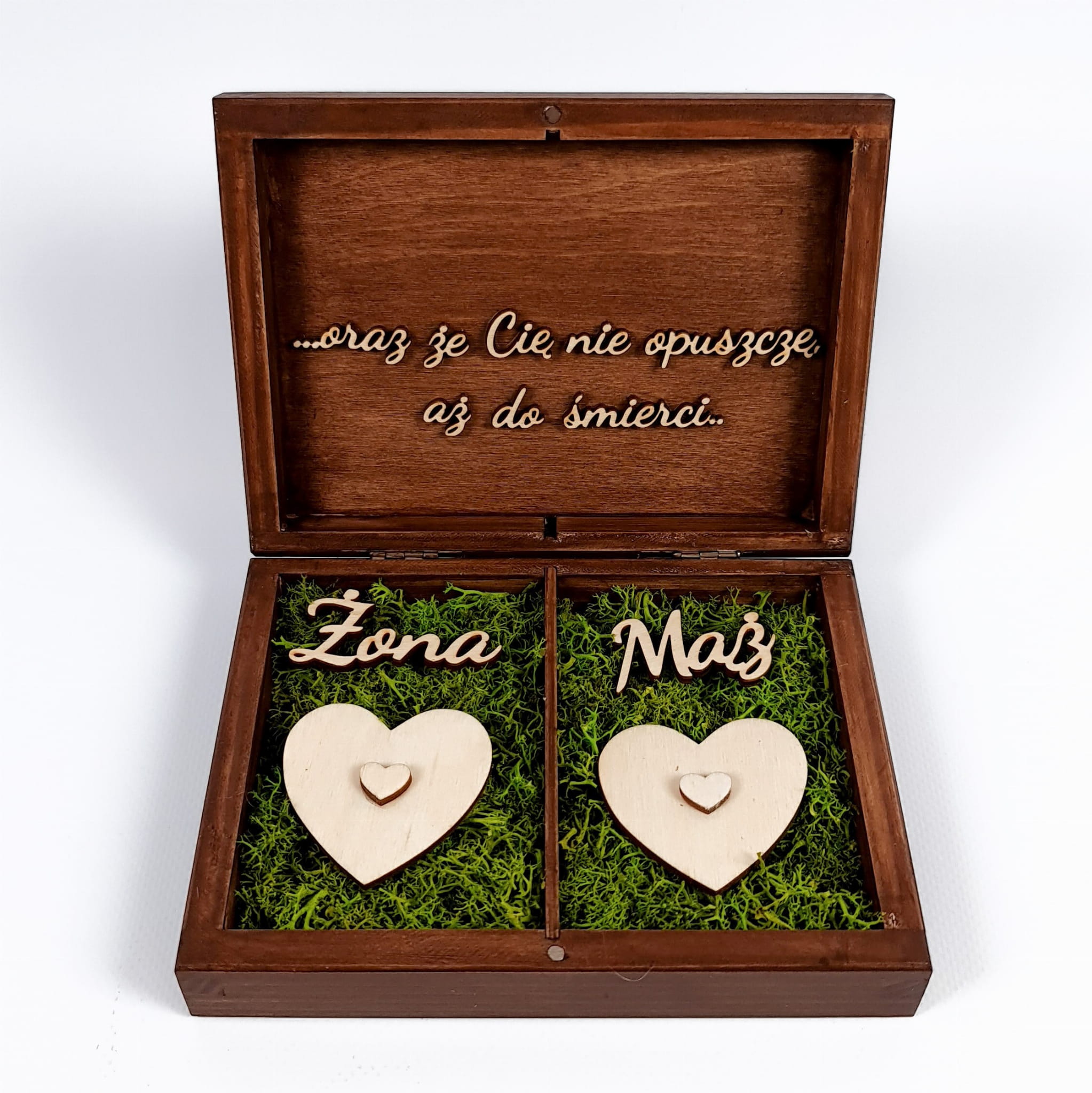 W środku znajduje się zielone wypełnienie z mchu, dające naturalny klimat. Podstawka miejsca na obrączki wykonana jest z mniejszego i większego serduszka, z czego na tym mniejszym można oprzeć obrączki. Na wieku skrzyni znajduję się napis " ...oraz że Cię nie opuszczę aż do śmierci..". Pudełko w środku podzielone jest na pół, by oddzielić obrączkę dla Panny Młodej i Pana Młodego. Ze sklejki zostały wycięte również napisy: "Żona", "Mąż", by rozróżnić z łatwością obrączki.