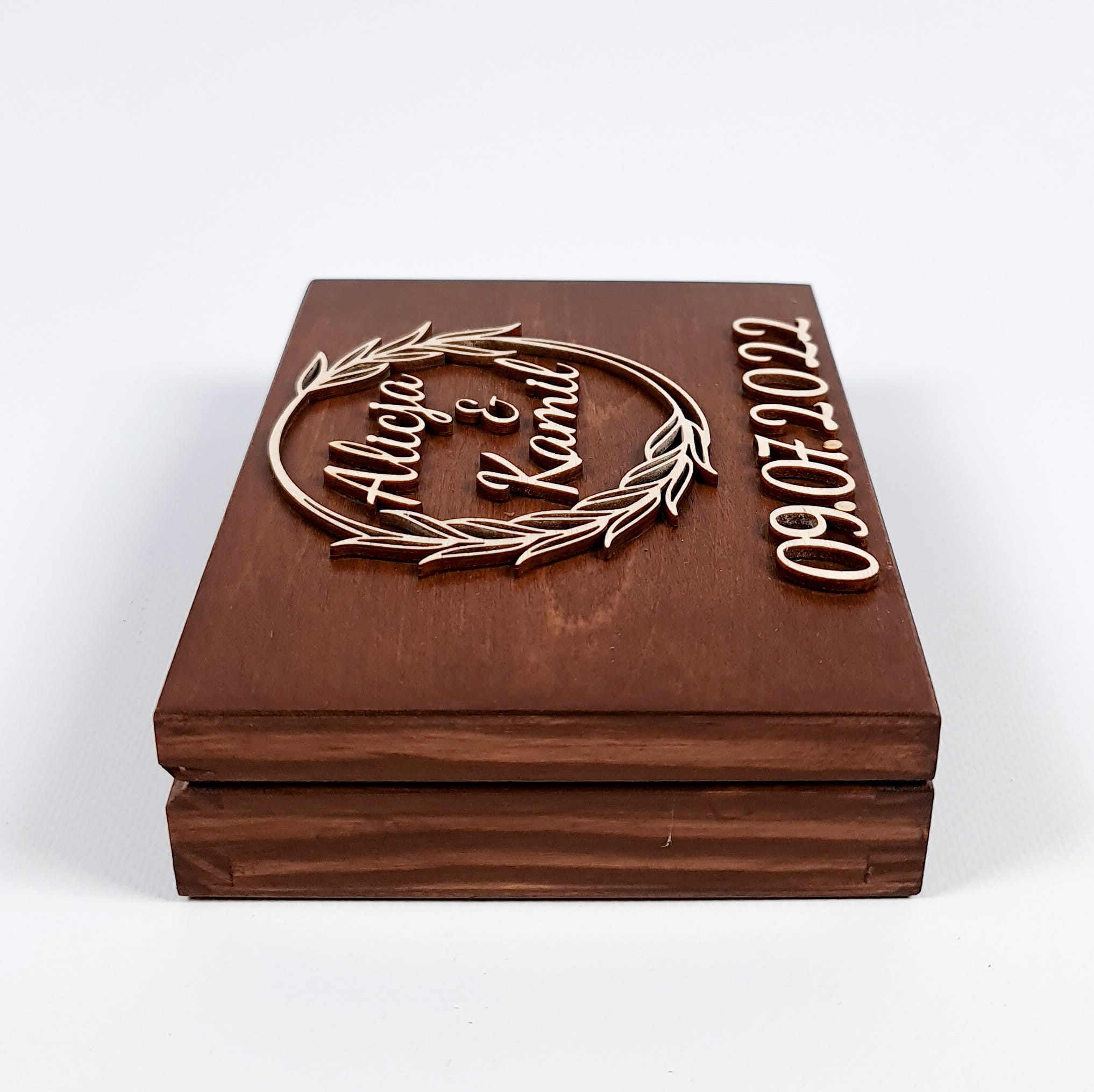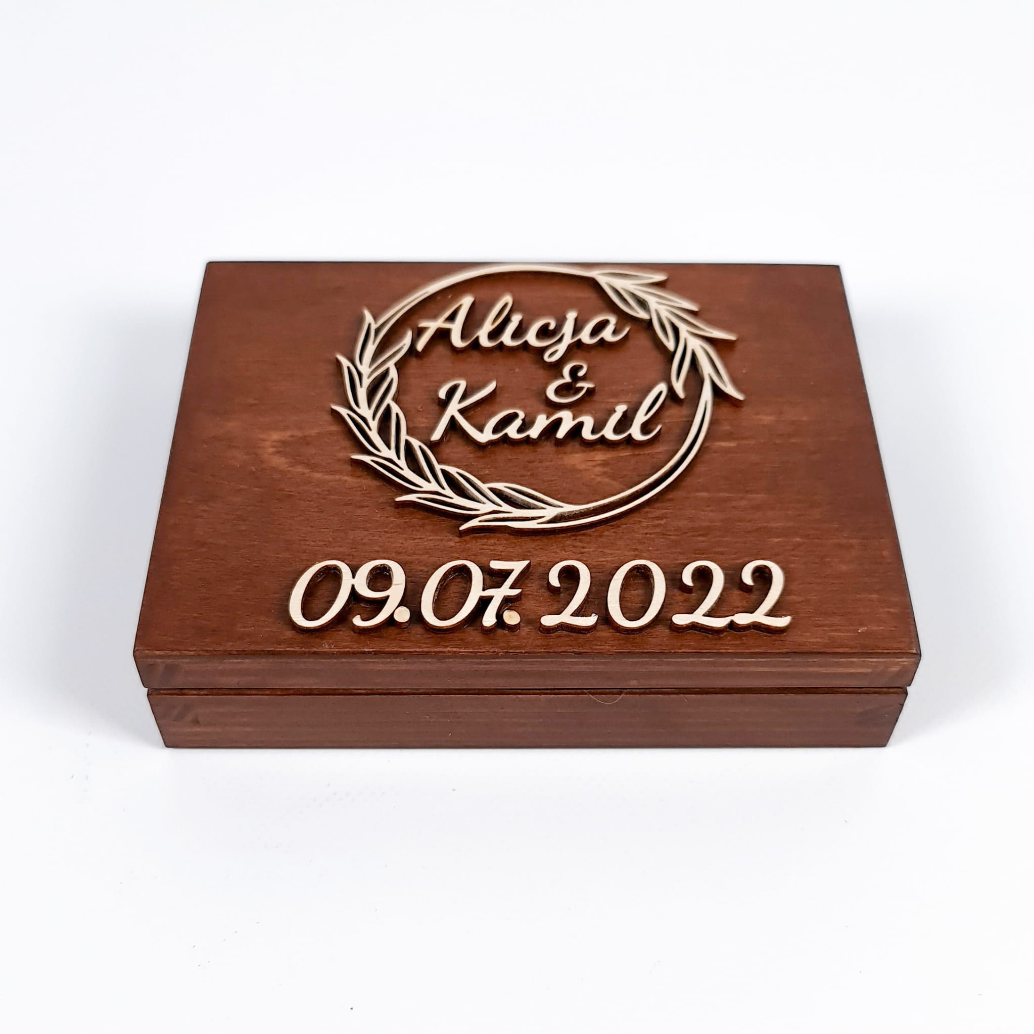 Z przodu pudełka naklejony został piękny i duży motyw listków w okręgu a w nim wyraźne z daleka imiona pary młodej Pod okręgiem znajduje się data ślubu nowożeńców. Obrączki ślubne zasługują na piękne opakowanie, które sprawi, że będą wyglądać jeszcze piękniej.
