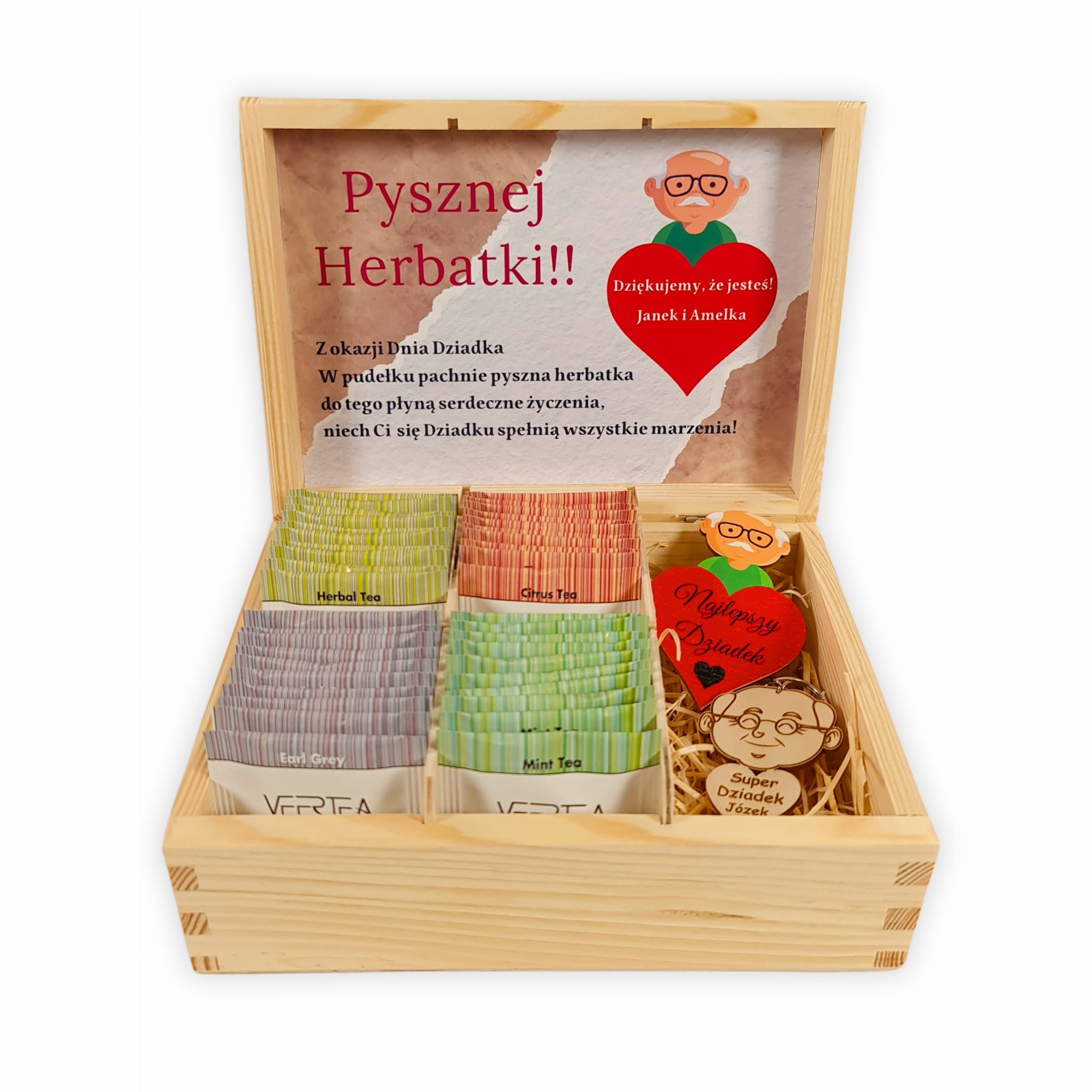 Skrzynka na herbatki wykonana jest bardzo solidnie, a na wieku posiada wygrawerowany lub nadrukowany napis z imieniem dziadka. W środku znajduje się kolorowa grafika z życzeniami z okazji Dnia Dziadka oraz imię/imiona wnuków, którzy je składają. W zestawie znajduje się 40 sztuk esencji herbaty (4 różne smaki po 10 sztuk - pakowane losowo), 1 drewniany brelok oraz kolorowy magnes z napisem "Najlepsi Dziadkowie".
