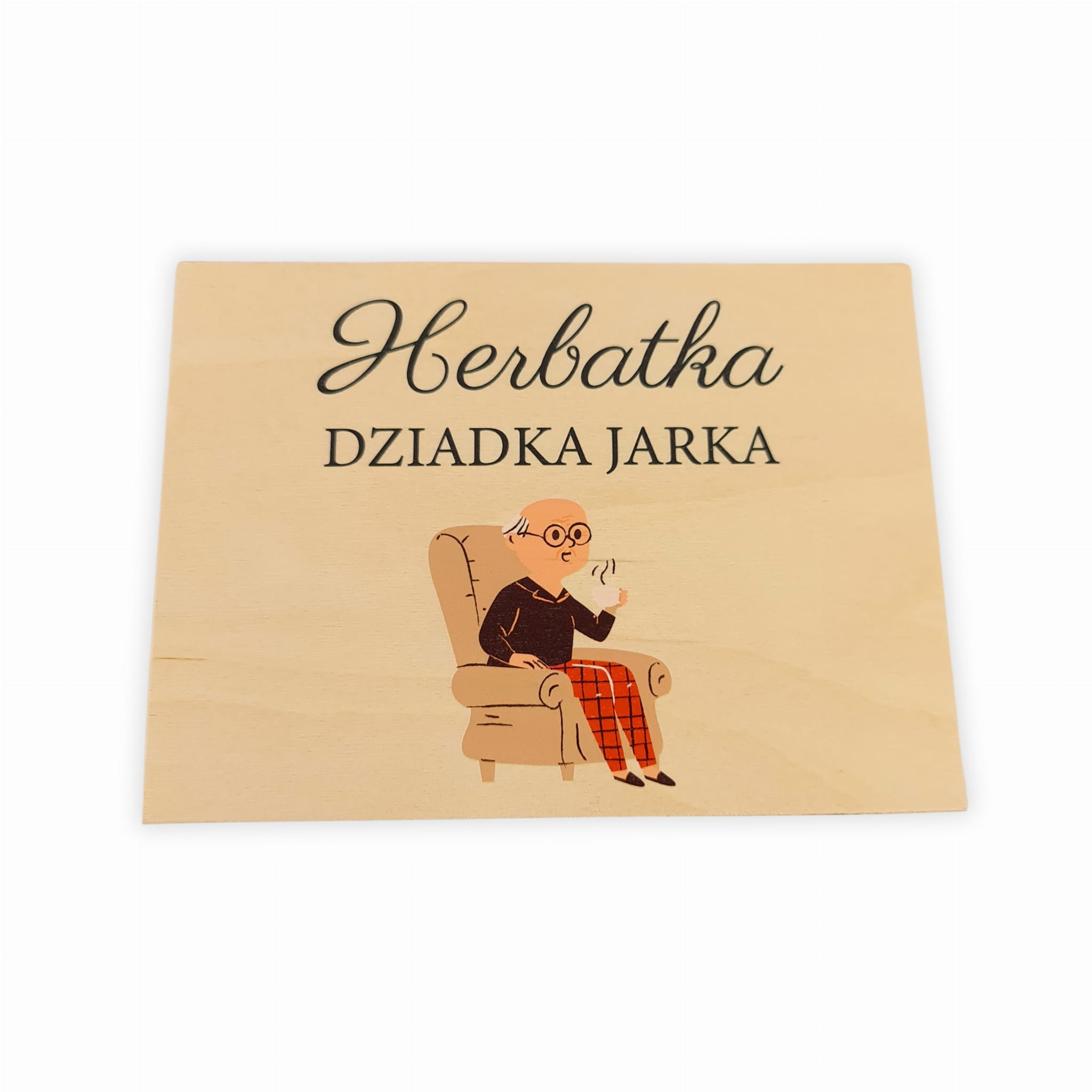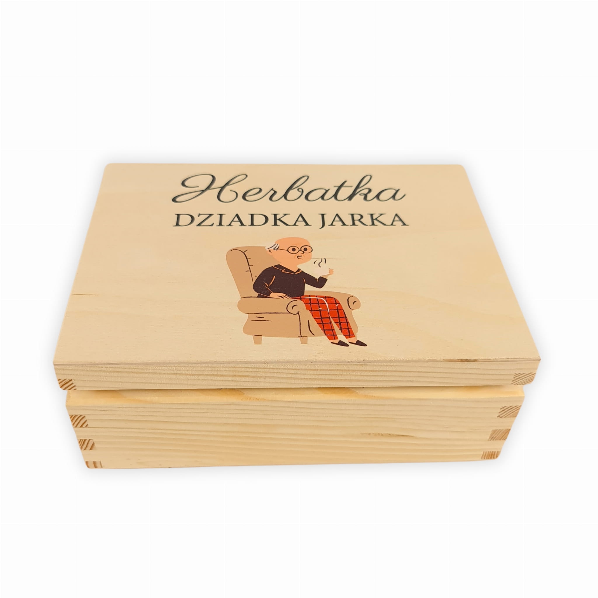 Do wyboru jest skrzynka z kolorowym nadrukiem UV (Herbatka dziadka (imię)) lub skrzynka z grawerem (Pudełko na herbatki dziadka (imię)). Podczas składania zamówienia należy zaznaczyć wybraną opcję.