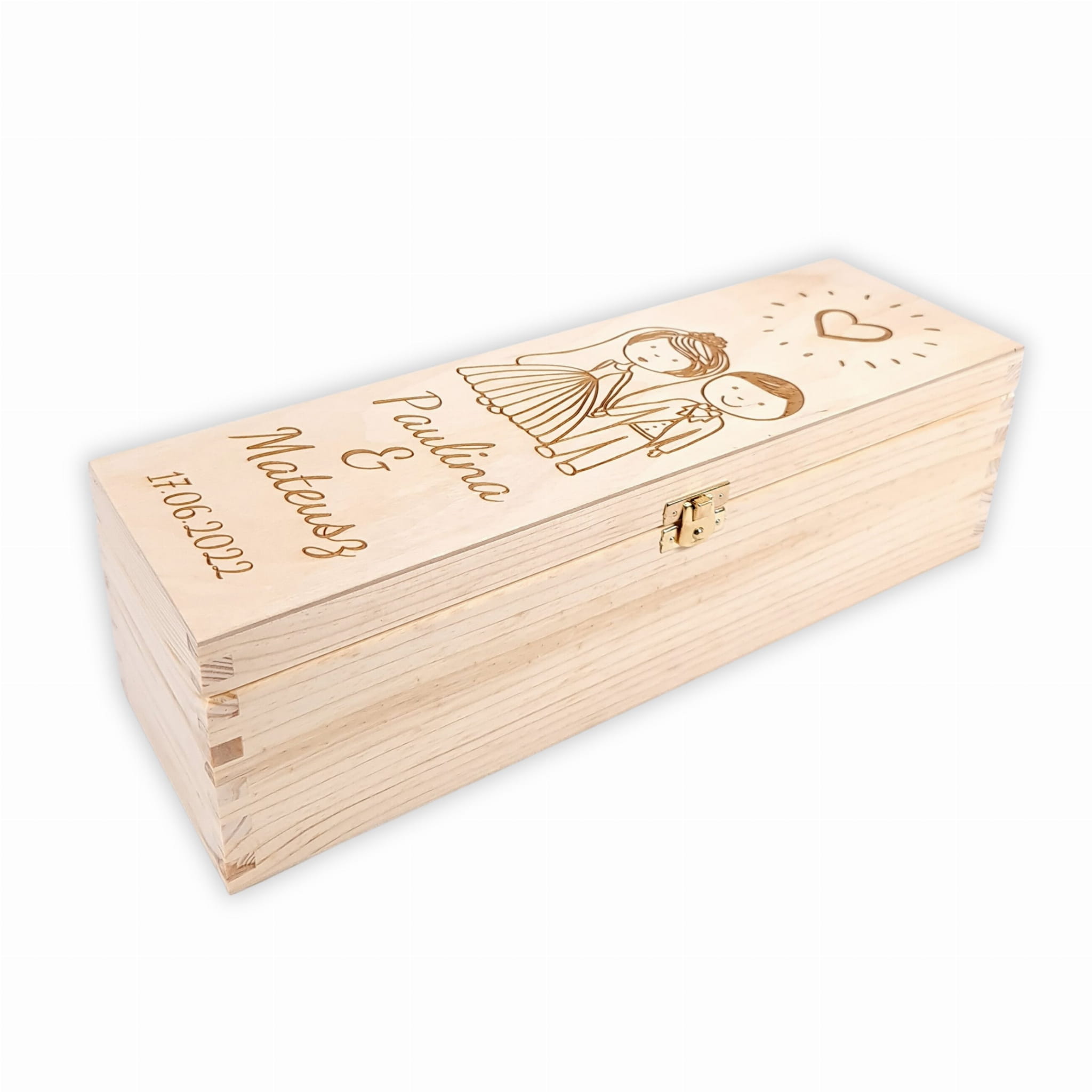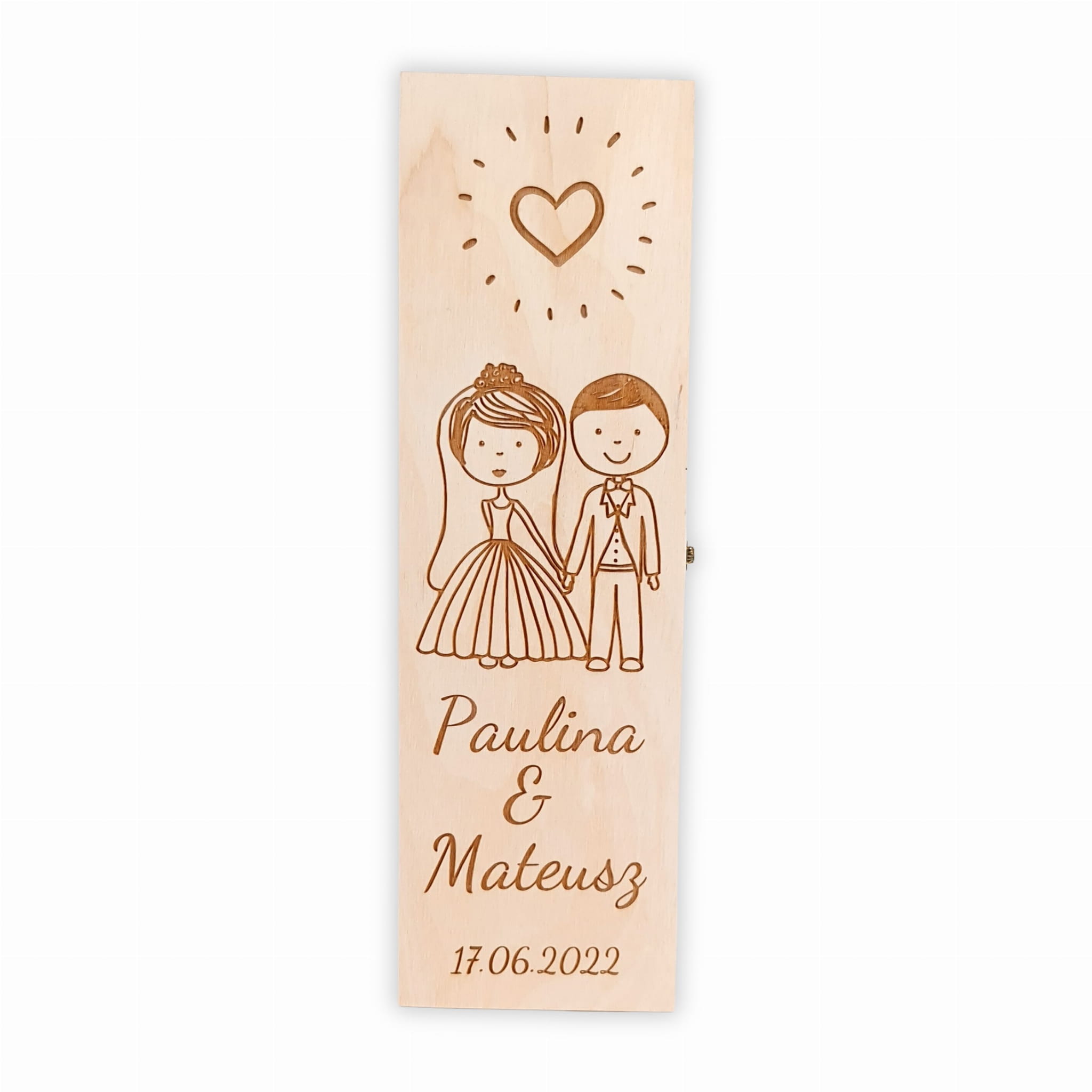 Subtelny grawer na skrzynce przedstawia promieniejące serce oraz grafikę pary młodej trzymającą się za ręce. Pod nimi dekoracyjny grawer imion nowożeńców oraz data tego ważnego dnia.