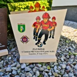 Pamiątkowa statuetka za udział w zawodach Młodzieżowych Drużyn Pożarniczych to wyjątkowy gest docenienia każdego uczestnika. Wykonana z naturalnej sklejki z kolorowym nadrukiem UV, przedstawiającym strażaków w akcji i elementy graficzne związane z turniejem. Całość osadzona na eleganckiej, drewnianej podstawie.
