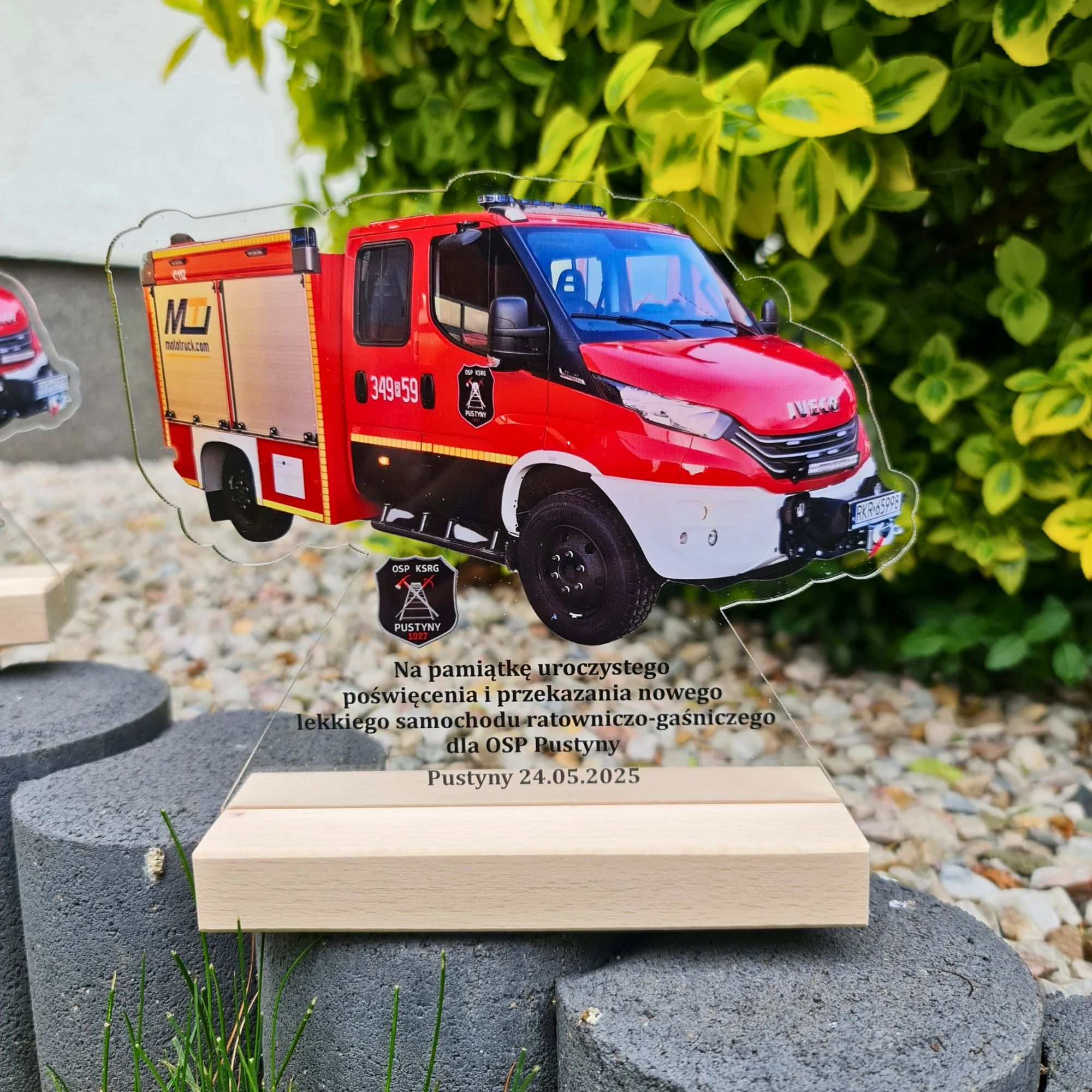 Wyjątkowa statuetka strażacka z wozem ratowniczo-gaśniczym to idealna pamiątka z okazji przekazania, poświęcenia lub zakupu nowego samochodu dla jednostki OSP. Wykonana z przezroczystej plexi, wycięta w kształcie pojazdu i osadzona na drewnianej podstawce. Trwały nadruk UV umożliwia dodanie herbu, daty oraz indywidualnej dedykacji.