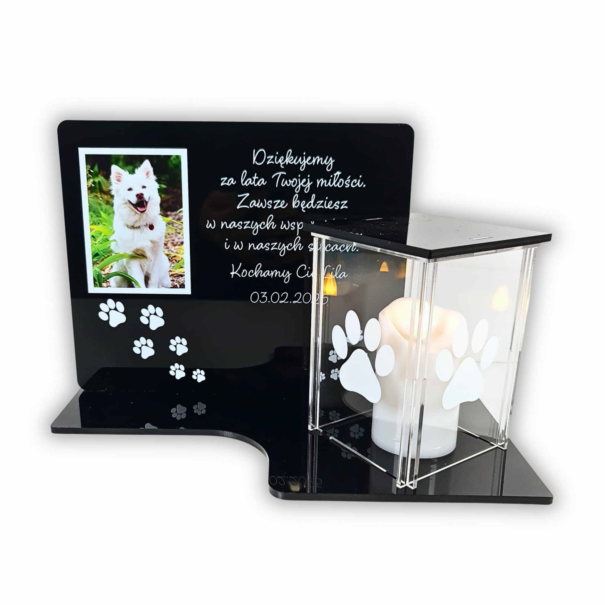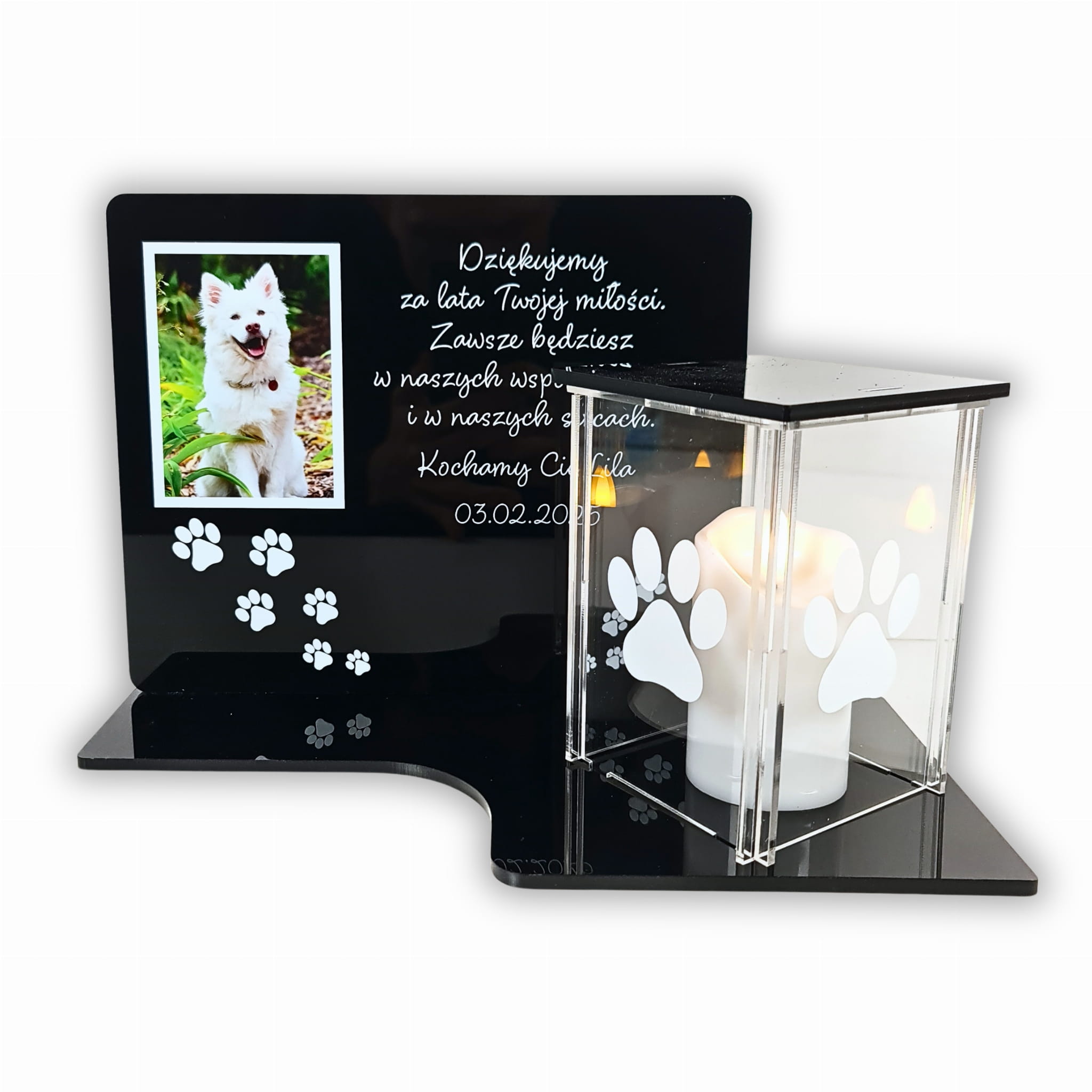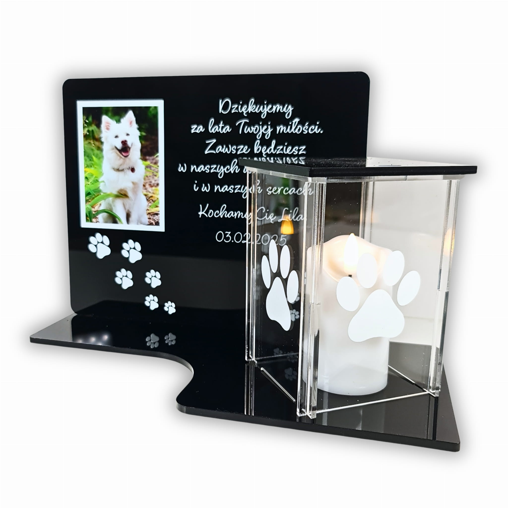 Znicz dla pieska z zdjęciem i łapkami na nagrobek dla psa